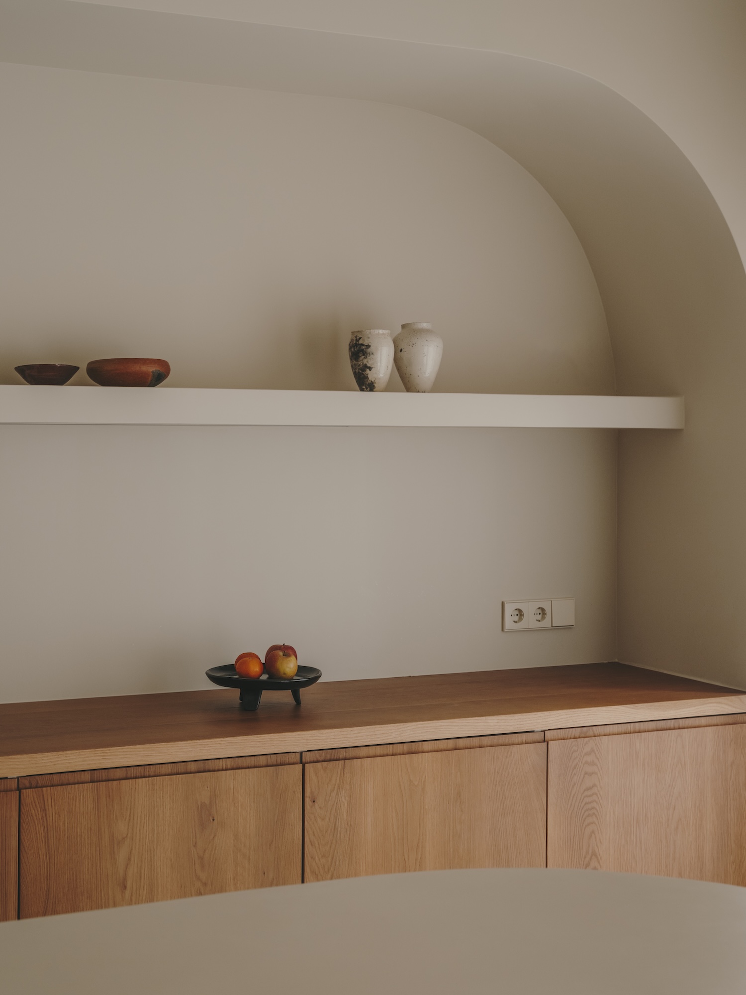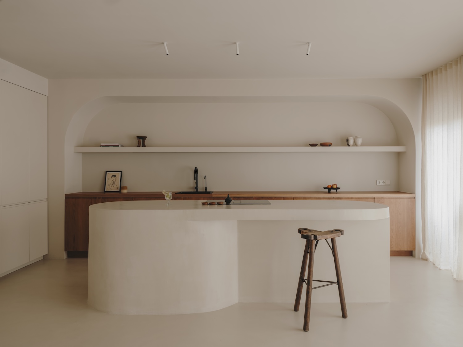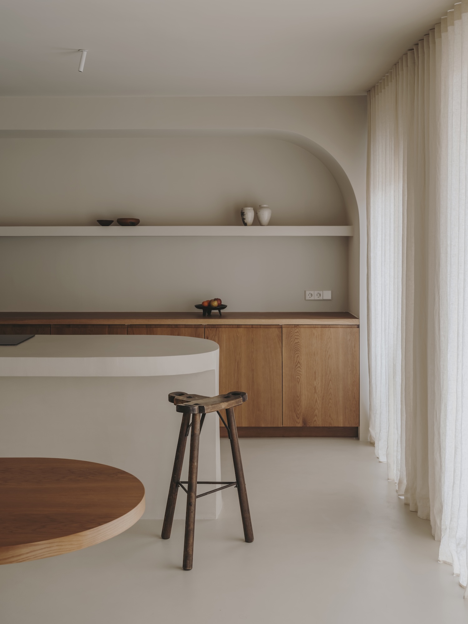 This dialogue extends to the materials themselves. Natural oak in the kitchen introduces organic warmth against the cool continuity of microcement surfaces. The visual language developed here connects to Mediterranean architectural traditions while speaking in decidedly contemporary accents. The built-in concrete sofa – simultaneously furniture and architecture – recalls the sculptural simplicity of vernacular Mediterranean building practices while serving as a foundation for the living area’s careful composition.