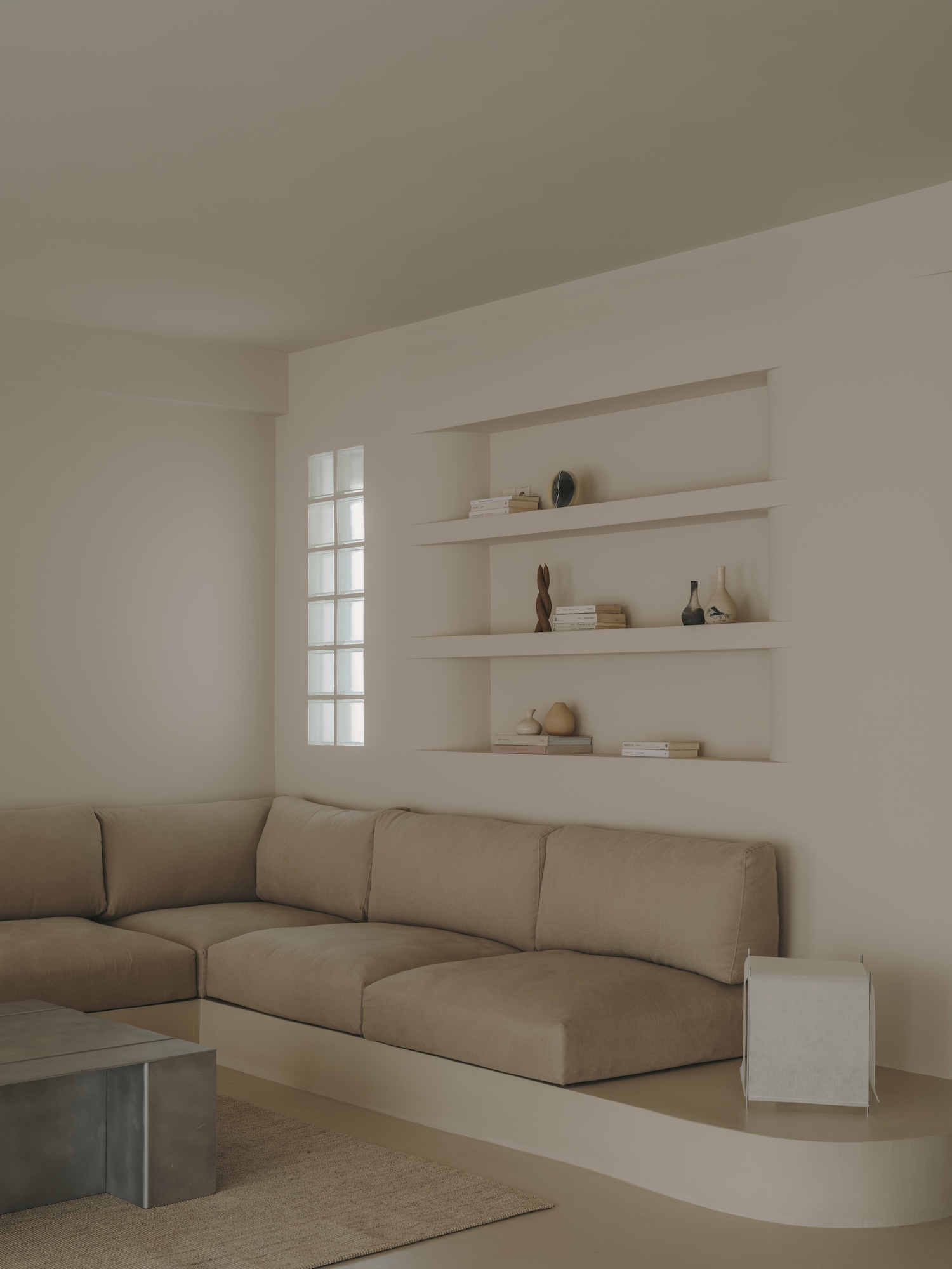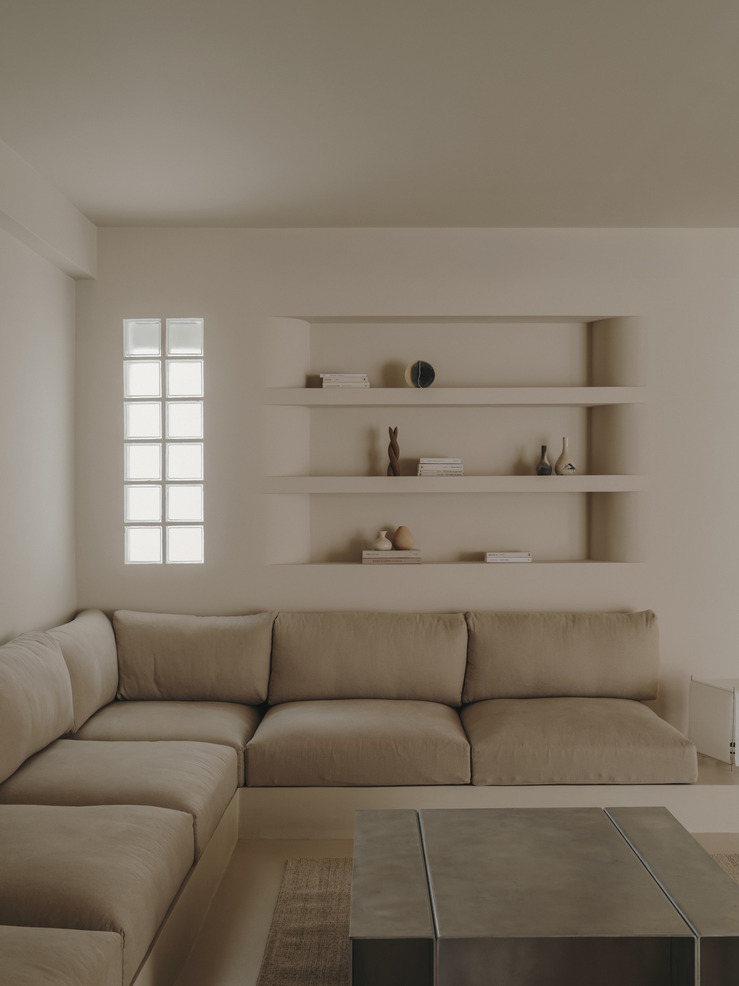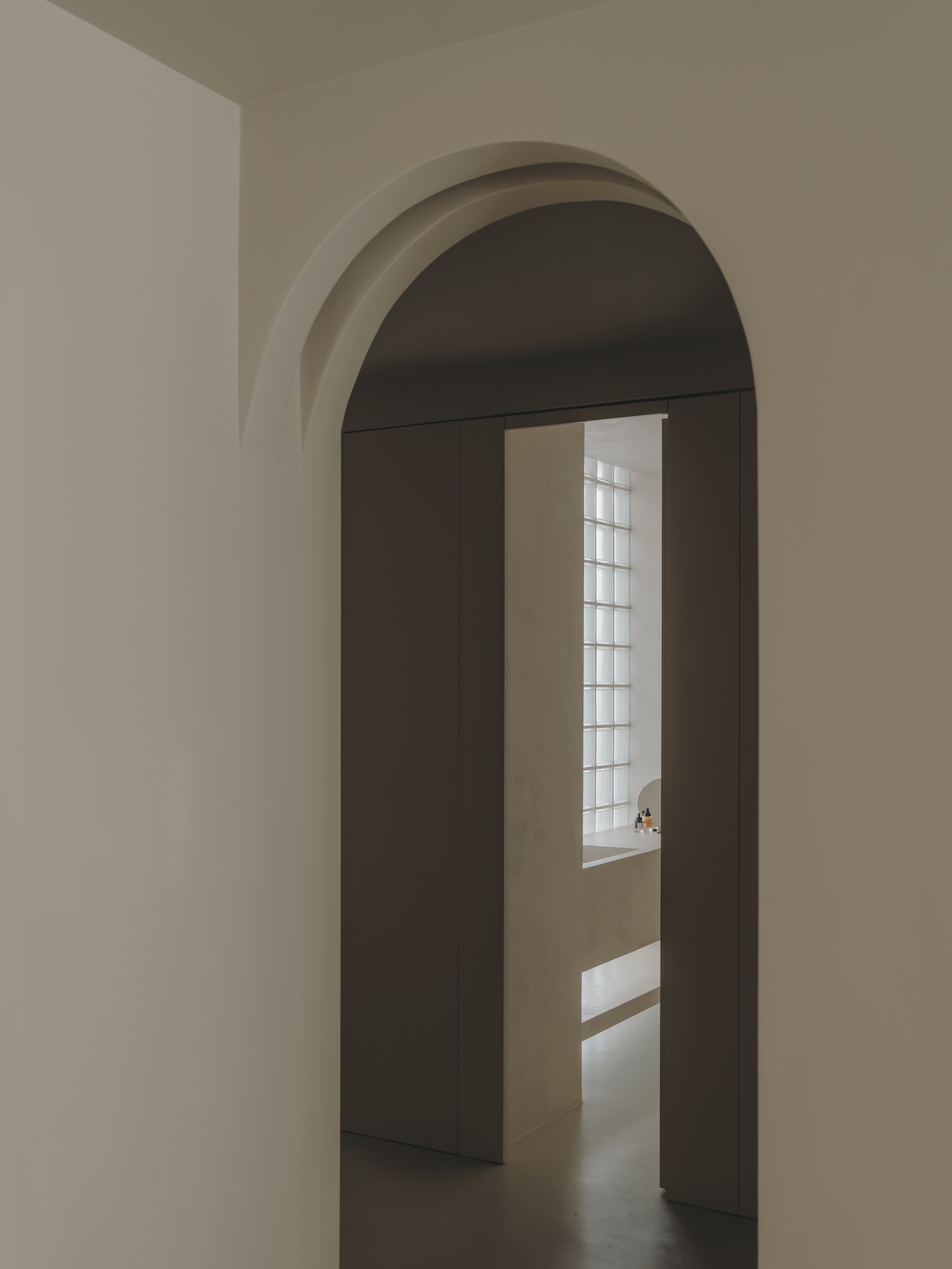 This dialogue extends to the materials themselves. Natural oak in the kitchen introduces organic warmth against the cool continuity of microcement surfaces. The visual language developed here connects to Mediterranean architectural traditions while speaking in decidedly contemporary accents. The built-in concrete sofa – simultaneously furniture and architecture – recalls the sculptural simplicity of vernacular Mediterranean building practices while serving as a foundation for the living area’s careful composition.