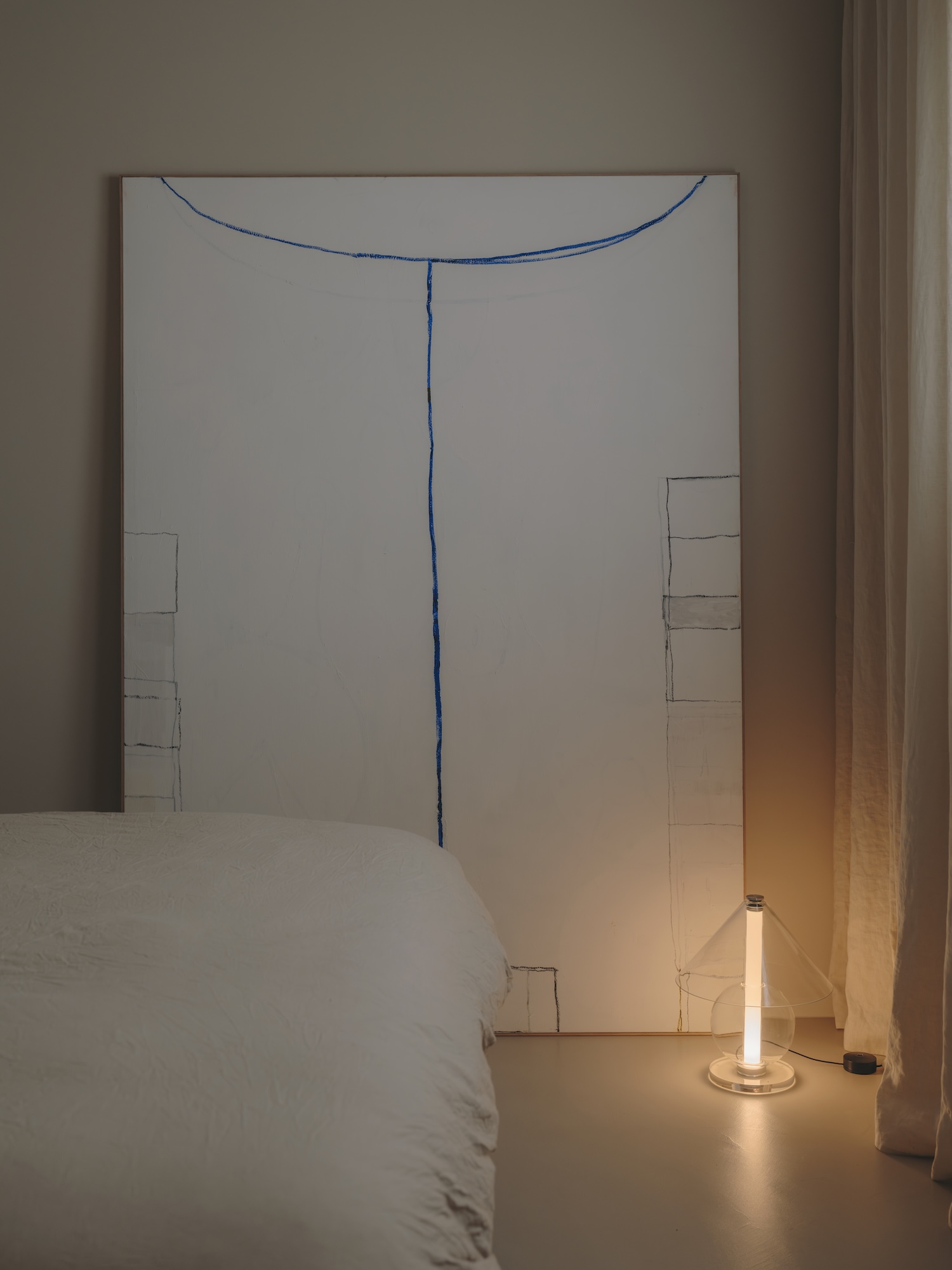 The fusion of collectible design with daily living achieves particular resonance in key moments throughout the apartment. A waxed aluminum coffee table by Paul Coenen (2023) sits in conversation with Philippe Starck’s vintage Dr. Sonderbar Chair, their formal and material differences bridged by a shared sculptural quality. Lighting elements – from Artemide’s Falkland Lamp to the Visa Vis by Davide Groppi – function simultaneously as practical illumination and artistic statement.