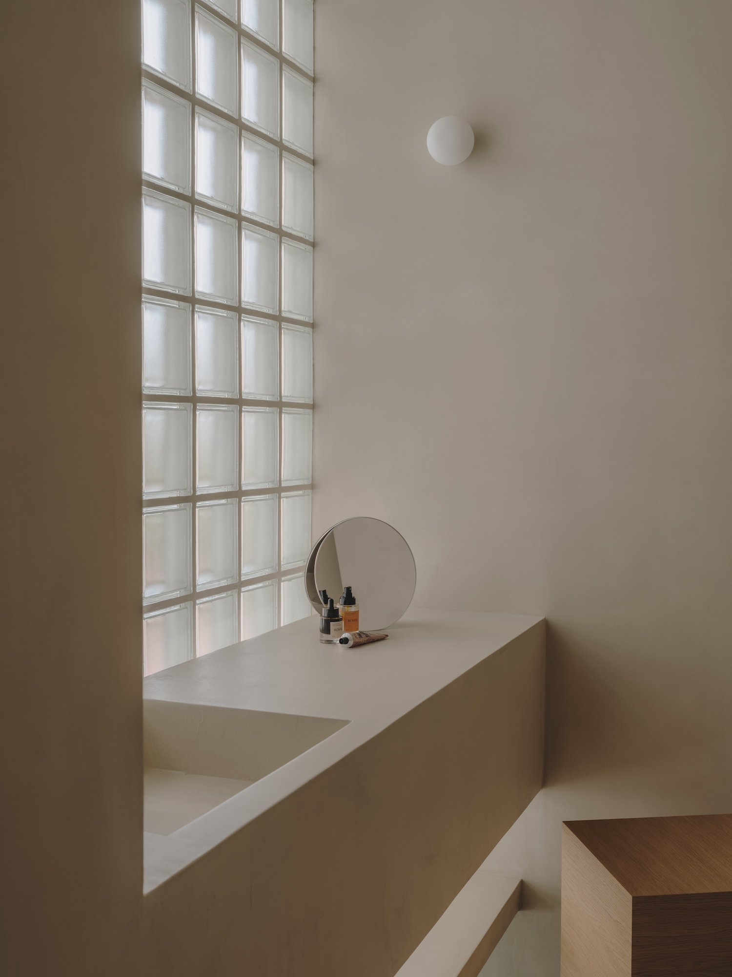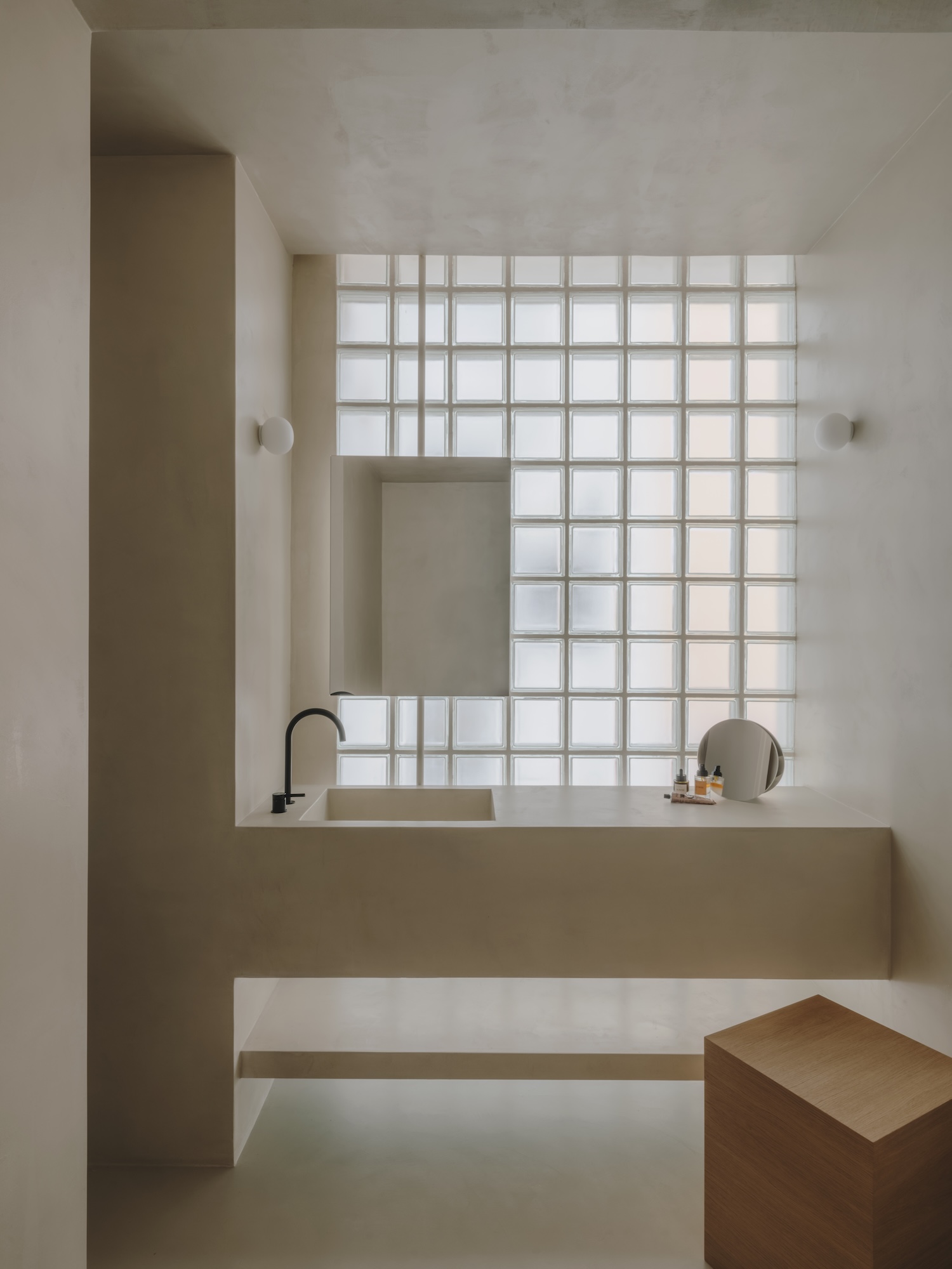 The private spaces maintain this curatorial approach. The bedroom features Mark Bohle’s artwork “pushing things forwards” alongside emerging designers like Cambier Studio, whose L4 Stool blurs boundaries between furniture typologies. The bathroom’s translucent glass brick wall transforms functionality into poetry, allowing diffused light to penetrate while maintaining privacy – a thoughtful reinterpretation of traditional Mediterranean light management techniques.