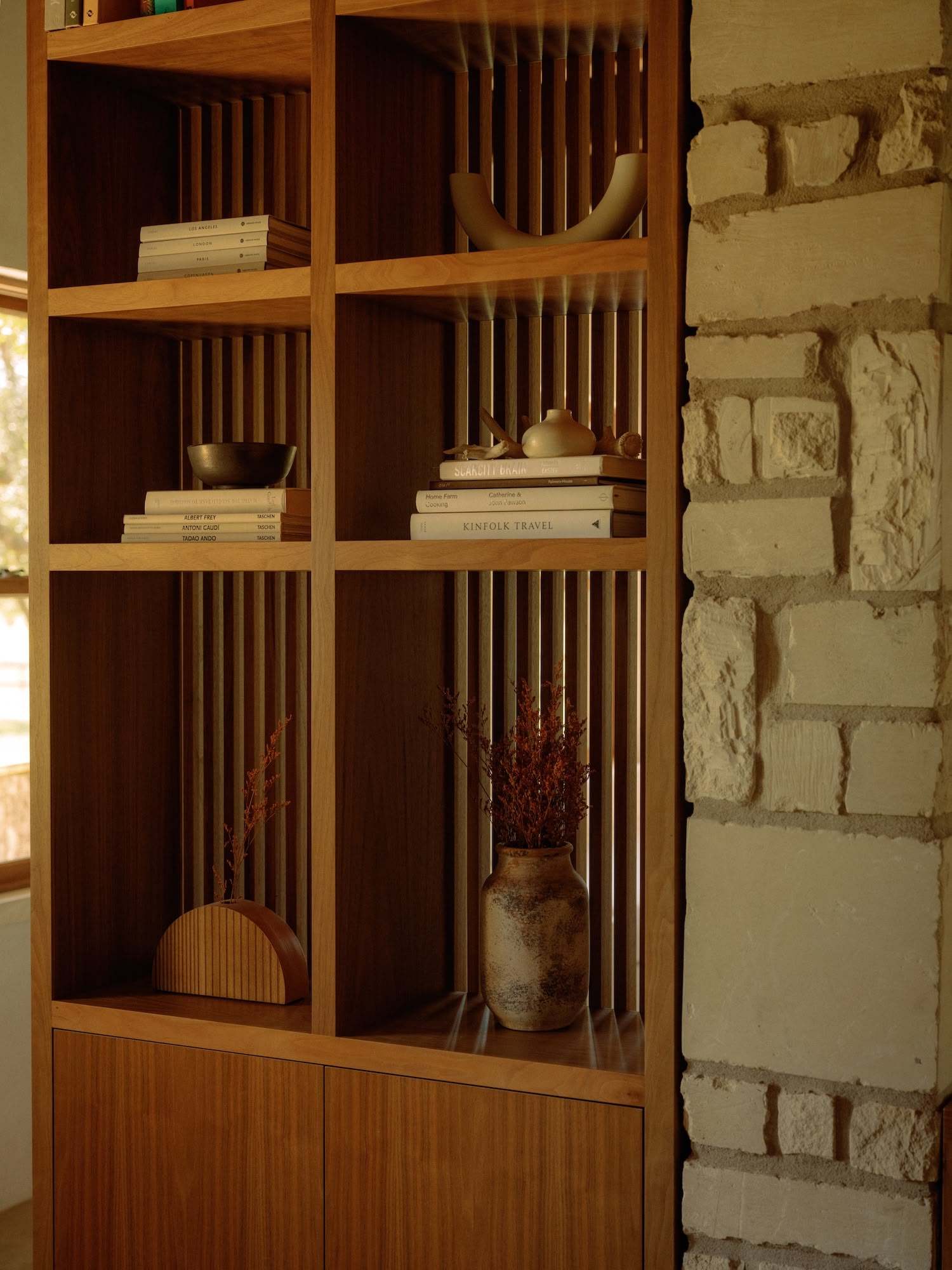 The material palette speaks eloquently of place and identity. The kitchen island’s progression from raw Texas limestone to polished marble and finally warm wood creates what might be called a “material biography” of owner Remi Ishizuka’s journey – from her Japanese-Chinese heritage through California wellness culture to Texas terroir. As Gunawan notes, the collaboration with original builder Michael Contello allowed them to “learn from each other and respect our mutual expertise,” resulting in interventions that honor both innovation and preservation.