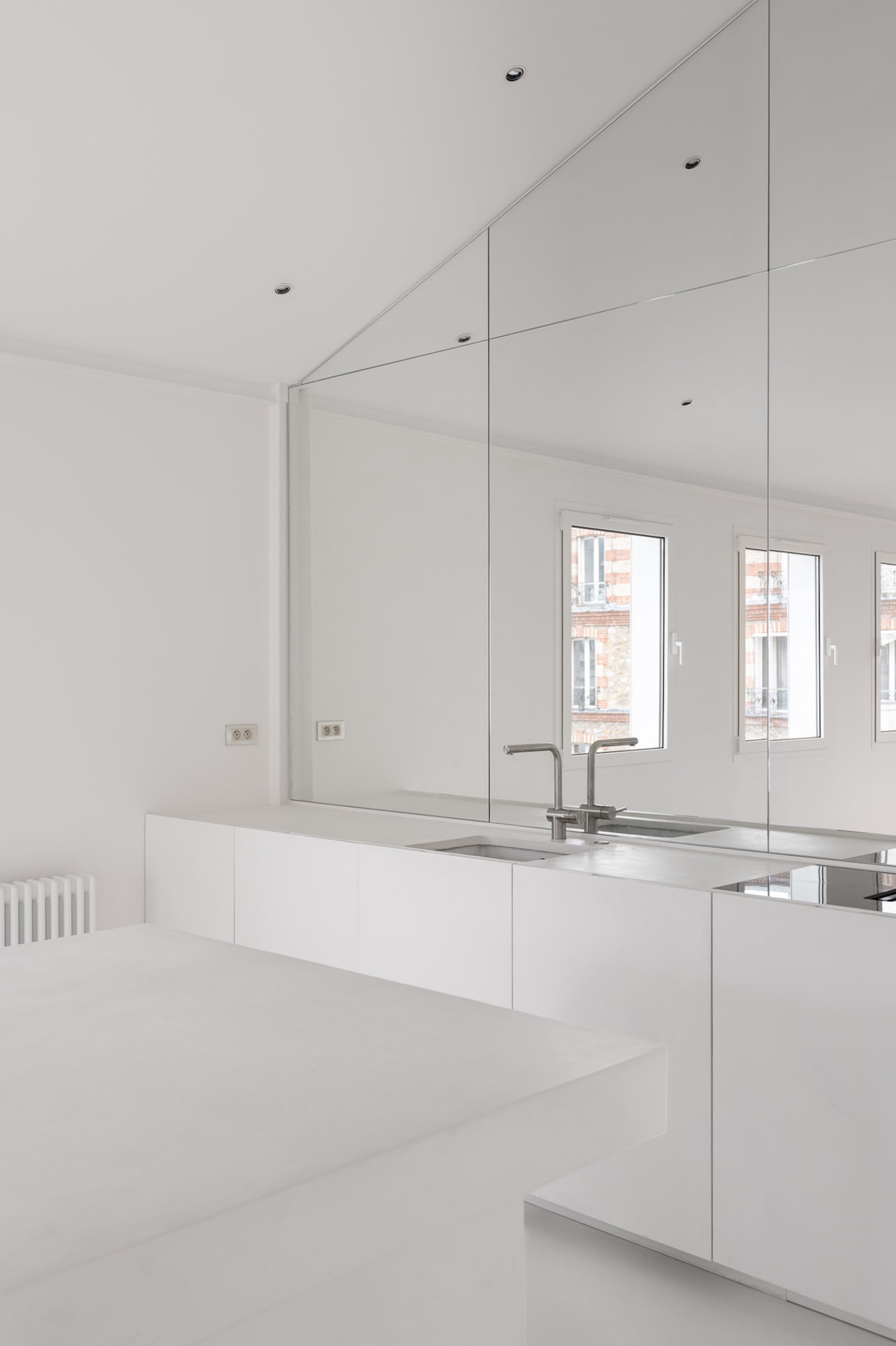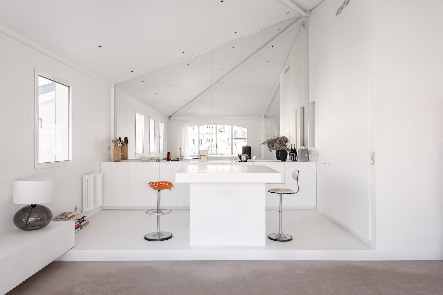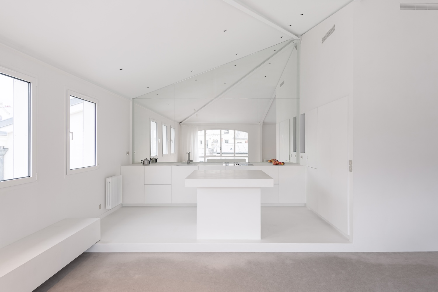 Prix Appartement is a minimalist apartment located in Paris, France, designed by CENT 15 ARCHITECTURE. This 120-square-meter top-floor duplex complete refurbishment for family with two children demonstrates how parental volume insertion can organize spatial relationships establishing clear borders between communal and private zones. Photographer Christophe Caudroy documents the project showing how natural light reflects on light-colored materials throughout the residence.