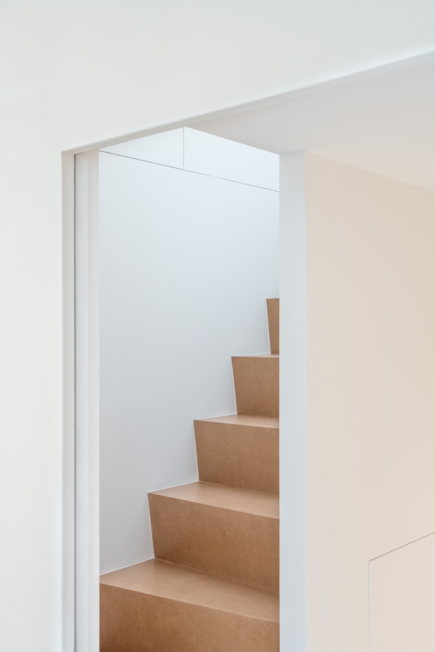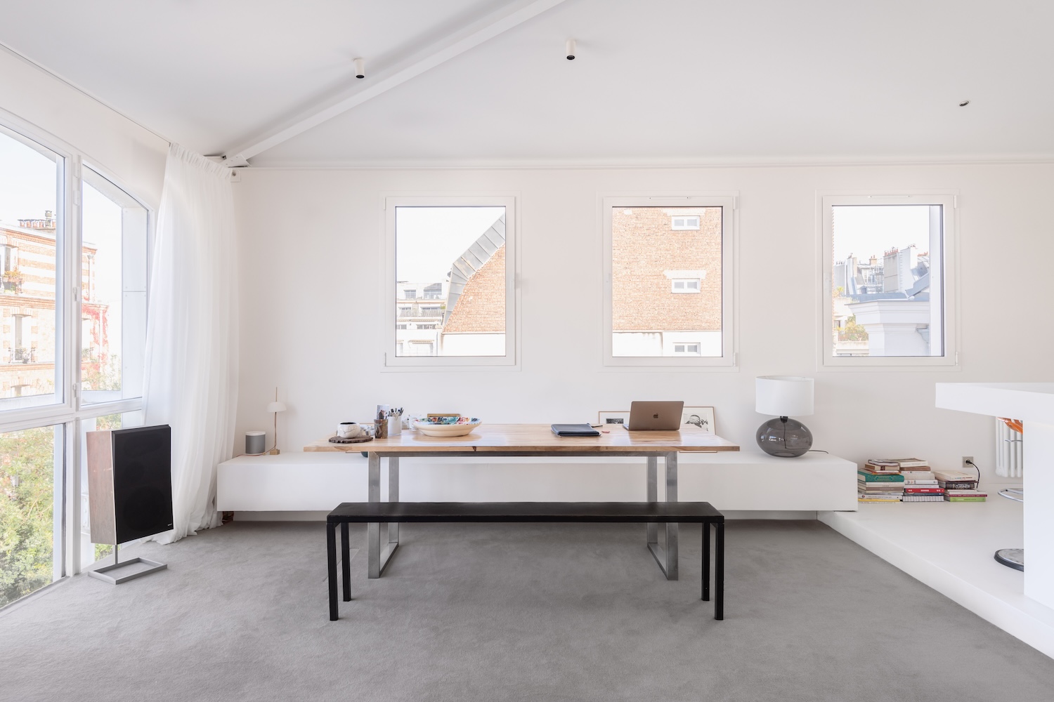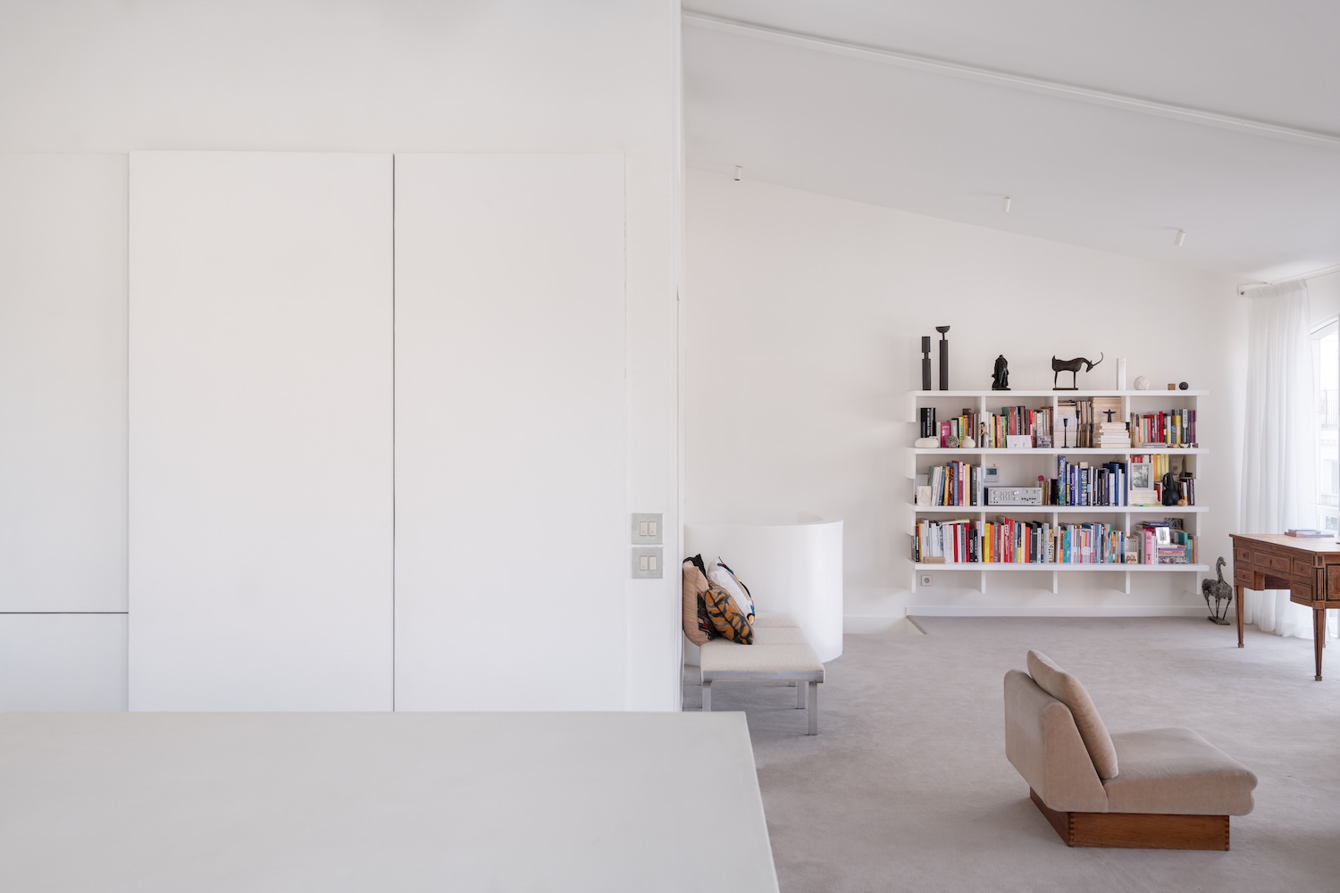 Prix Appartement is a minimalist apartment located in Paris, France, designed by CENT 15 ARCHITECTURE. This 120-square-meter top-floor duplex complete refurbishment for family with two children demonstrates how parental volume insertion can organize spatial relationships establishing clear borders between communal and private zones. Photographer Christophe Caudroy documents the project showing how natural light reflects on light-colored materials throughout the residence.