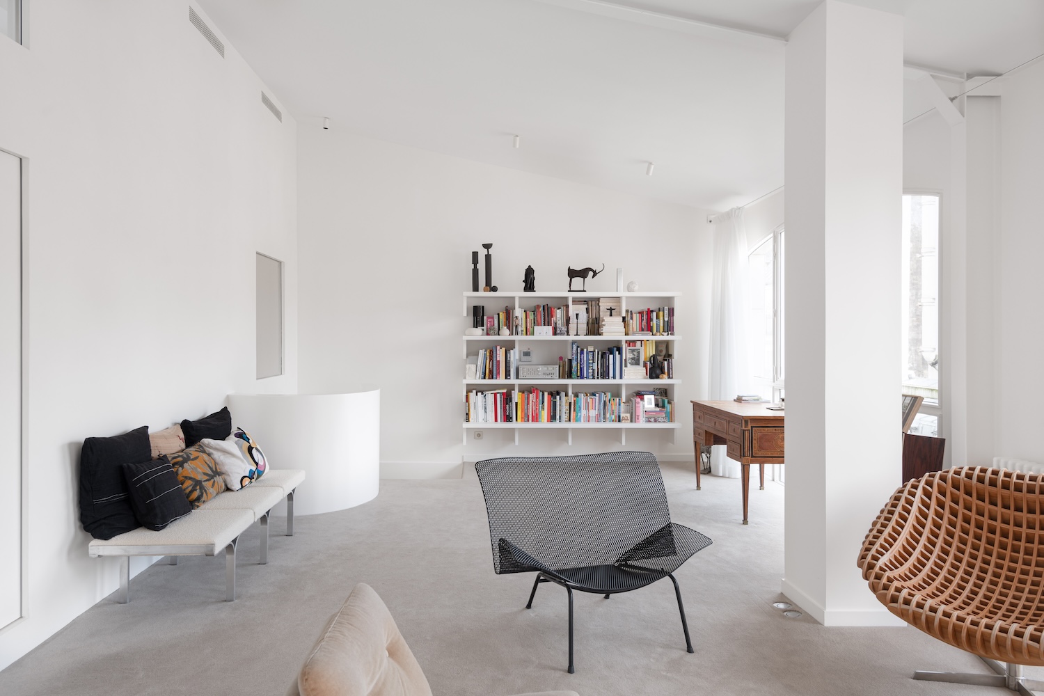 Living room space definition occurs through parental volume position with discreet kitchen hiding behind this volume in dining room continuity. Large bench sits dining table at space back while counter located at kitchen entrance offers variety of uses, demonstrating how multifunctional elements can maximize spatial efficiency within compact Parisian apartment footprints. The kitchen concealment strategy maintains living area visual clarity preventing appliance and storage visibility from fragmenting open-plan perception.