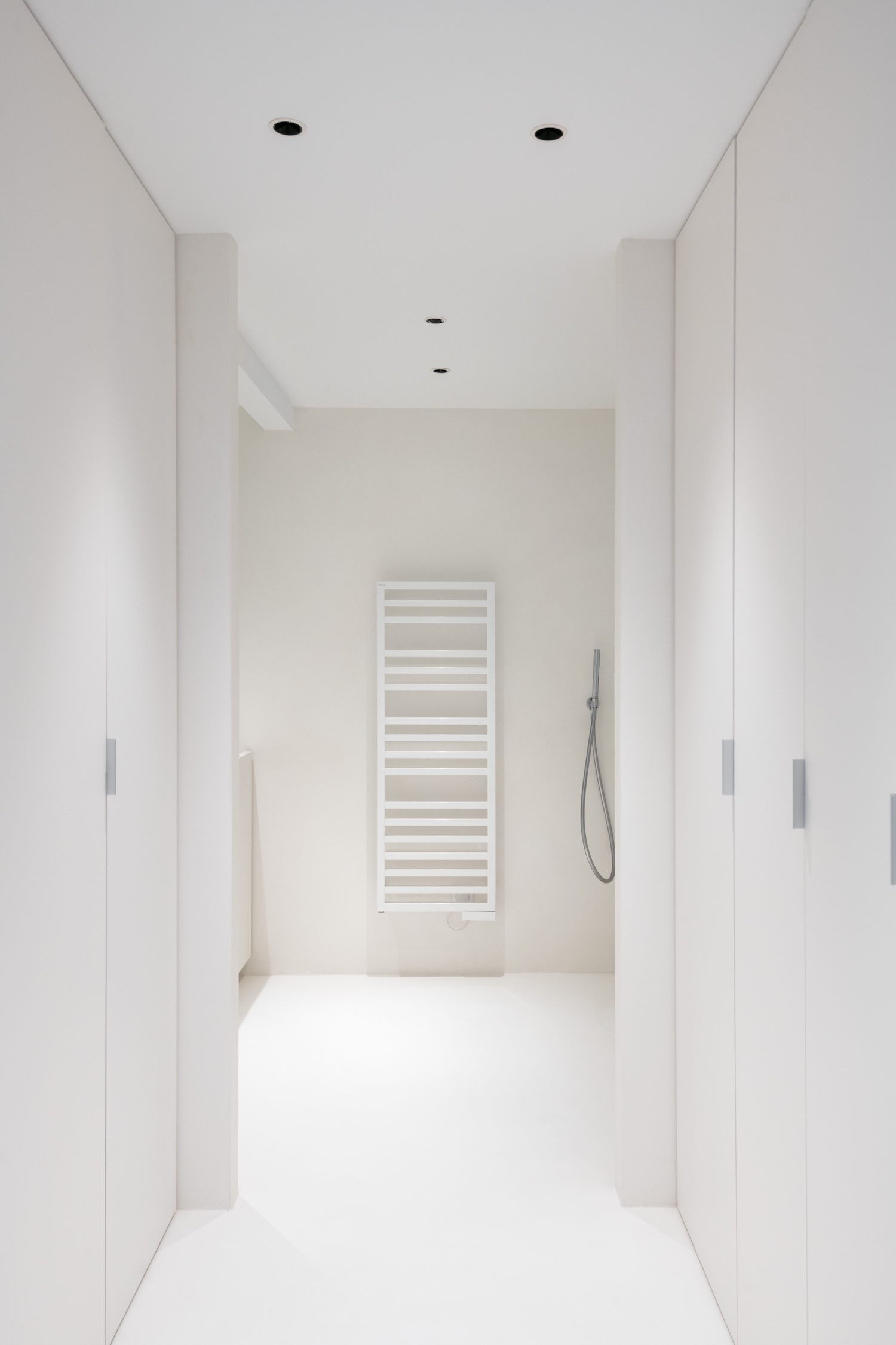 Sober architectural language enhances place’s spatial qualities with omnipresent natural light reflecting on light-colored materials including carpet covering floor while walls like custom-made furniture set receive waxed concrete covering. This material restraint demonstrates how limited palette can create spatial coherence where every surface contributes unified aesthetic rather than competing for attention through varied treatments. The waxed concrete application on walls and furniture establishes continuity between architectural and furnishing elements.