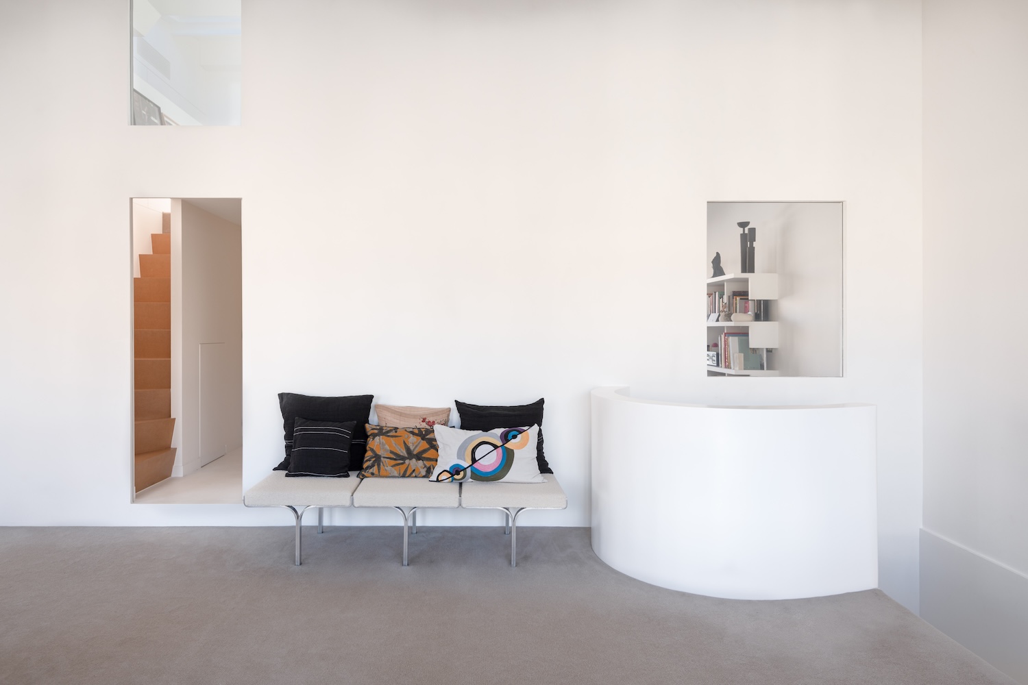 Background large imposing volume encloses parents’ universe including dressing room and bathroom with small staircase leading to top-floor bedroom under roof. This volume conceived as house within apartment with large facade pierced by two small one-way mirrored windows creates clear border with living spaces, demonstrating bold architectural gesture where substantial insertion establishes spatial hierarchy. The one-way mirrored windows provide privacy while maintaining visual supervision from parental suite toward communal areas.