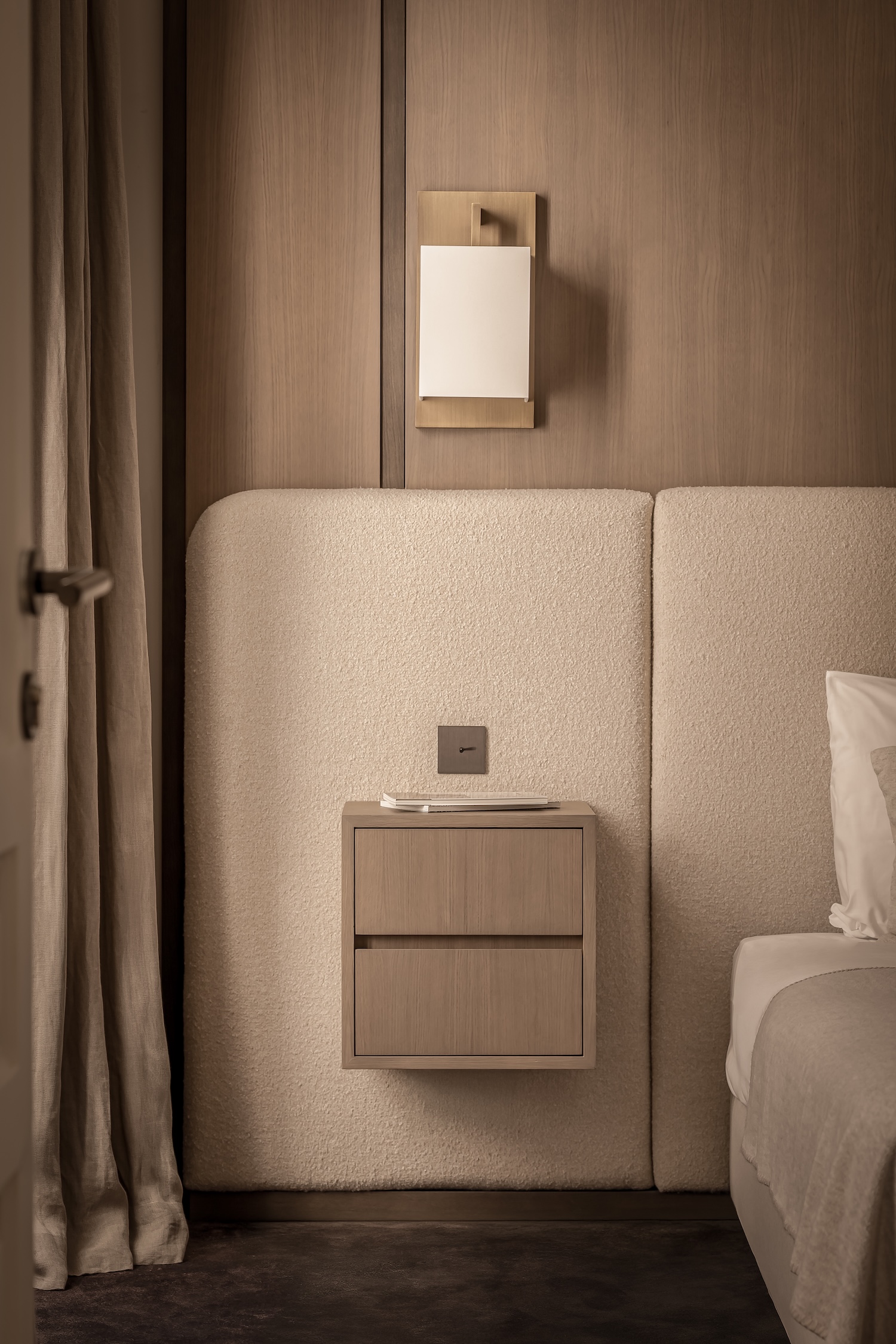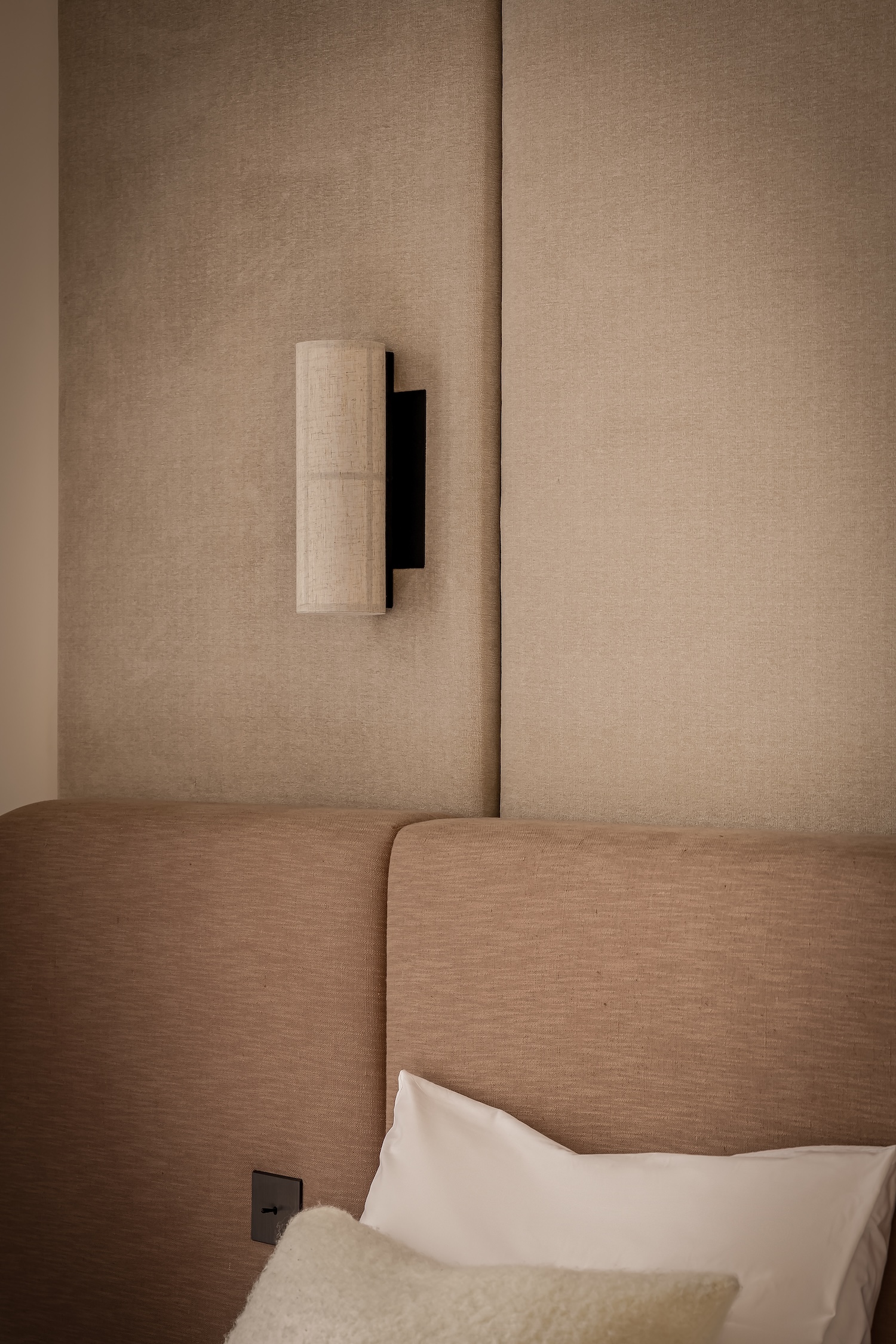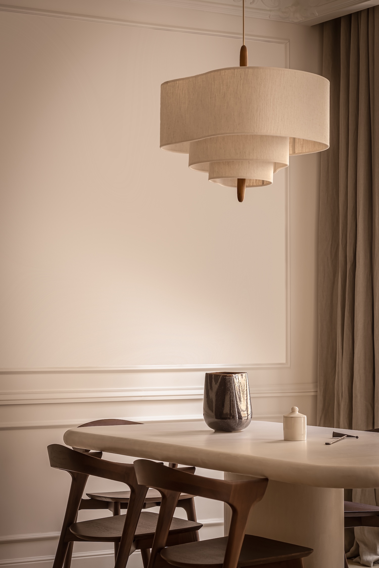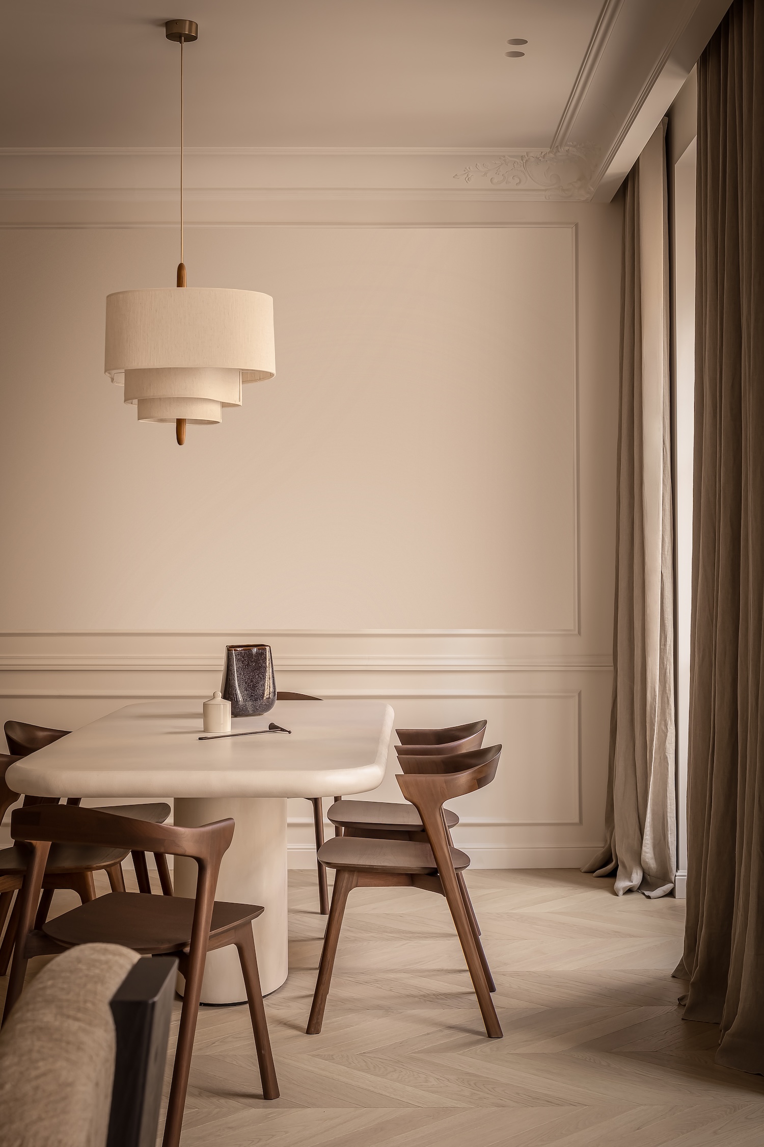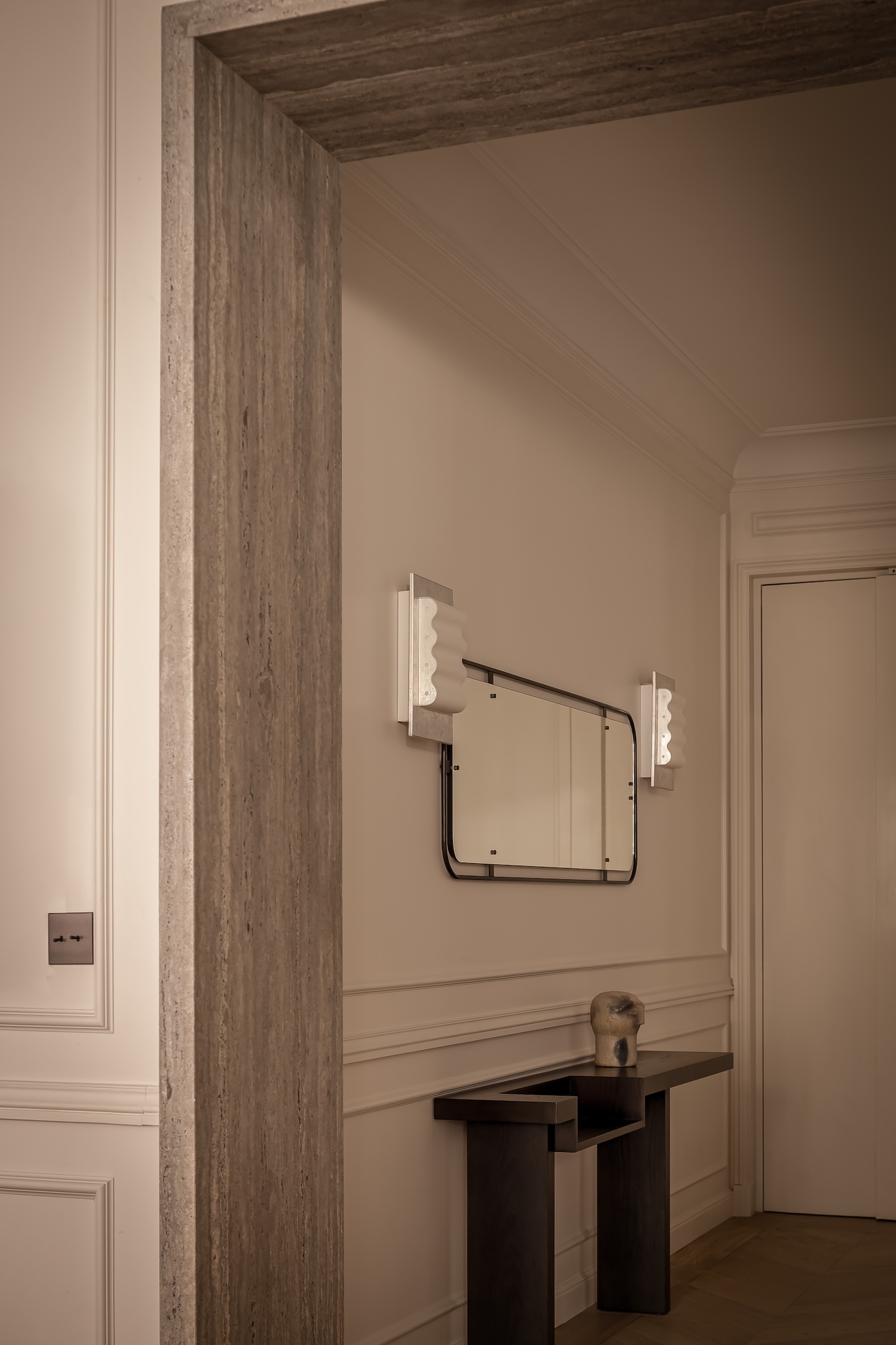 Madeleine is a minimalist apartment located in Paris, France, designed by Katz Studio. This 8th arrondissement Haussmannian residence demonstrates how classic architectural lines can be highlighted through fluid circulation leading naturally to main living areas while custom furnishings establish spatial character. From the entry, the tone is set through a black wood console structuring the space, paired with a Gabrielle bench in cream and mustard tones bringing warm graphic notes. Frame sconces by Violaine d’Harcourt cast soft light framing a large Audo Copenhagen mirror that visually expands the space while emphasizing verticality.
