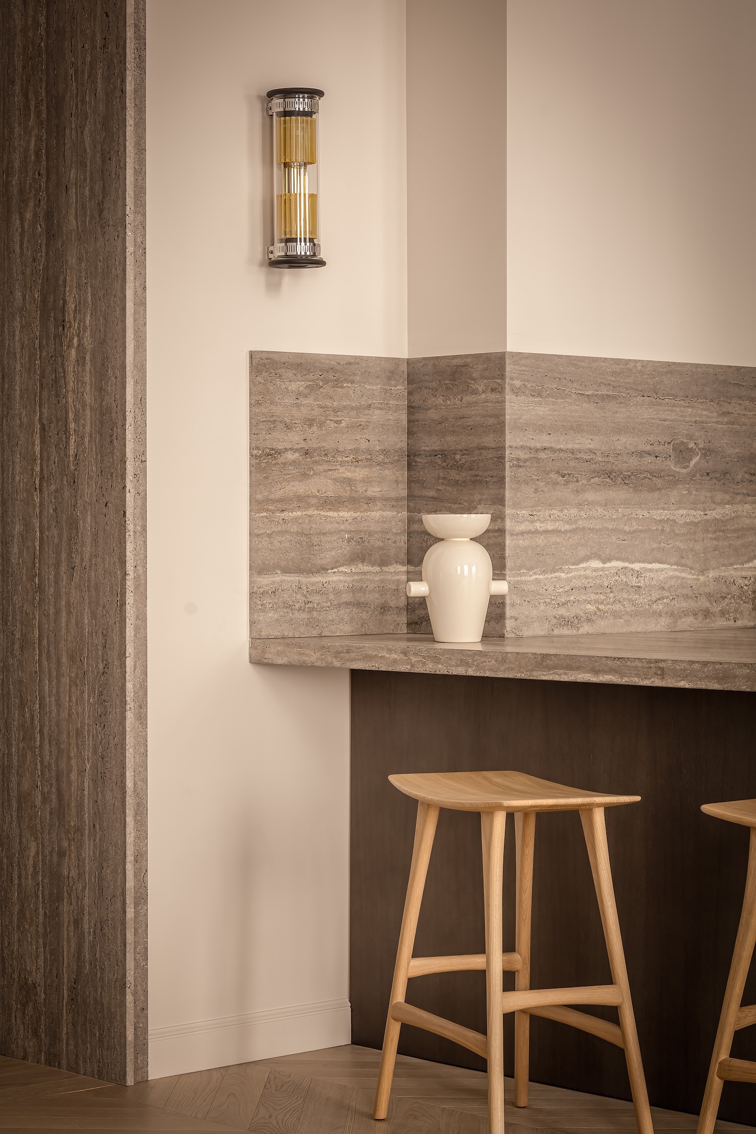 The kitchen plays on contrast through travertine countertop with mineral hues paired with Pierre Frey wallpaper adding rhythm and texture. A DCW wall light illuminates the preparation area while two Ethnicraft stools punctuate the central island, demonstrating how single material accent through wallpaper can establish visual interest within otherwise restrained kitchen design. The travertine selection provides durable work surface while establishing luxury through natural stone application rather than engineered alternatives.