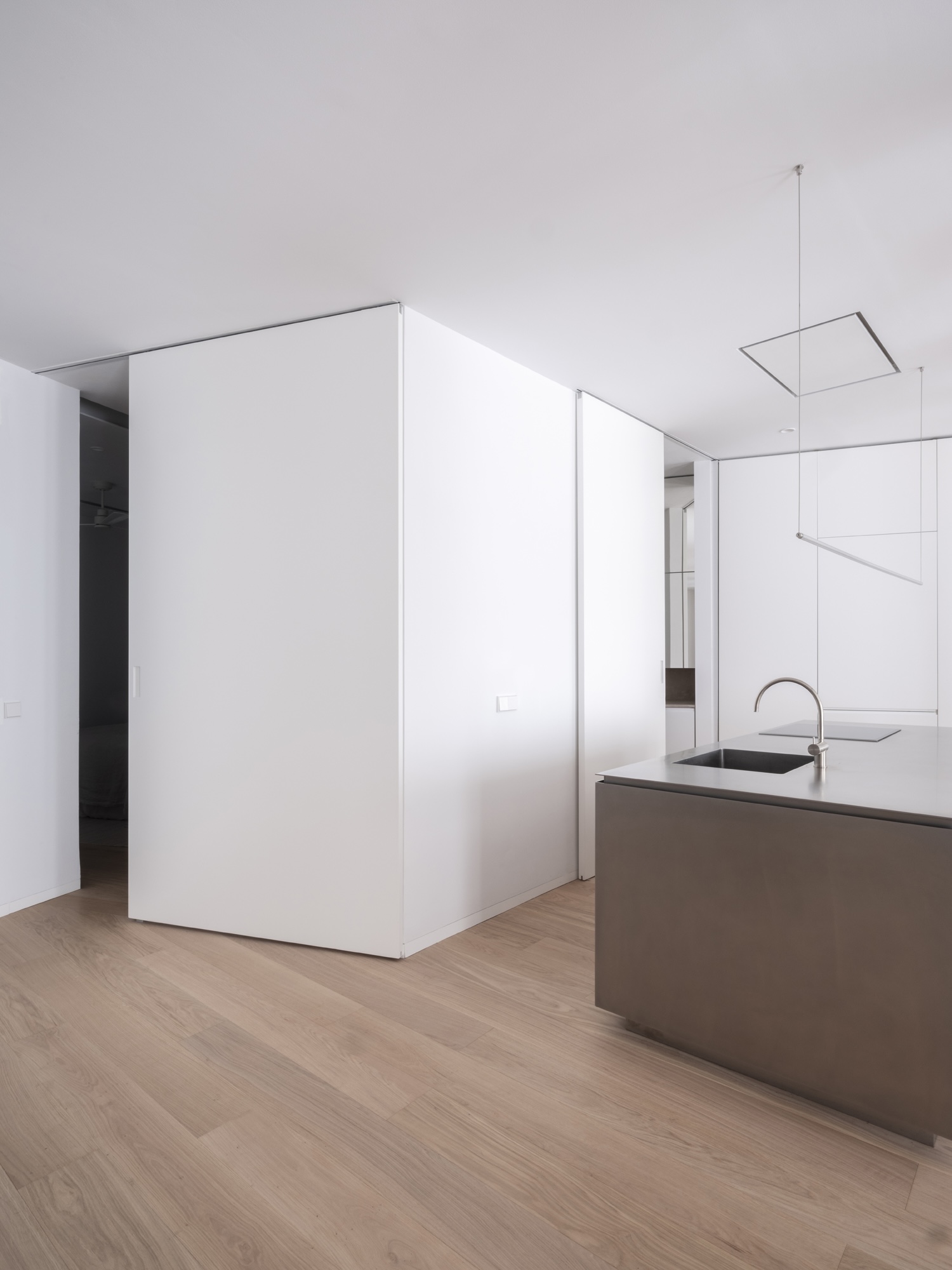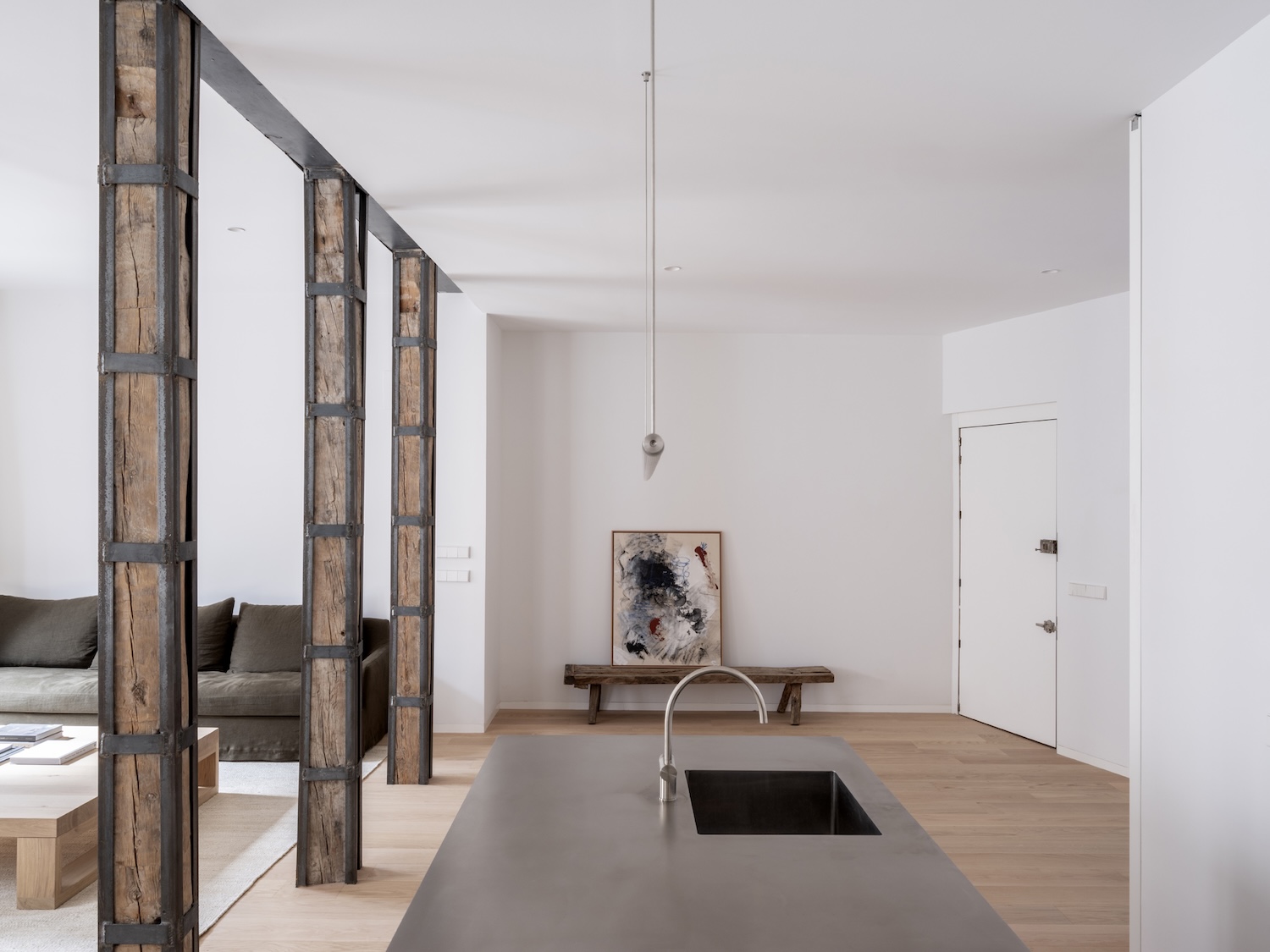 Renovation in Tribunal is a minimalist home located in Madrid, Spain, designed by Donaire Milans Arquitectos. Located in Madrid’s Malasaña district, this second-floor apartment has undergone a transformation that’s less about decoration than revelation. The designers faced a classic Spanish urban housing challenge: how to bring natural light into deep, compartmentalized spaces originally divided into four bedrooms, two without direct ventilation. Their solution was not to merely rearrange but to fundamentally rethink the relationship between structure and space.