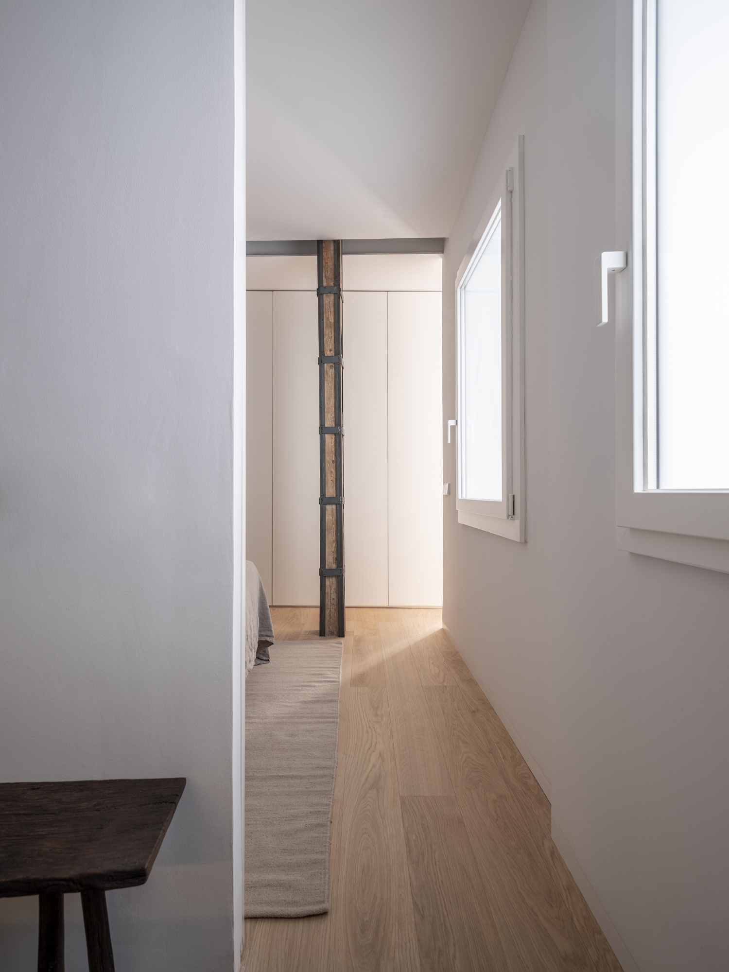 The material palette demonstrates remarkable restraint. Oak flooring connects with the original timber structure, creating continuity between old and new. Natural Campaspero stone appears in basins and shower floors, while fine microcement provides soft, minimal finishes throughout. These choices reflect a contemporary approach to Spanish modernism that values texture over ornamentation and quality over quantity.