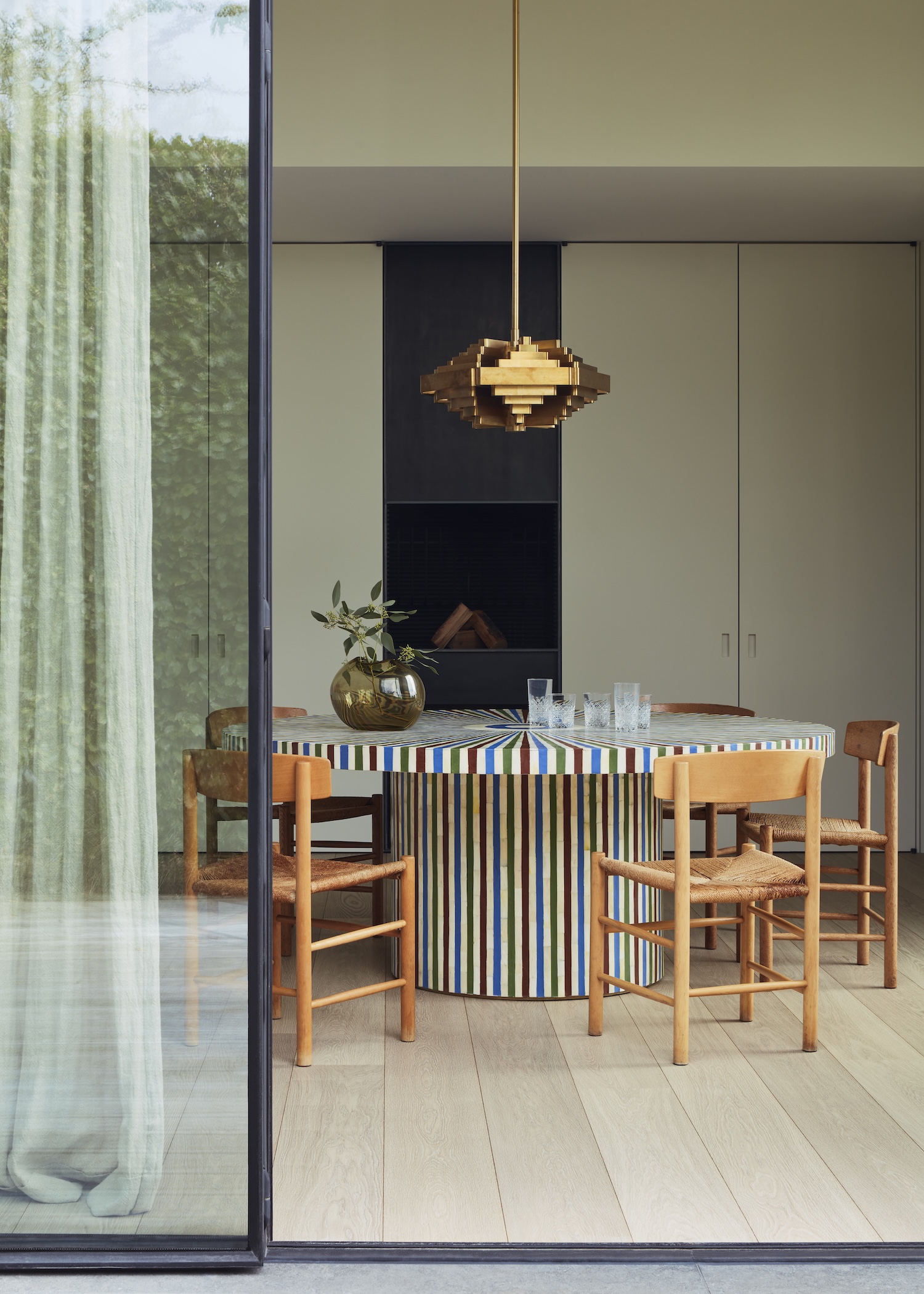 In the office area, where the petrol blue paint scheme creates a more intimate atmosphere, we see Vercruysse’s understanding of how color can transform spatial experience. This deliberate shift in mood demonstrates her recognition that a home isn’t a uniform environment but a collection of experiences tailored to different emotional and functional needs. The dining table, positioned to capture optimal natural light, becomes more than a functional surface—it transforms into a gathering point that anchors the home’s social rhythms, demonstrating Vercruysse’s intuitive understanding of how furniture placement can define the emotional geography of a space.