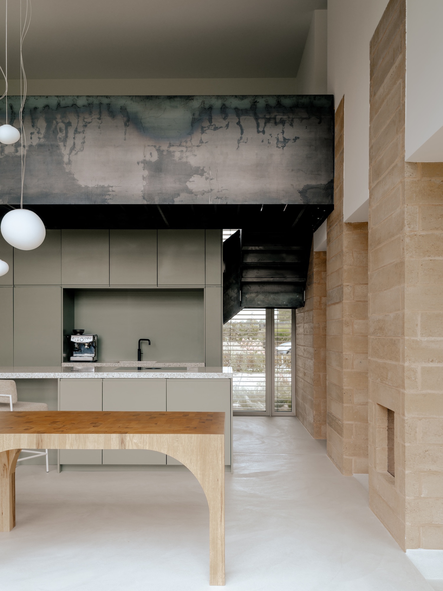 The sunken seating areas function as spatial anchors within this openness. By dropping floor levels selectively, the design creates pockets of enclosure without walls, establishing human-scale territories within the larger volume. This vertical modulation echoes the layered organization of the traditional farmhouse, where distinct functions occupied different levels – living quarters above, workspace below, storage in the roof structure. Here that vertical thinking becomes experiential rather than programmatic, shaping how inhabitants perceive their relationship to the landscape through subtle shifts in eye level and ceiling height.