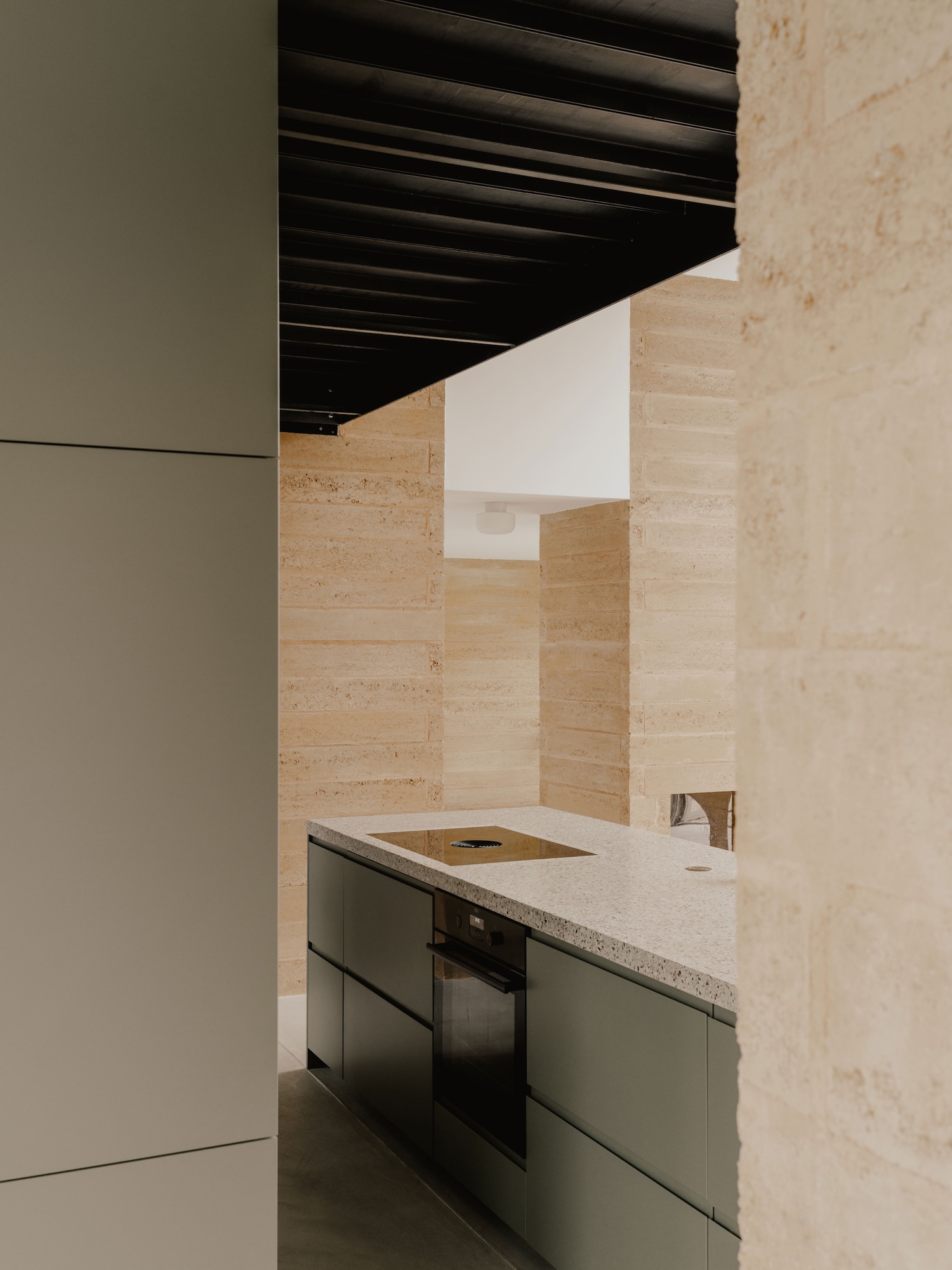 Material choices reinforce the architecture’s connection to both regional building traditions and contemporary environmental priorities. Fraké wood cladding wraps the exterior in warm, sustainably sourced timber that will weather naturally over time. The Spanish Fetdeterra clay blocks appear both inside and out, their earth-toned surfaces providing textural variation while maintaining visual continuity between interior and exterior walls. Clay construction carries particular resonance in a region where brick has long been the vernacular material – these compressed earth blocks offer similar thermal mass and moisture regulation while dramatically reducing embodied carbon compared to fired brick production.