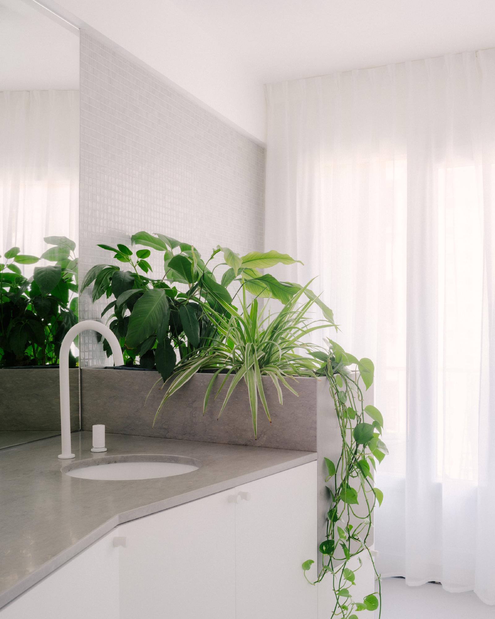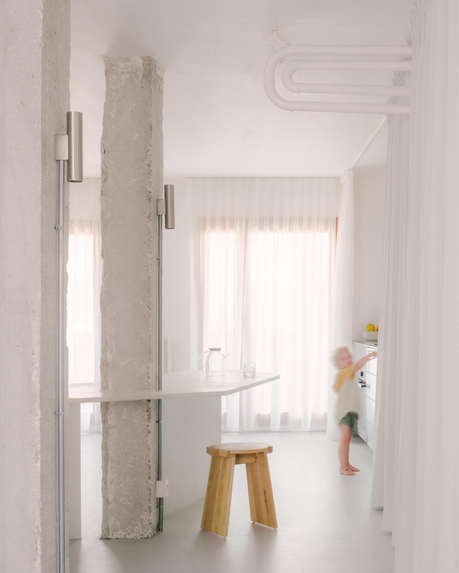 Restructuration D’un Appartement À Marseille is a minimalist interior located in Marseille, France, designed by Olivia Fauvelle Architecture. The renovation sought to maintain the building’s original structural elements, purposefully building around existing columns. Sheer curtains are used throughout the space to serve as semi-transparent partitions, allowing natural light to seep through. Alternatively, black-out curtains are used at the boundary between programs to fully visually obstruct each space. An asymmetrical table enveloping the central concrete column serves as both a kitchen island for additional space for food preparation, a well as a table for dining.