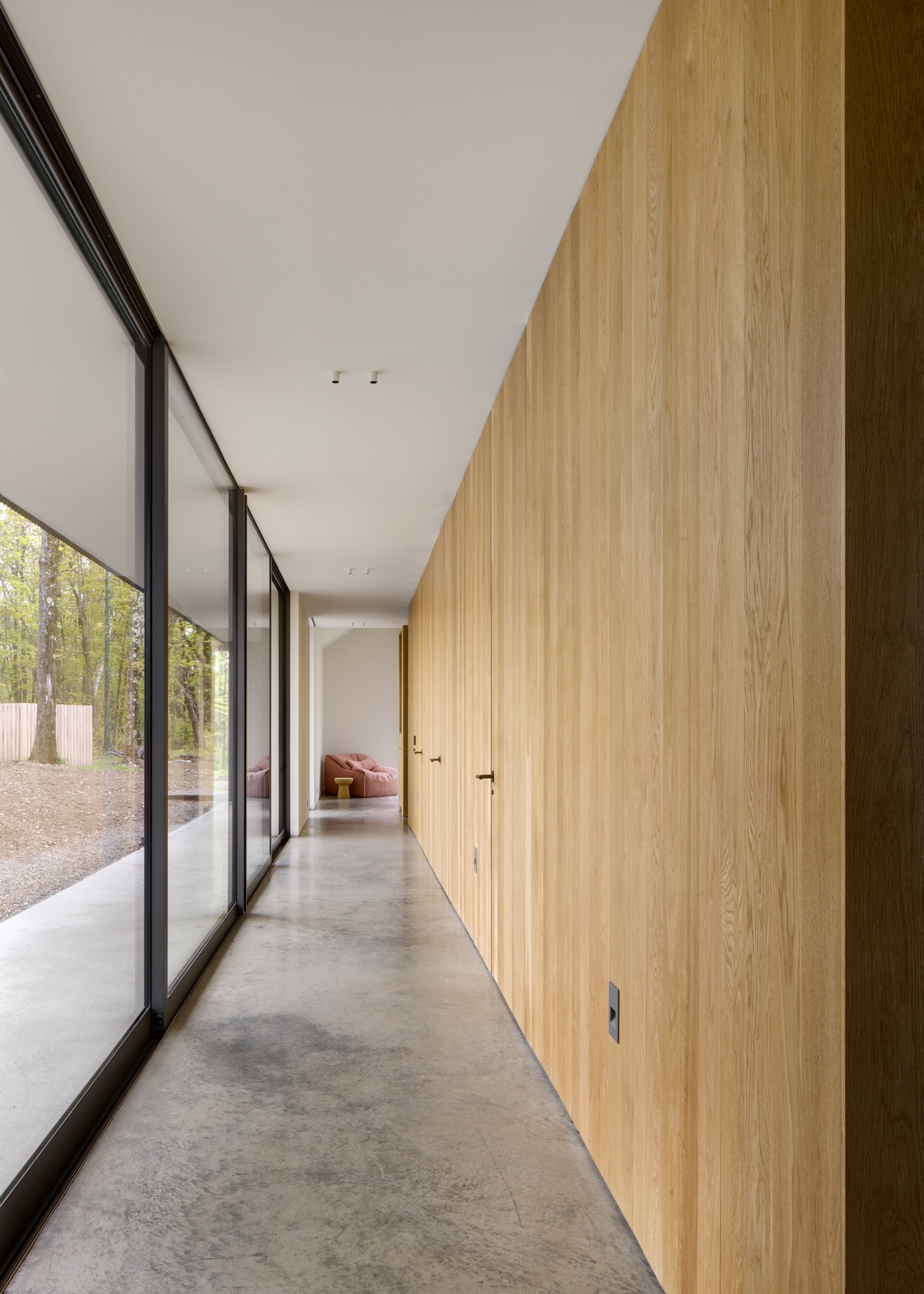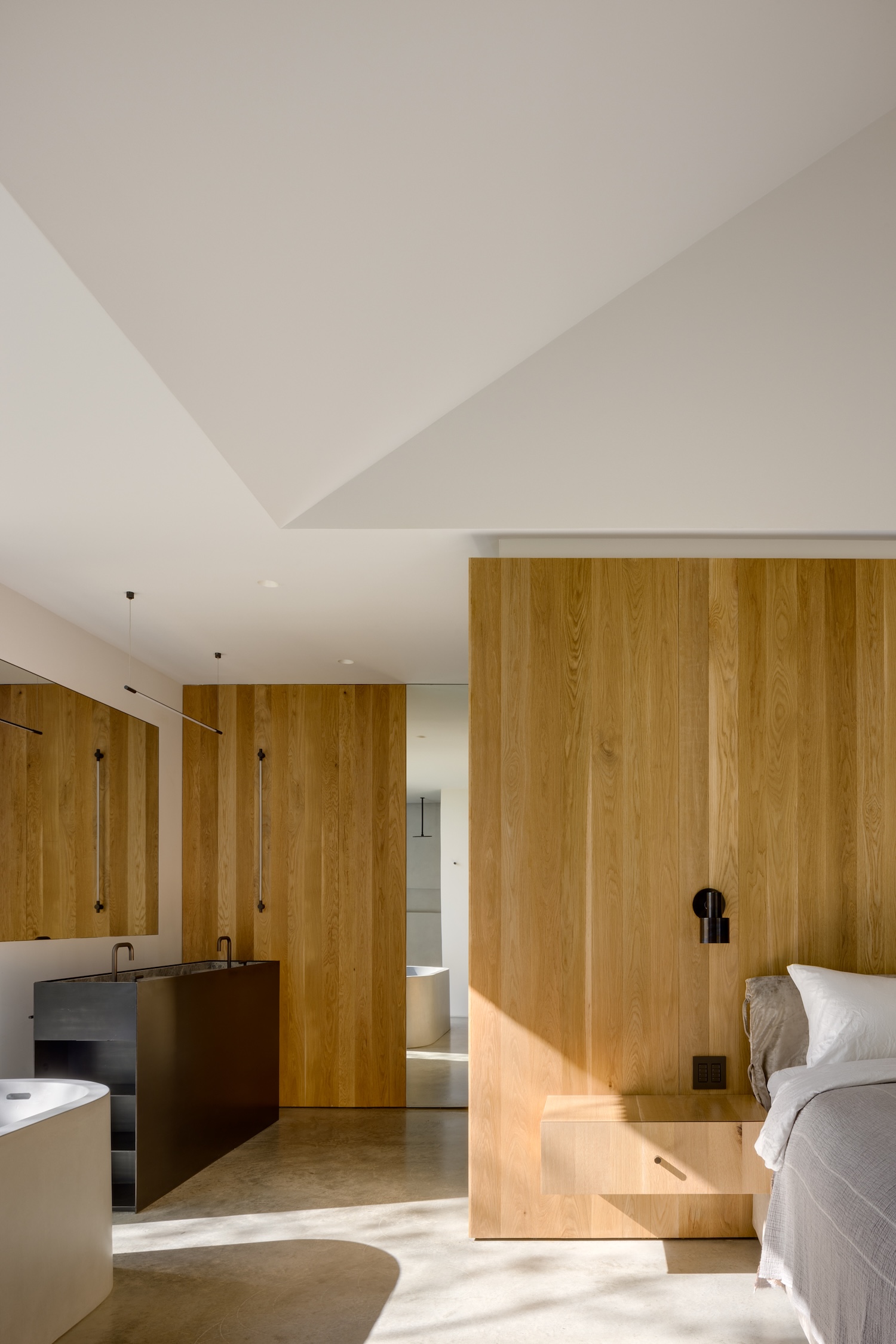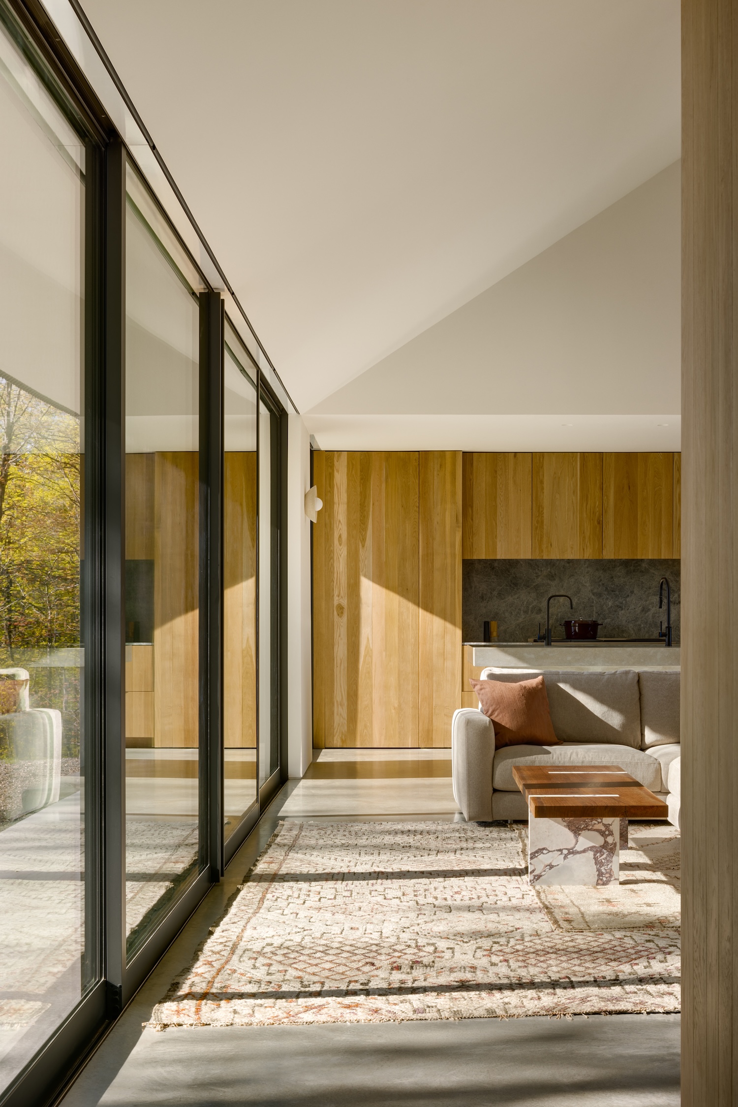 Most intriguing is Worrell Yeung’s solution to the “visionless window” – sections of dark-stained white oak that provide ventilation while maintaining the geometric integrity of the massive seven-by-nine-foot openings. This detail reveals the architects’ commitment to problem-solving through design rather than compromise, transforming a technical challenge into an opportunity for material expression.