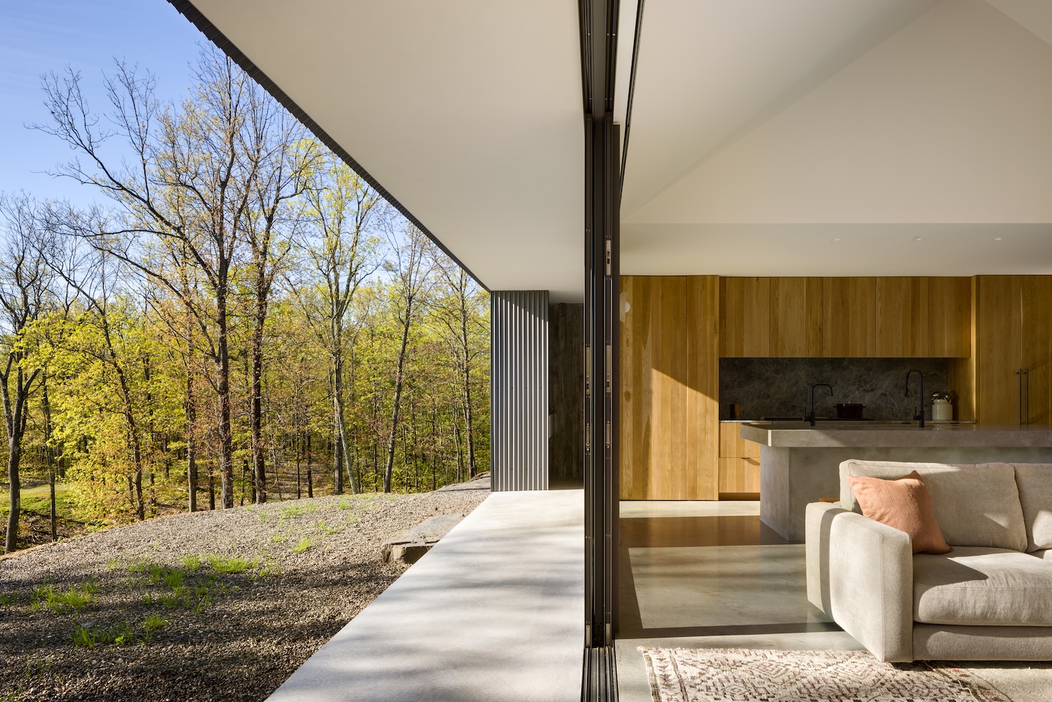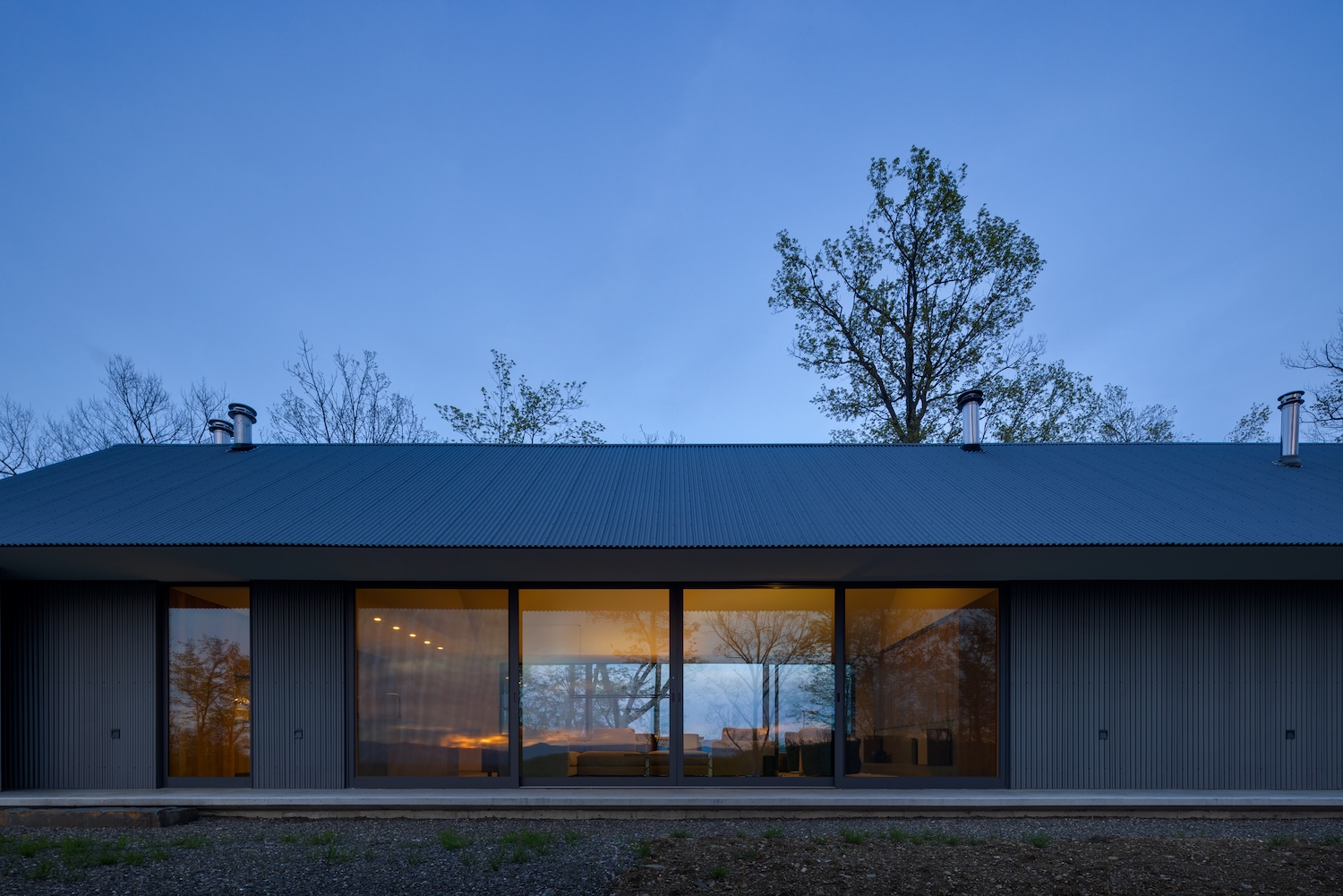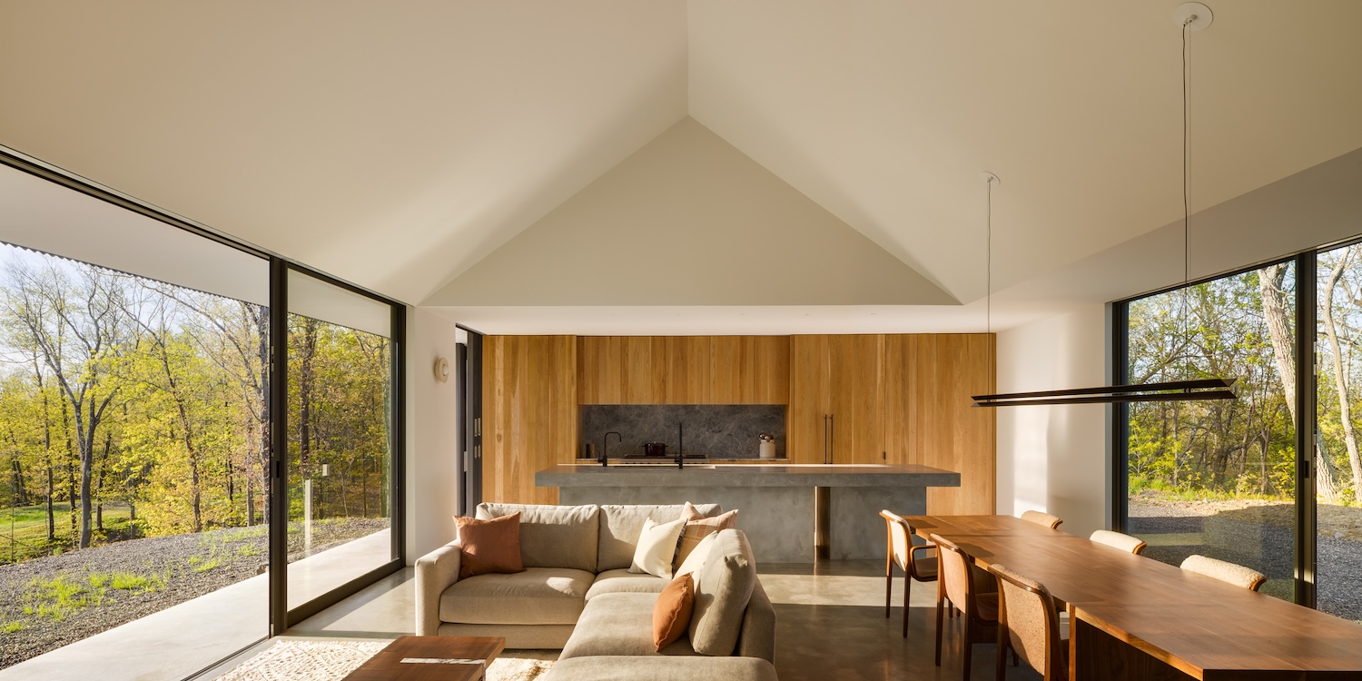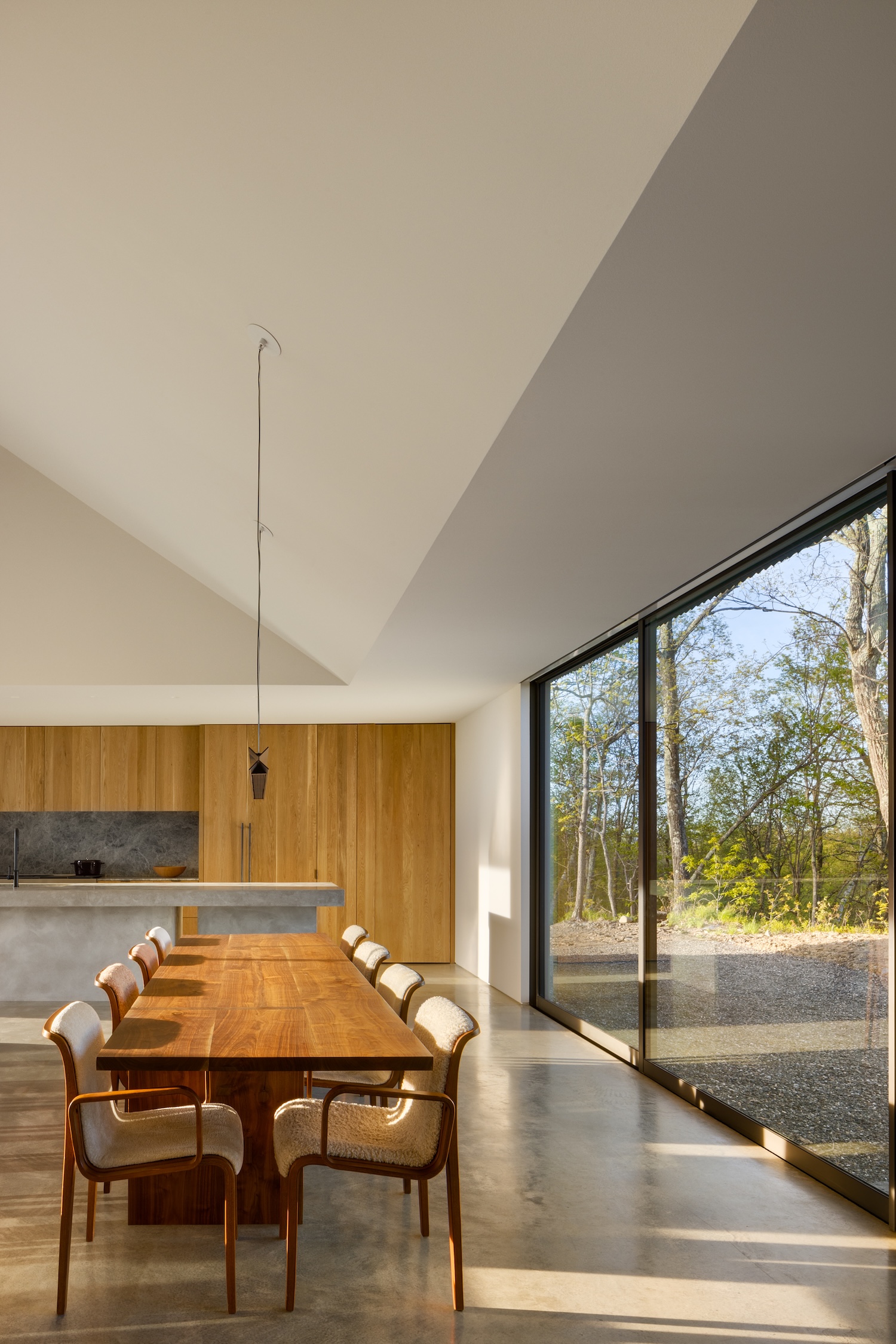 Ridge House is a minimal home located in Upstate New York, designed by Worrell Yeung. The 128-foot gabled structure emerges from its Columbia County ridgeline like a contemporary interpretation of the vernacular barn, yet its board-formed concrete walls and expansive glazing speak to a distinctly modern sensibility. This duality reflects a broader movement in contemporary architecture toward what might be called “informed minimalism” – design that appears simple but reveals layers of sophistication through careful study of proportion, material, and site response.