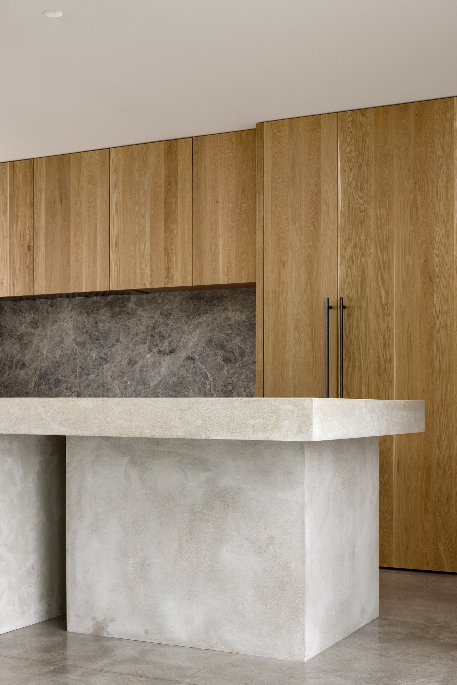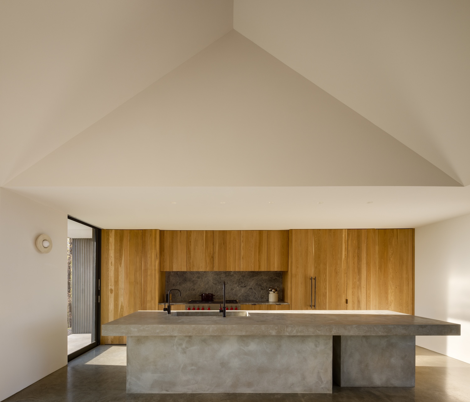 The concrete kitchen island and fireplace serve as anchoring elements within the soaring social space, their mass providing visual weight that grounds the otherwise ethereal volume. These elements speak to a tradition of hearth and table as organizing principles in domestic architecture, updated through contemporary material choices and spatial arrangements.