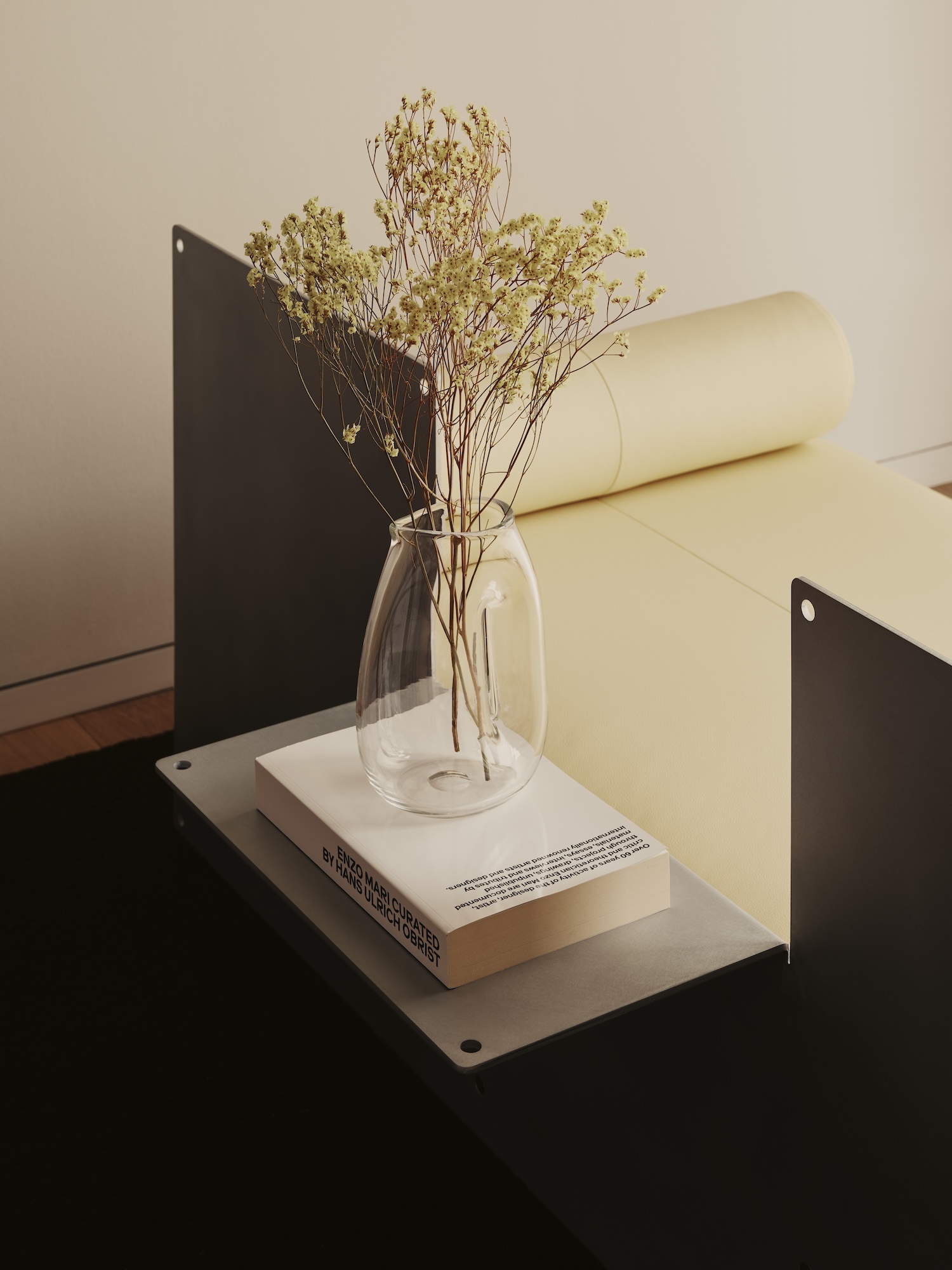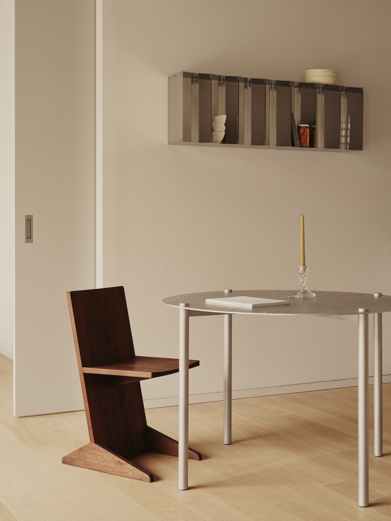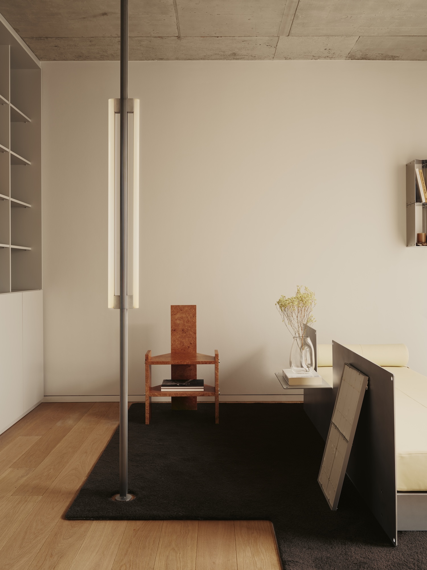 Entering the apartment, the living room vignette is anchored by a wool rug produced by CC-Tapis, pierced by a floor-to-ceiling lamp constructed from stock aluminum heatsink extrusions. The gesture is quietly radical: a commodity industrial profile, usually hidden inside electronics, becomes a luminous structural element. A butter yellow leather daybed faces the window, flanked by a burled maple chair whose figured grain provides the tactile counterpoint to the aluminum’s cool regularity. A framed ceramic work by Lucia Bachner rests against the daybed rather than hanging, a small refusal of convention that reinforces the curatorial rather than residential register.