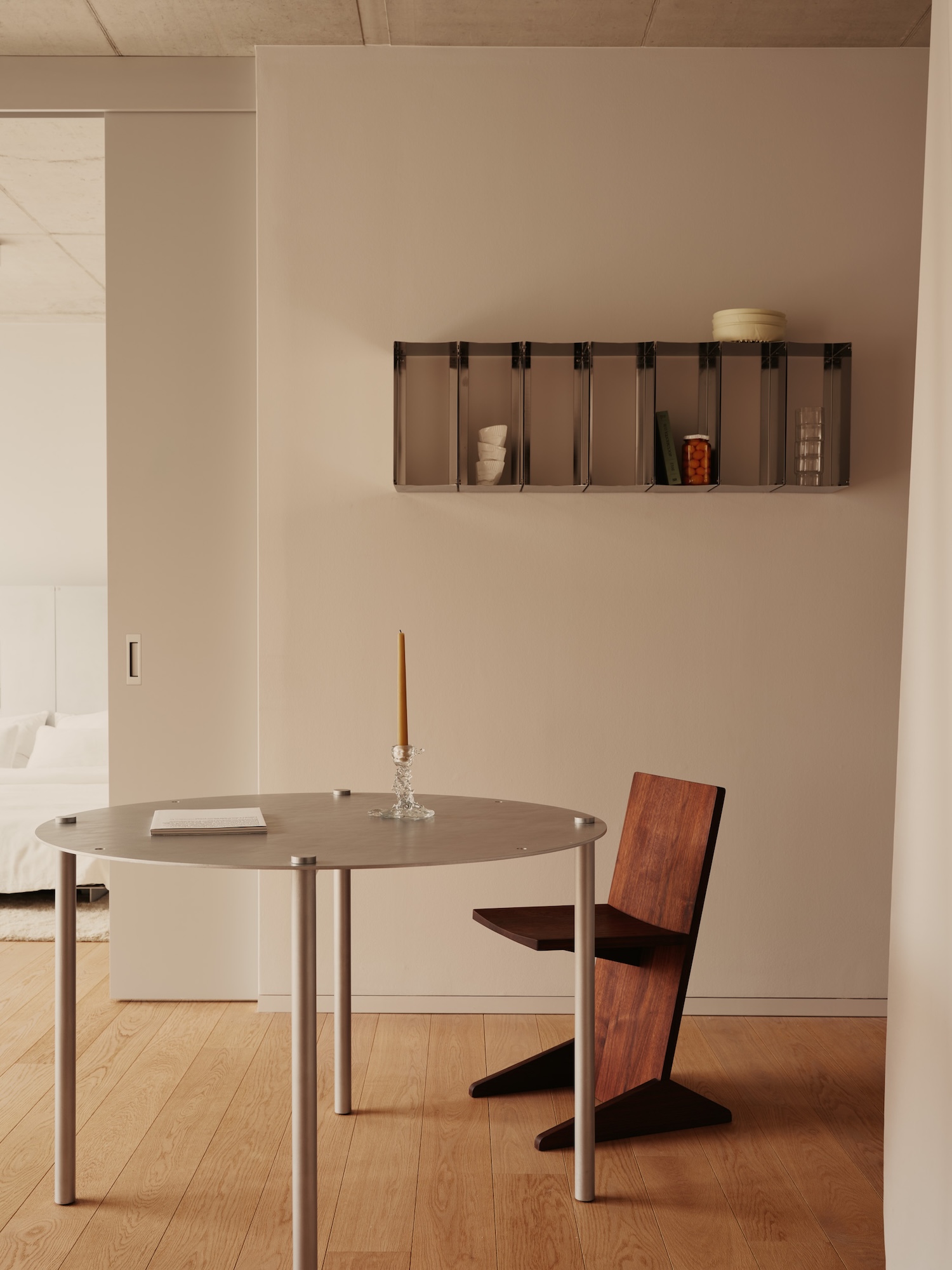 Rooms of AM Tacheles is a minimalist interior located in Berlin, Germany, designed by LOTTO Studio. Within the shell of AM Tacheles, the Herzog & de Meuron development anchoring Berlin’s Mitte district, the question of how to inhabit a building of such architectural weight becomes its own design problem. Curator Garth Roberts answered it by commissioning LOTTO Studio, the Berlin practice of Mirko Ihrig and Casey Lewis, to stage three vignettes inside Suite 04-41. The brief was not to decorate but to propose a mode of living, one that would hold its own against the apartment’s existing architecture by Grüntuch Ernst Architekten without competing with it.