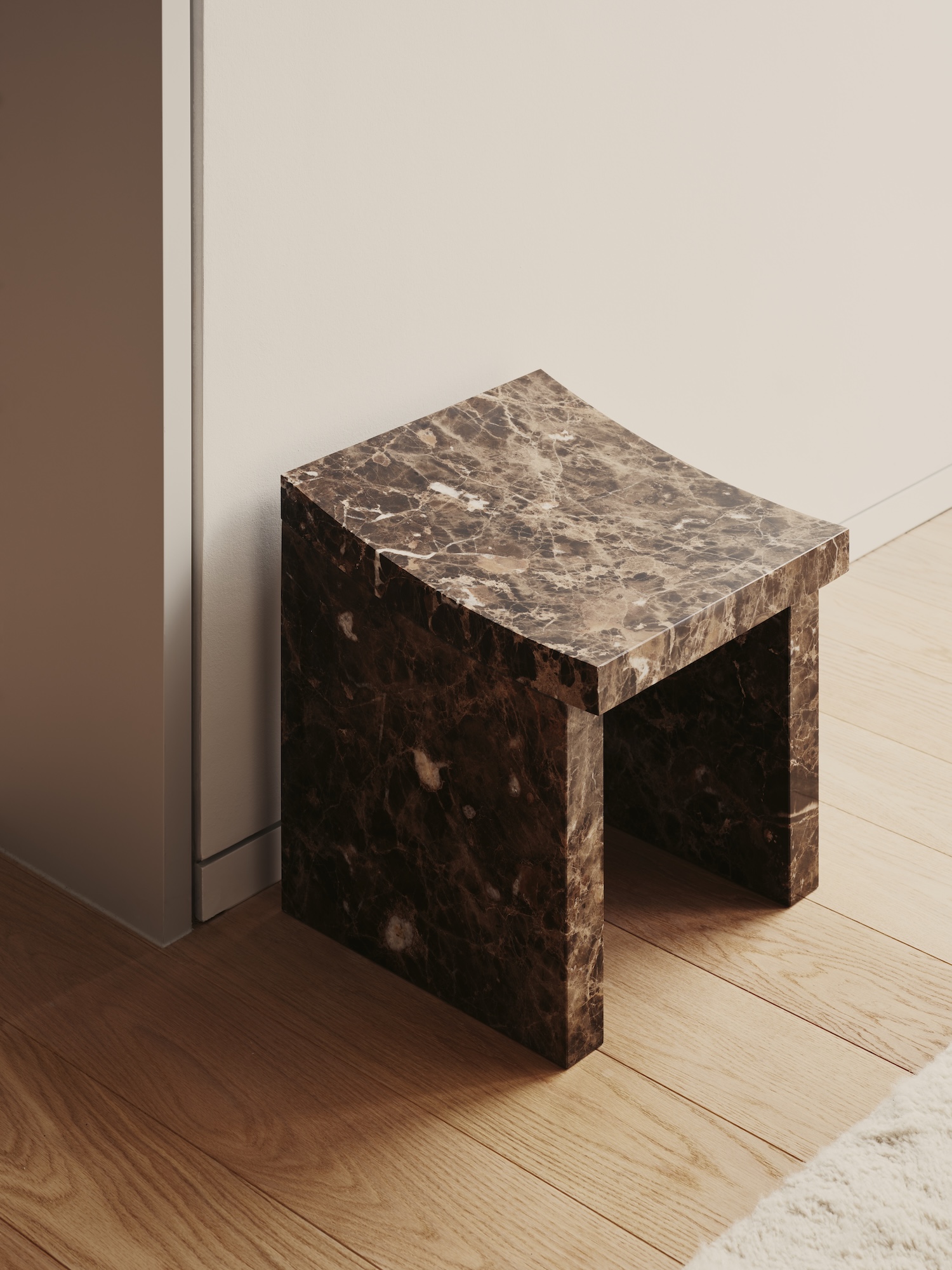 The governing idea across the suite is the void. Every custom piece here is organized around what has been removed rather than what is present. Aluminum sheets are cut and bent into surfaces that carry rather than enclose, carpets are pierced with cutouts that allow vertical elements to pass through the floor plane, and gaps left in construction are absorbed into the vocabulary as storage. The negative space operates as a framing device, drawing attention to the apartment’s raw architectural materials while allowing each object to remain in conversation with the others. The approach recalls the compositional logic of Shiro Kuramata or the industrial material poetics of Max Lamb, though LOTTO’s execution stays closer to the building site than to the gallery.