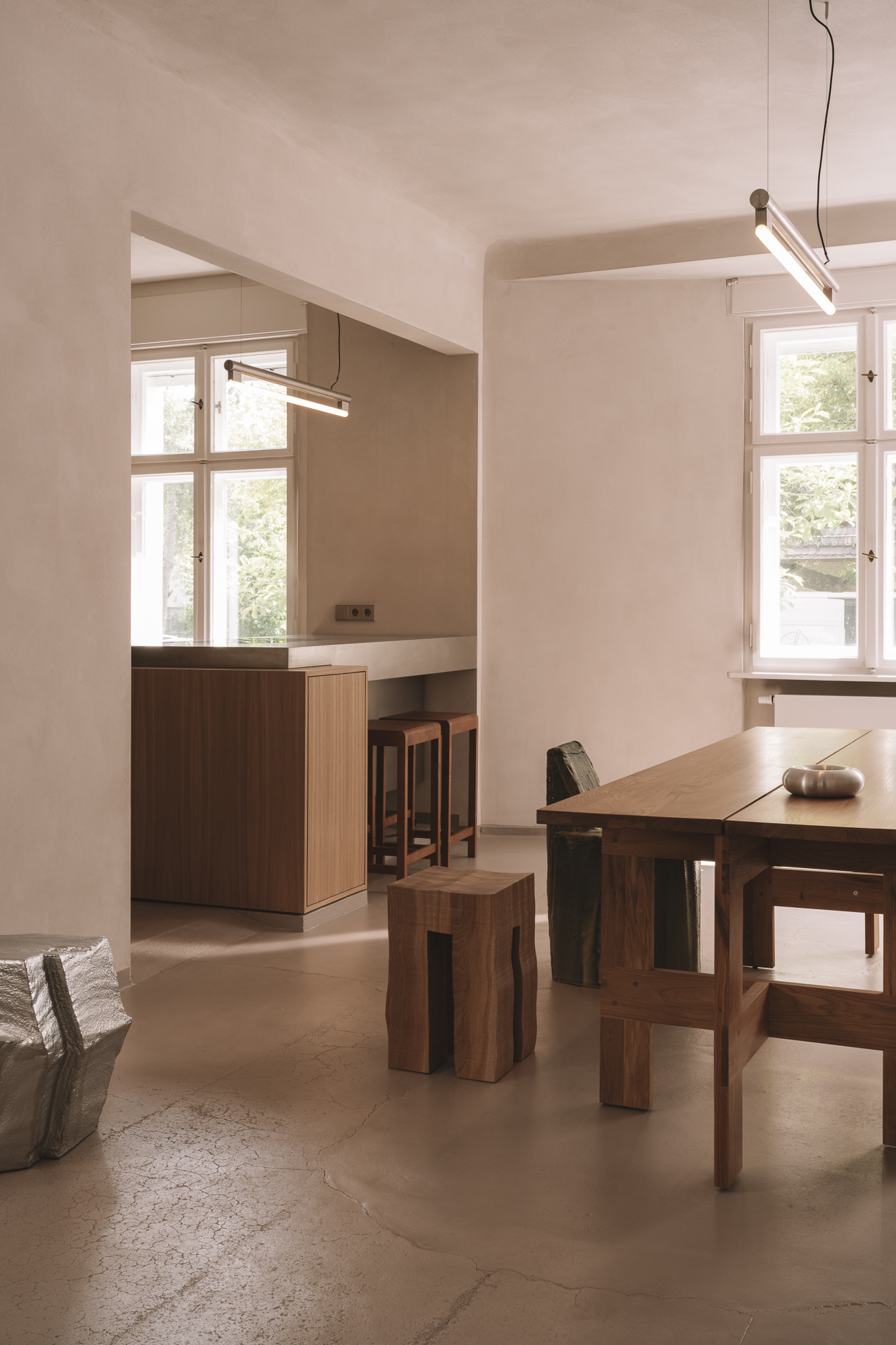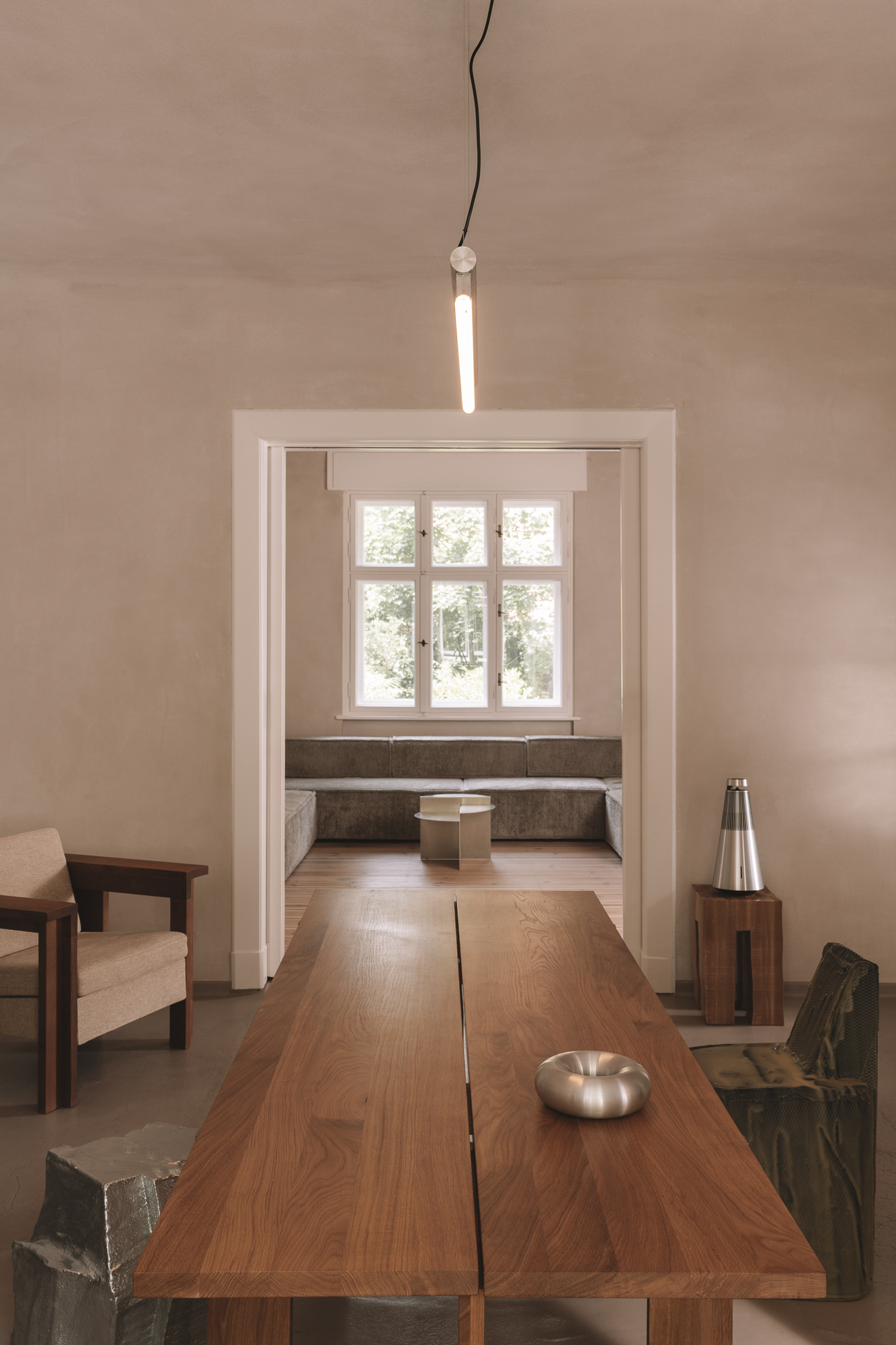 This architectural thinking extends naturally into the furniture selections, where the RM Chair by LS Gomma and Doodle Stool by Aleksander Oniszh punctuate spaces with sculptural authority. The inclusion of Kazuhide Takahama’s vintage seating reveals VAUST’s curatorial eye for pieces that share the home’s commitment to material honesty and functional poetry. Each chair, stool, and table becomes part of a larger conversation about how objects can accumulate meaning through careful arrangement and sustained attention.