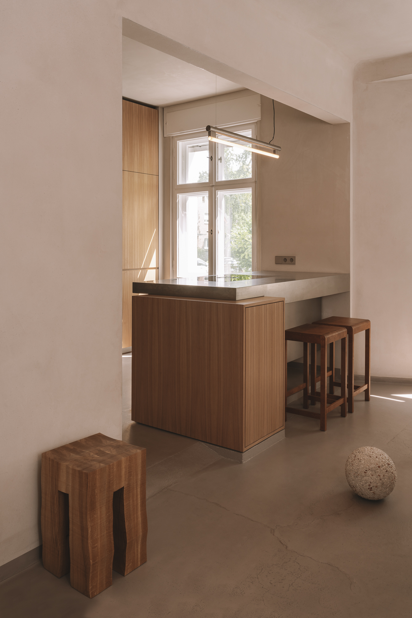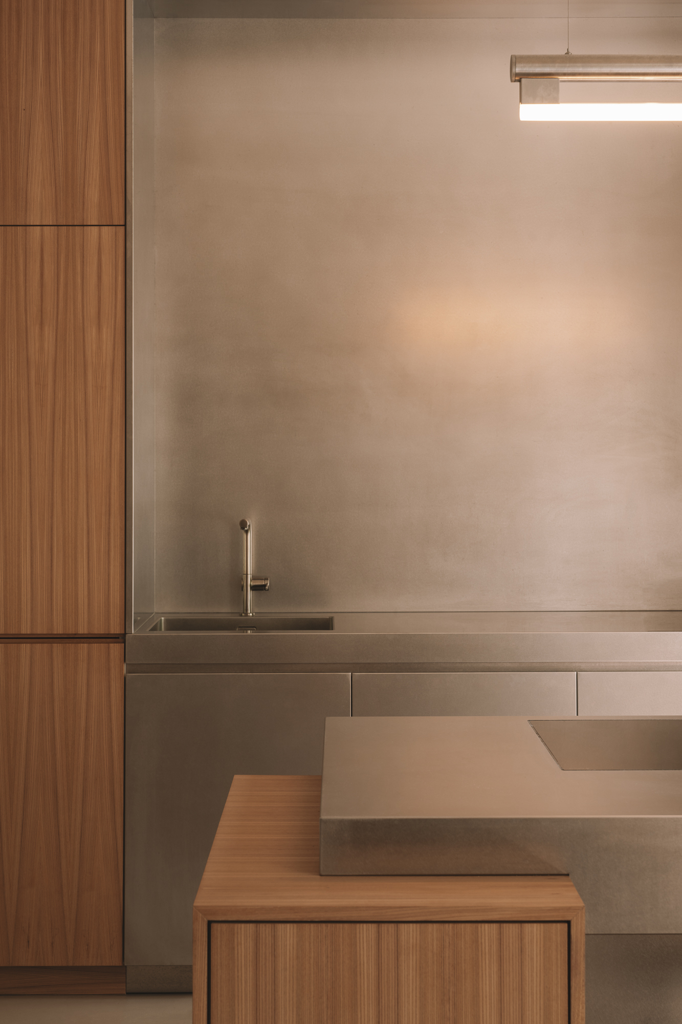 VAUST’s material vocabulary operates through strategic restraint. The pairing of steel and elmwood creates what the studio describes as “calm tension” – a phrase that captures how opposing materials can achieve harmony through careful proportion and placement. The recessed sink niche, carved from the kitchen’s mass like a minimalist cave, demonstrates how subtraction can be as powerful as addition in creating spatial drama.