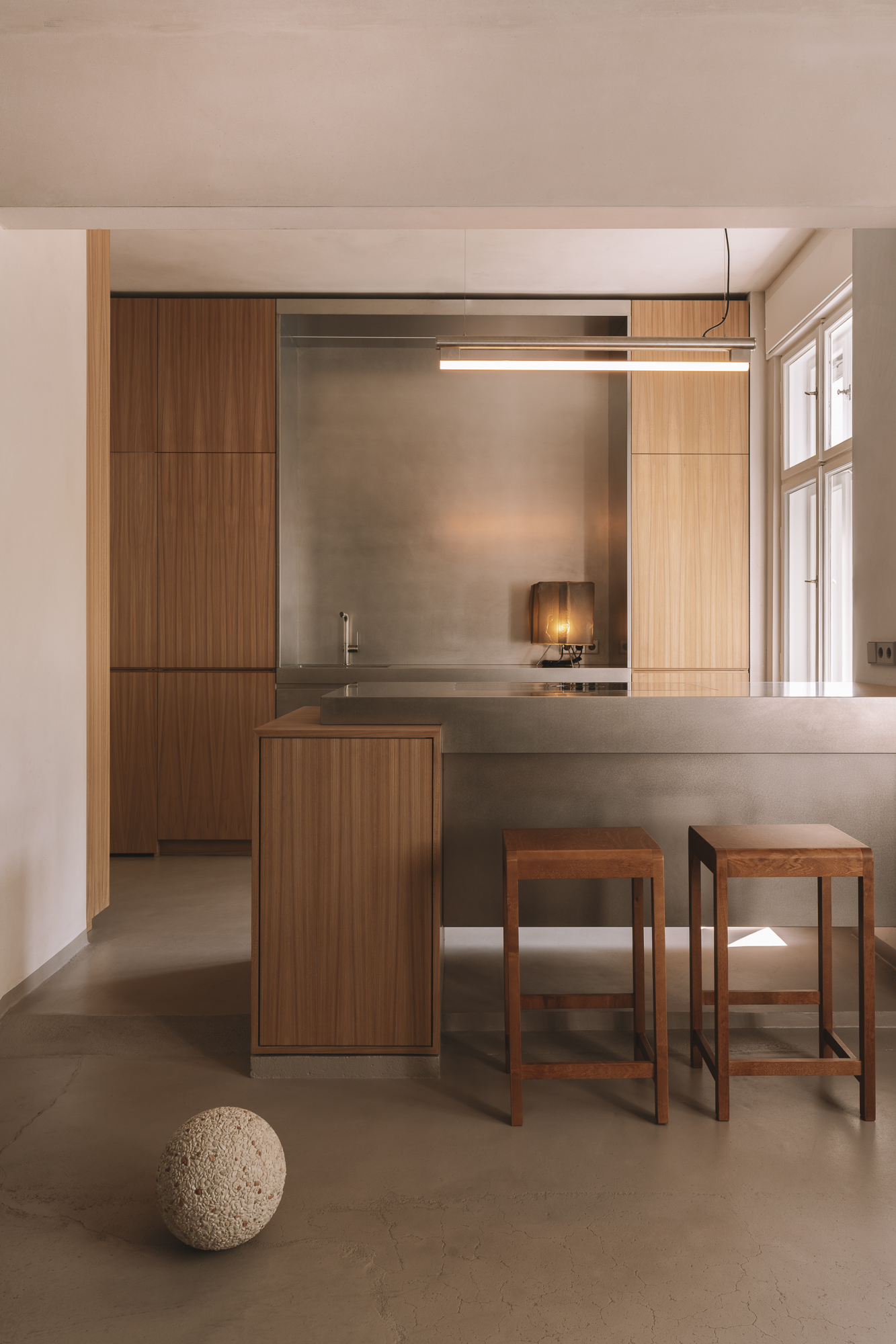 The kitchen island crystallizes this philosophy most powerfully. Rising from its wooden plinth like a modernist altar, the brushed stainless steel surface appears to defy gravity through sheer material confidence. This levitation effect speaks to a broader contemporary fascination with objects that seem to float, from Donald Judd’s wall-mounted boxes to contemporary lighting that hovers without visible support. Yet here, the miracle feels domestic rather than institutional, grounded in the elemental act of gathering around food.
