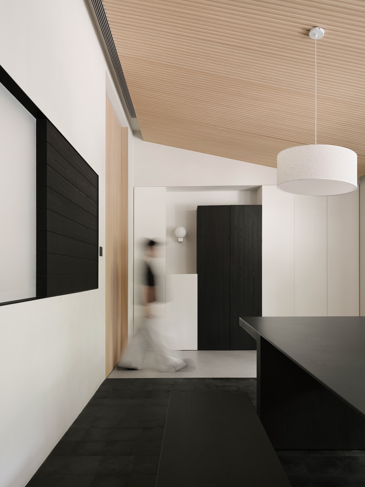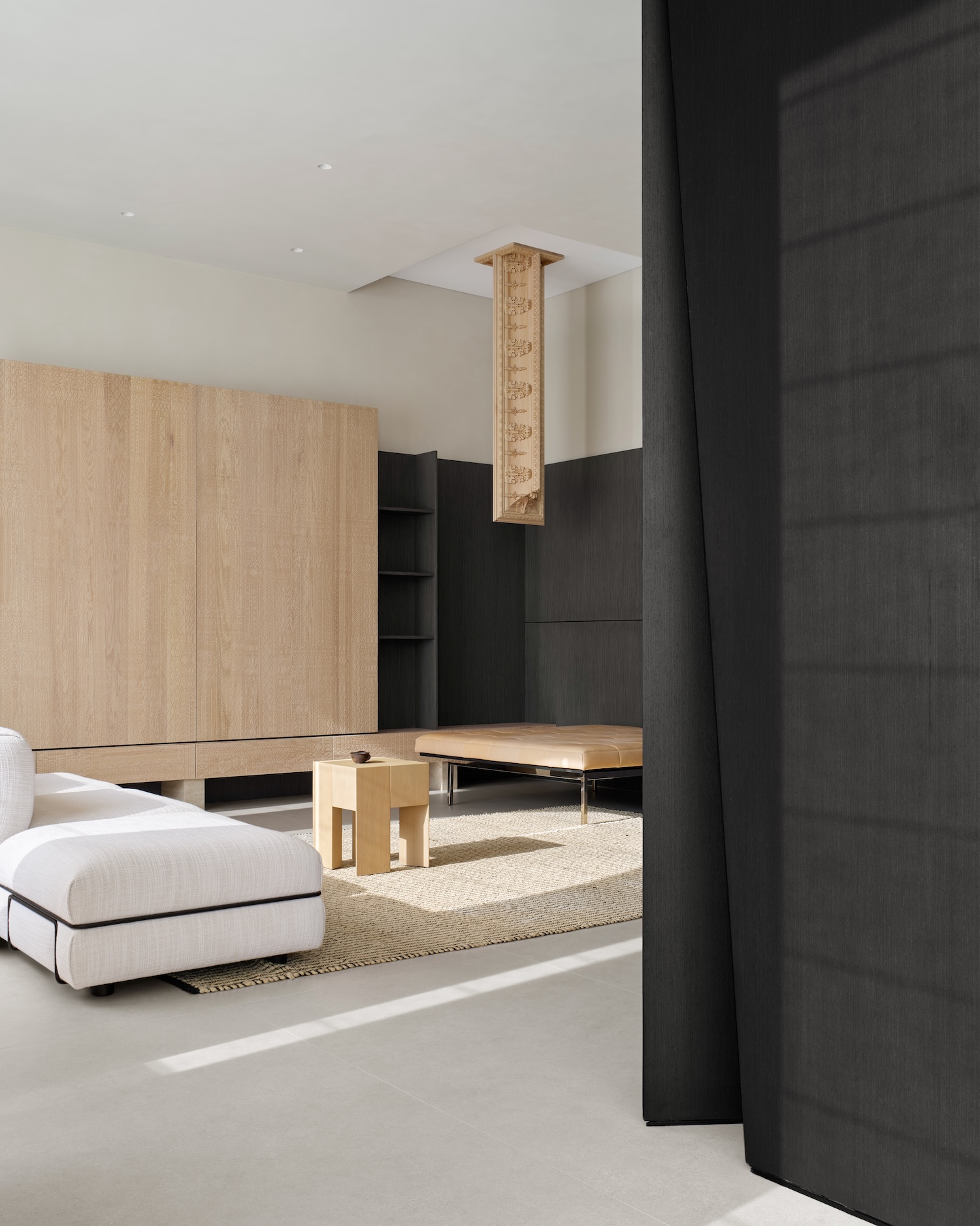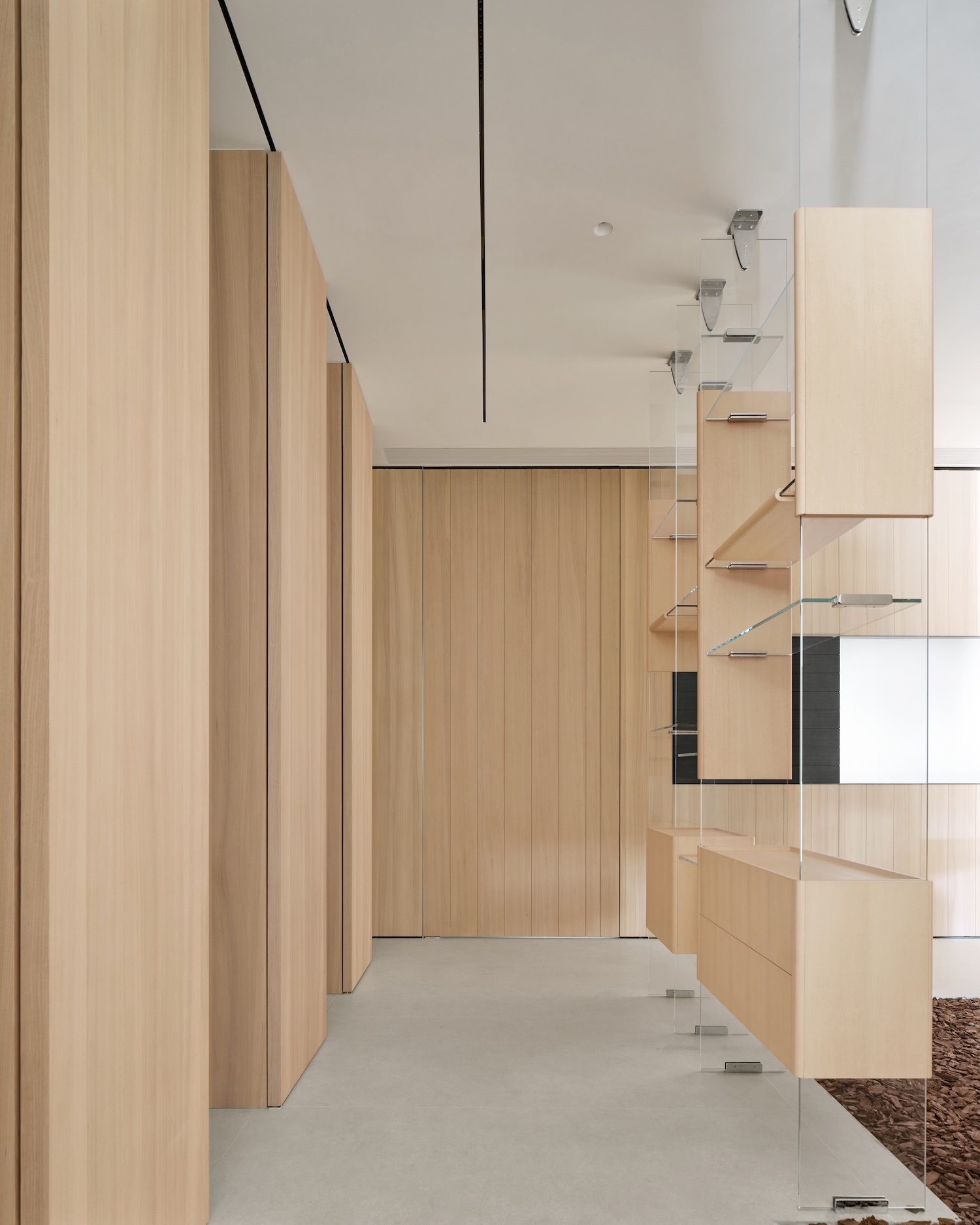 A curved reception volume at the entry establishes the project’s relationship to wood as both pliable and substantial. The gesture acknowledges the material’s capacity for transformation through contemporary fabrication while signaling departure from rectilinear convention. More significantly, the curve terminates in deliberate spatial pause, a void that interrupts expected progression and invites self-directed exploration. This calibrated emptiness functions as counterpoint to the informational density that follows, establishing rhythm through absence rather than accumulation.