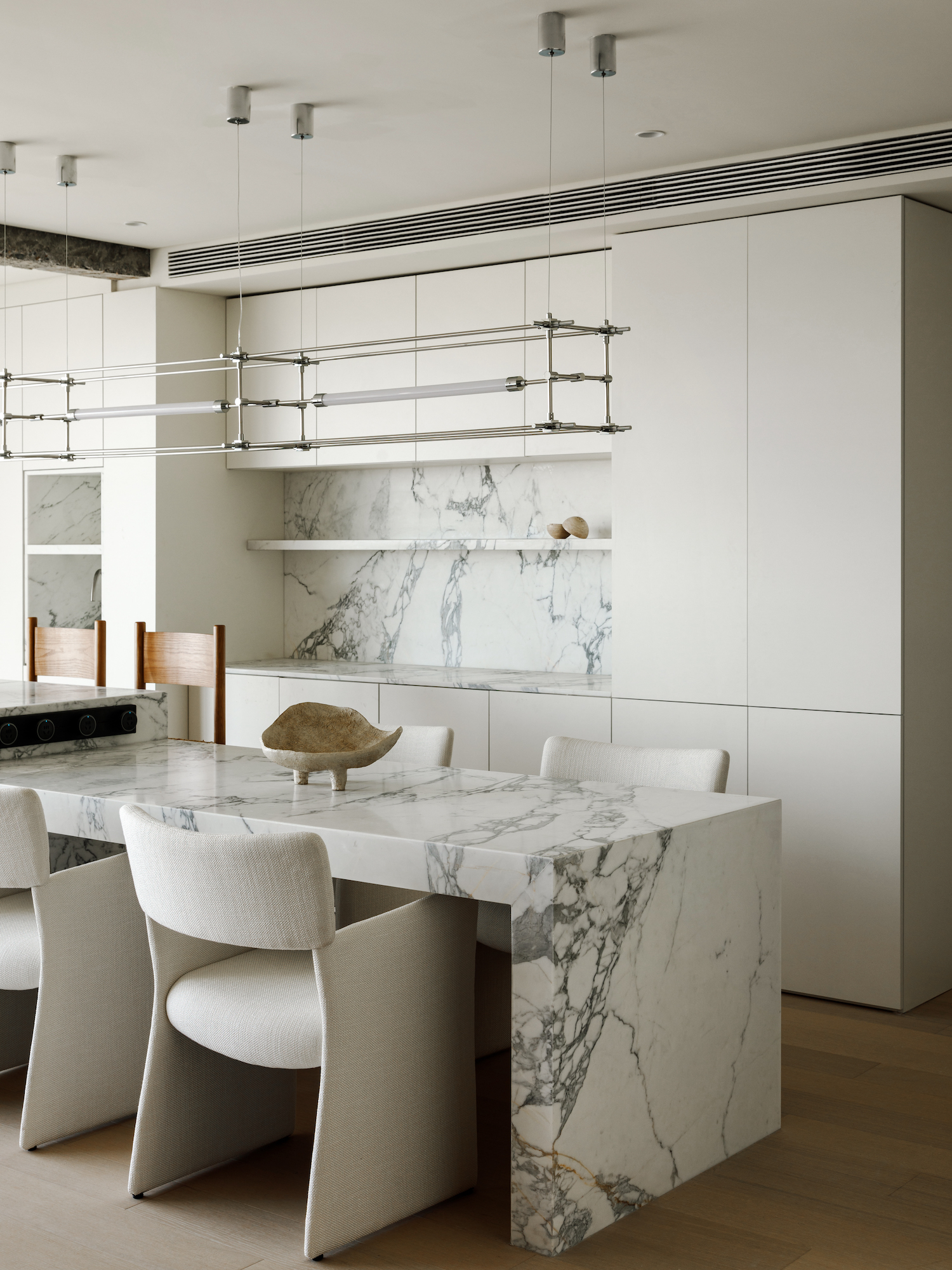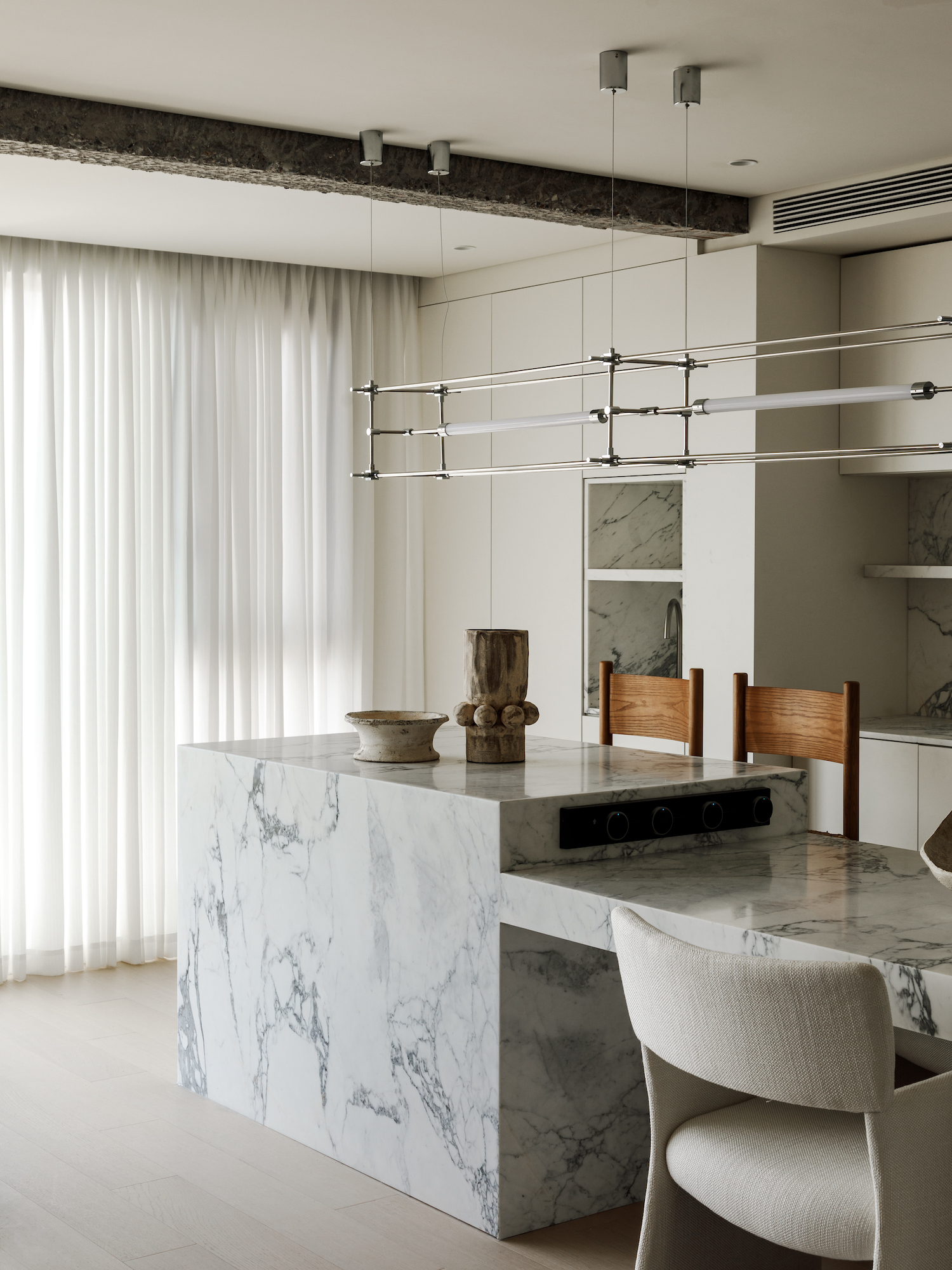 Custom marble display cases, their natural veining adding depth and texture, stand in aesthetic counterpoint, offering sanctuary to objets d’art and literary treasures. An integrated alcohol fireplace, dancing with real flames, infuses the space with warmth, particularly welcome during the city’s cooler seasons. The design ethos embraces a bold inclusivity, mirroring Chengdu’s own balance of tradition and modernity. An original beam, preserved as a testament to the structure’s history, introduces an element of raw beauty to the living room, an unexpected yet captivating focal point. The social heartbeat of the living room extends seamlessly into the dining area, fostering a fluidity between relaxation and repast.
