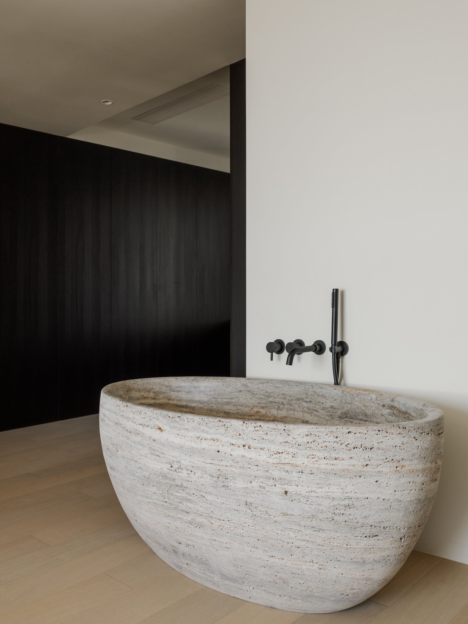 This open-plan configuration encourages a versatile approach to leisure, allowing for effortless transitions between entertaining and quotidian activities. The master bedroom stands as a private retreat, complete with a walk-in closet, en-suite bathroom, and the luxury of an in-room bathtub. The homeowner’s predilection for black is honored throughout, creating an atmosphere of deep sophistication. The crowning jewel of the master bath is a tub hewn from a single piece of silver-grey stone, epitomizing opulence. The bathroom’s design cleverly employs a black and white palette to delineate wet and dry areas, visually expanding the space without compromising aesthetic continuity.
