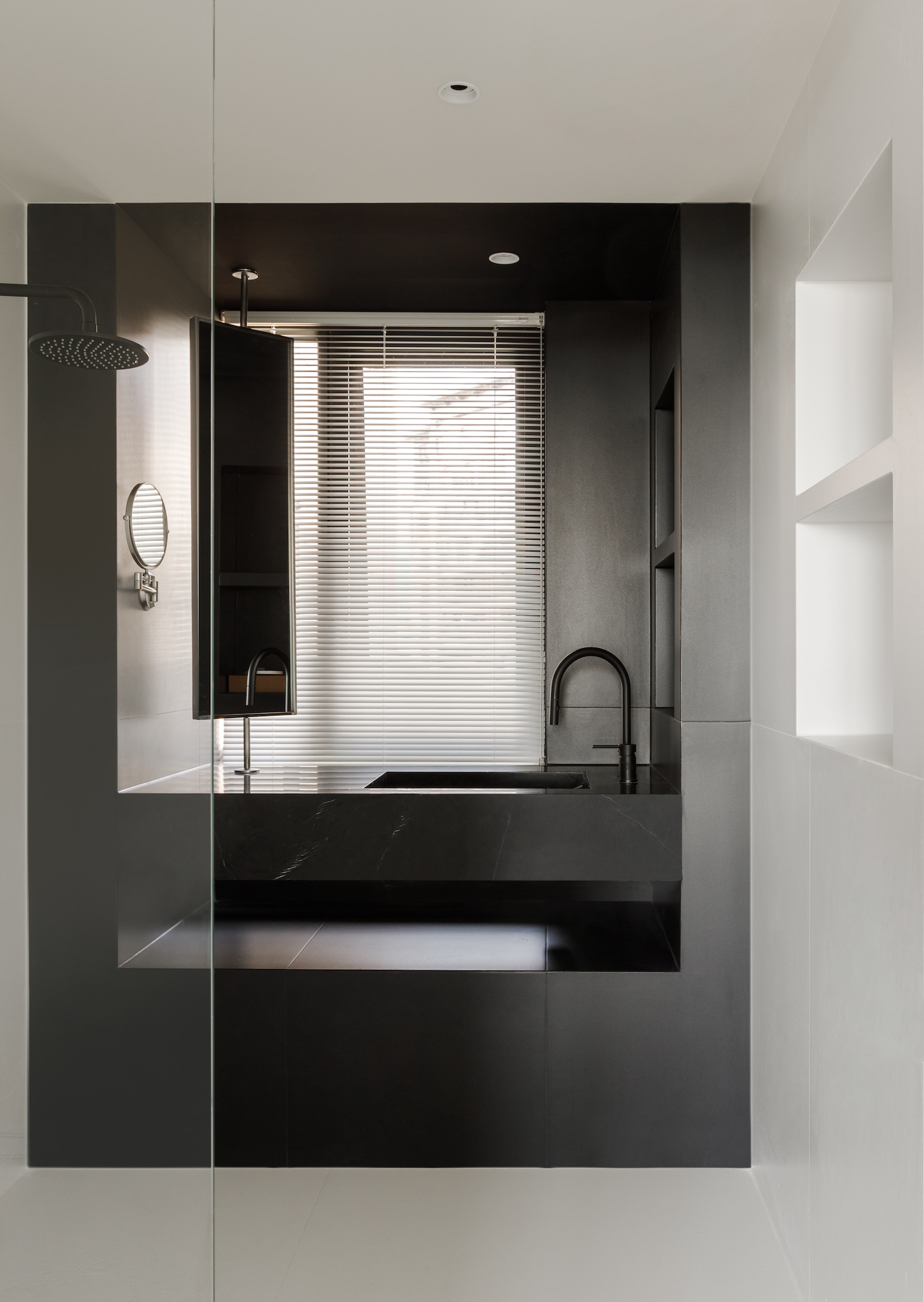 Departing from conventional wisdom, the traditional separation of bathroom zones was reconsidered, yielding a bespoke solution that aligns perfectly with the homeowner’s lifestyle. In the children’s room, playfulness and sophistication coalesce in a palette dominated by duck yellow, infusing the space with warmth and youthful energy. A multi-level floor bed ingeniously partitions the room into distinct zones for rest and play. Customized furnishings seamlessly integrate storage and study areas, ensuring the space evolves in tandem with its young occupant. The study perpetuates the monochromatic theme, offering a focused environment for intellectual pursuits. The dark backdrop minimizes visual noise, while the south-facing window, framed in black, filters natural light to create an atmosphere conducive to concentration and creativity.