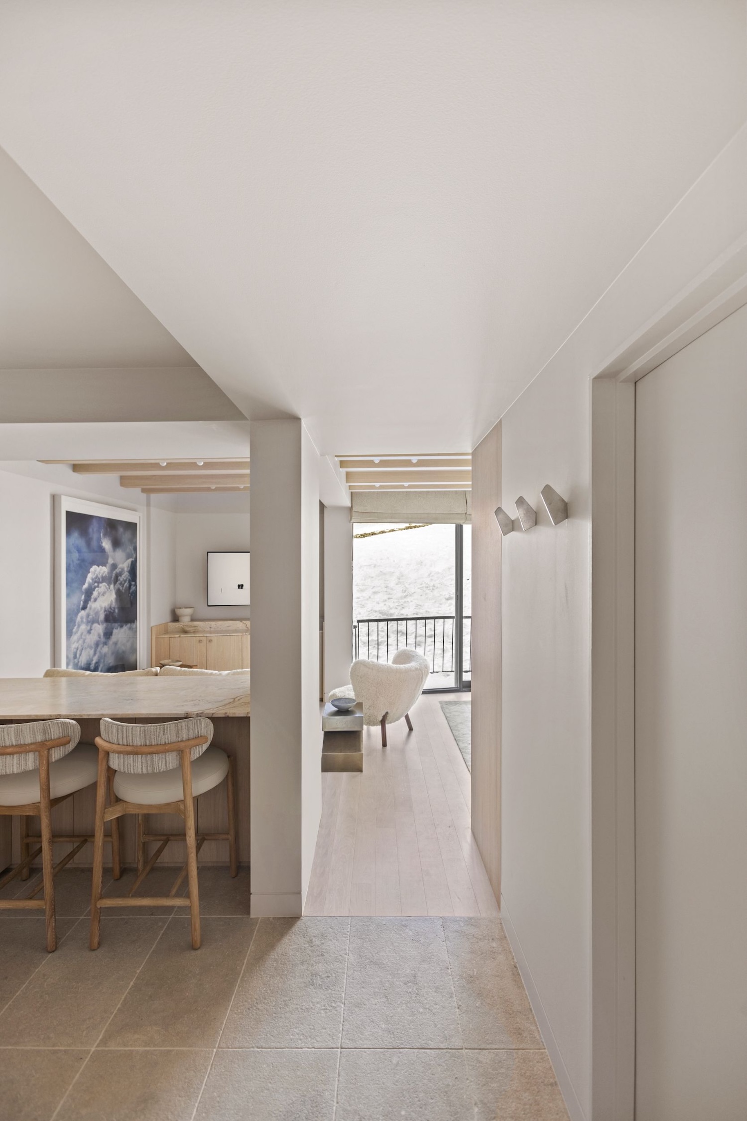 That sensibility manifests most clearly in the material palette. CDK’s Austral Dream marble grounds the space with geological presence, its veining providing organic variation against the joinery’s geometric precision. Havwoods Alabastro timber flooring introduces warmth without softness – its hardness essential for alpine durability while maintaining tactile invitation. Cerdomus flamed marble tiles extend this logic to wet areas, their textured surface offering grip and visual weight. These are not decorative choices but performative ones, selected for behavior as much as appearance.
