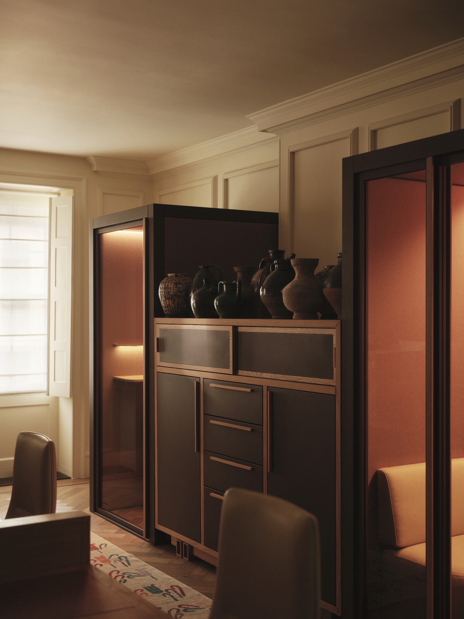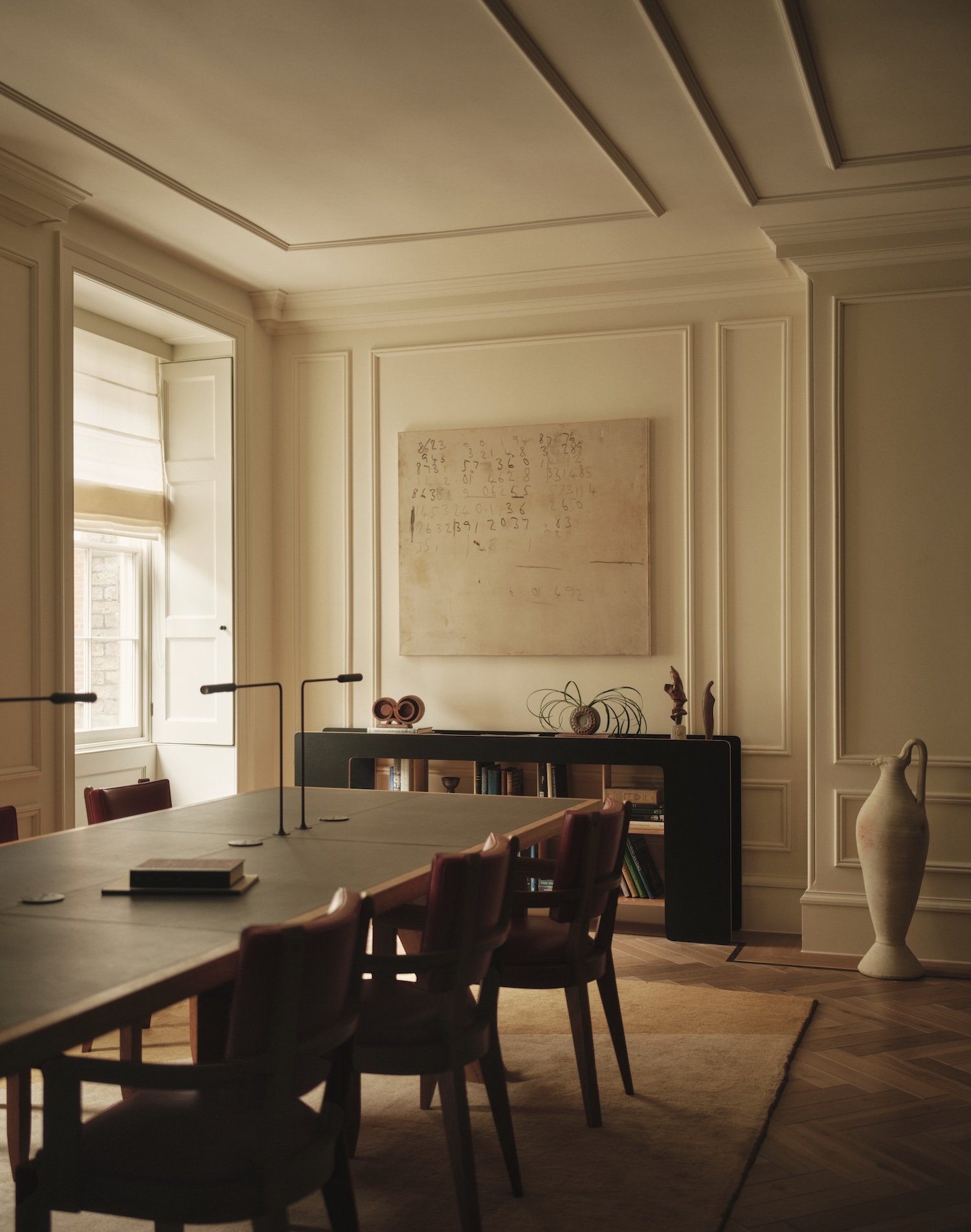 The 3,200-square-foot floor plan dissolves conventional office hierarchies through a sequence of rooms that function like a well-appointed residence. A reception area establishes the tone with a custom charred-oak and steel desk paired with a bespoke curved sofa in plaid wool and a vintage armchair reupholstered in nubuck suede. This assembly of materials and forms suggests a drawing room rather than a waiting area, a deliberate conflation that extends throughout the intervention. The adjacent lounge spans the building’s front facade, where floor-to-ceiling windows frame views of the square’s park. Four distinct zones organize this multi-functional room without fragmenting its spatial continuity – two seating areas with vintage and custom pieces, a lacquered sage green dining table, and a custom bar constructed from oak, marble, and aged brass calibrated to the room’s proportions.