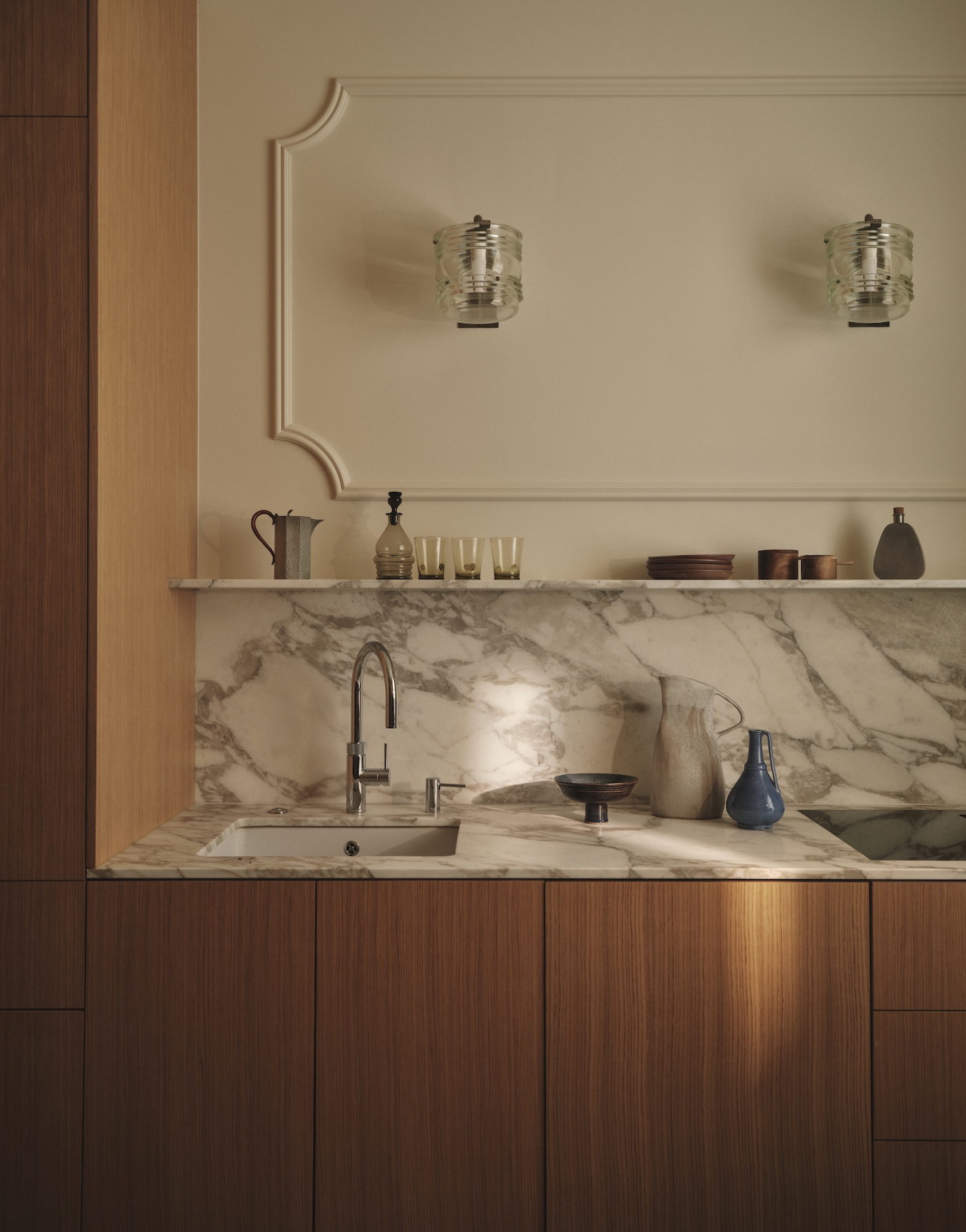 Material selections respond directly to the Georgian architecture’s formality while introducing contemporary sensibilities through surface and finish. Three types of honed natural marble appear in the bar, powder room, and kitchen countertops, their restrained veining and matte surfaces contrasting with the polished brass elements left unlacquered to develop patina over time. Solid oak flooring and custom millwork anchor the spaces in warmth, while leather desk surfaces and library tables prioritize durability in work zones. The layering strategy incorporates natural fibers – suede, wool, alpaca, cotton, mohair – to build tactile complexity without visual excess.