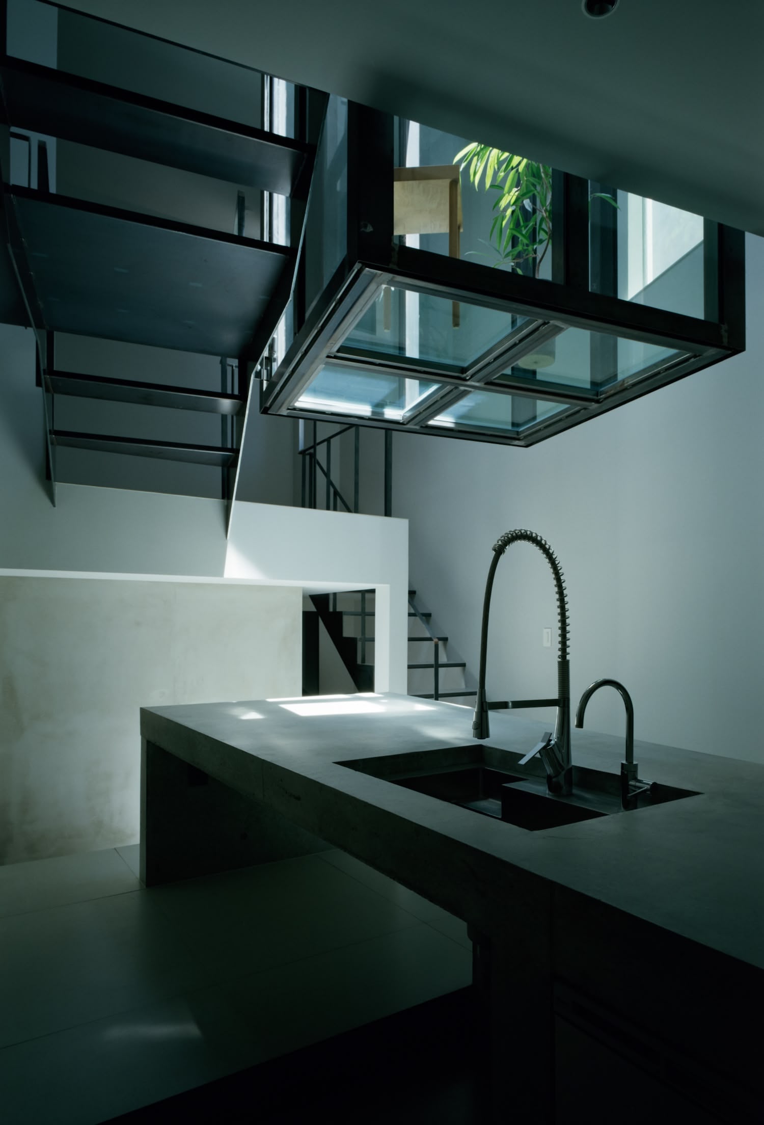 The technical achievement here is remarkable. The glass volume serves as both a pendant and a light diffuser, capturing daylight from above and scattering it in unpredictable patterns across the split-level interior. The effect recalls James Turrell’s skyspaces, but with an added layer of complexity – here, the light-manipulating volume floats within the space rather than being integrated into the building’s shell.