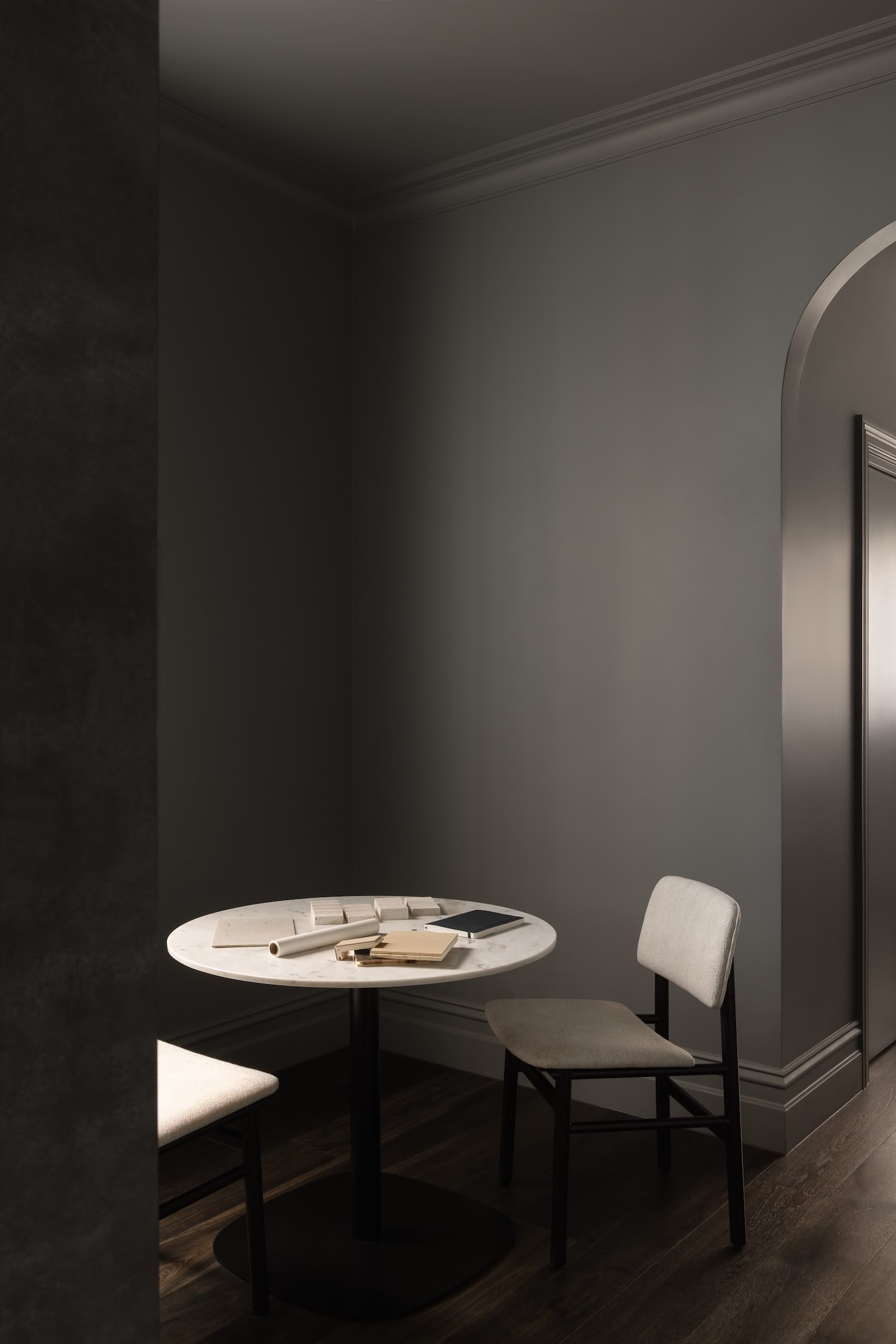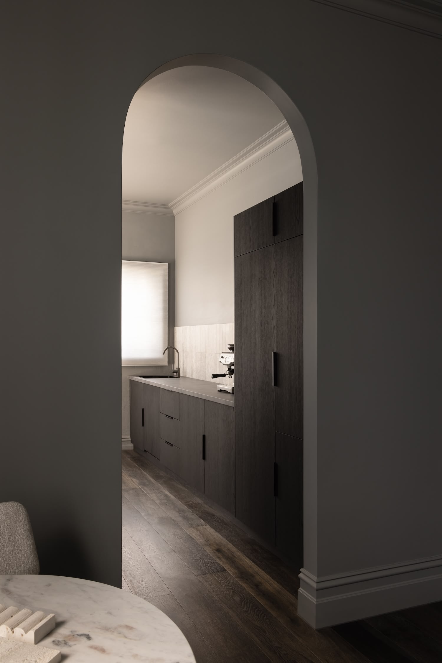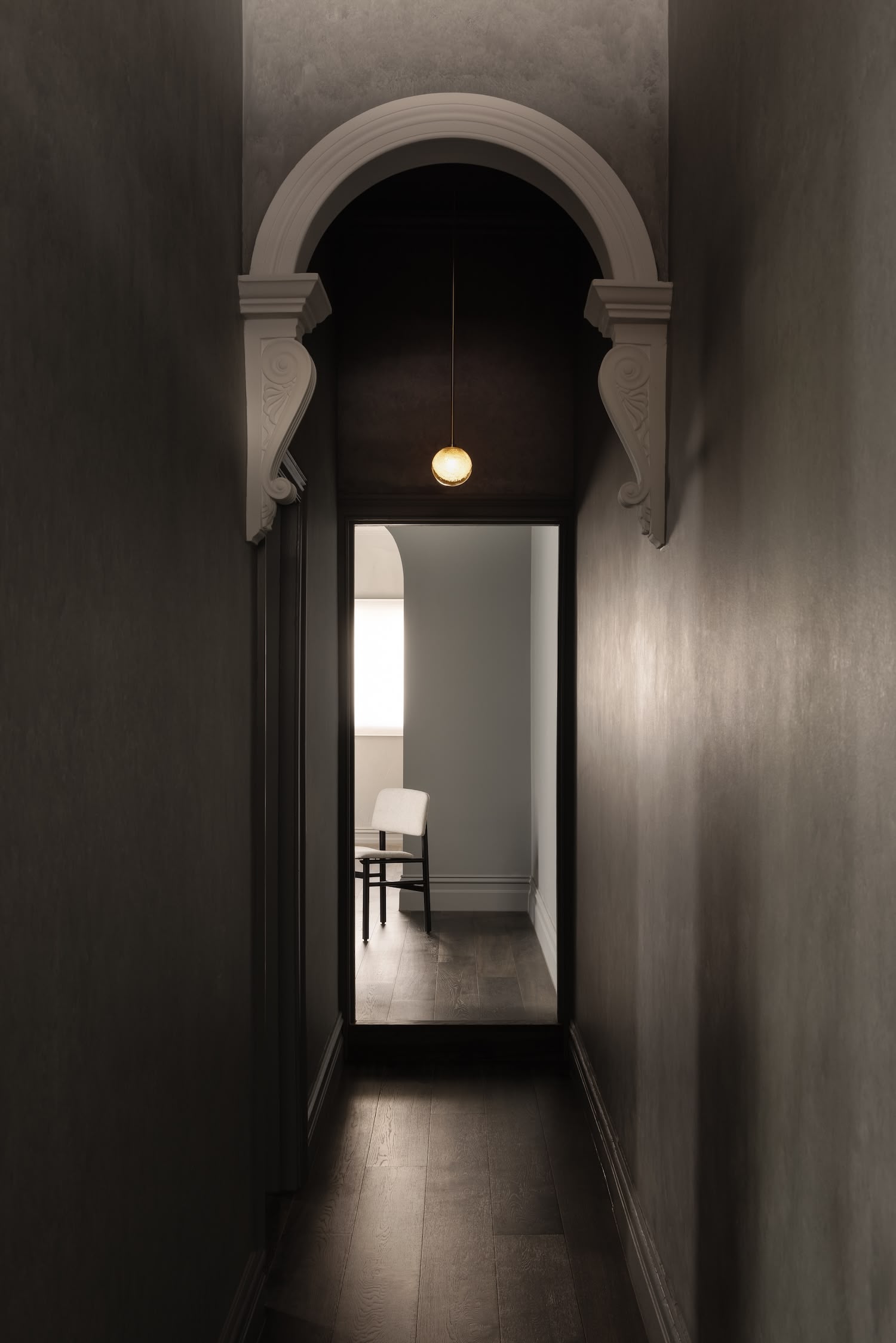 The archway that connects the front and rear portions of the office serves as both a spatial threshold and a historical reference point. By pairing this classical form with warm timber floorboards, the designers have created a material transition that guides visitors through the space. This careful orchestration of movement echoes the processional qualities found in the work of Carlo Scarpa, where each transition becomes an opportunity for revelation.