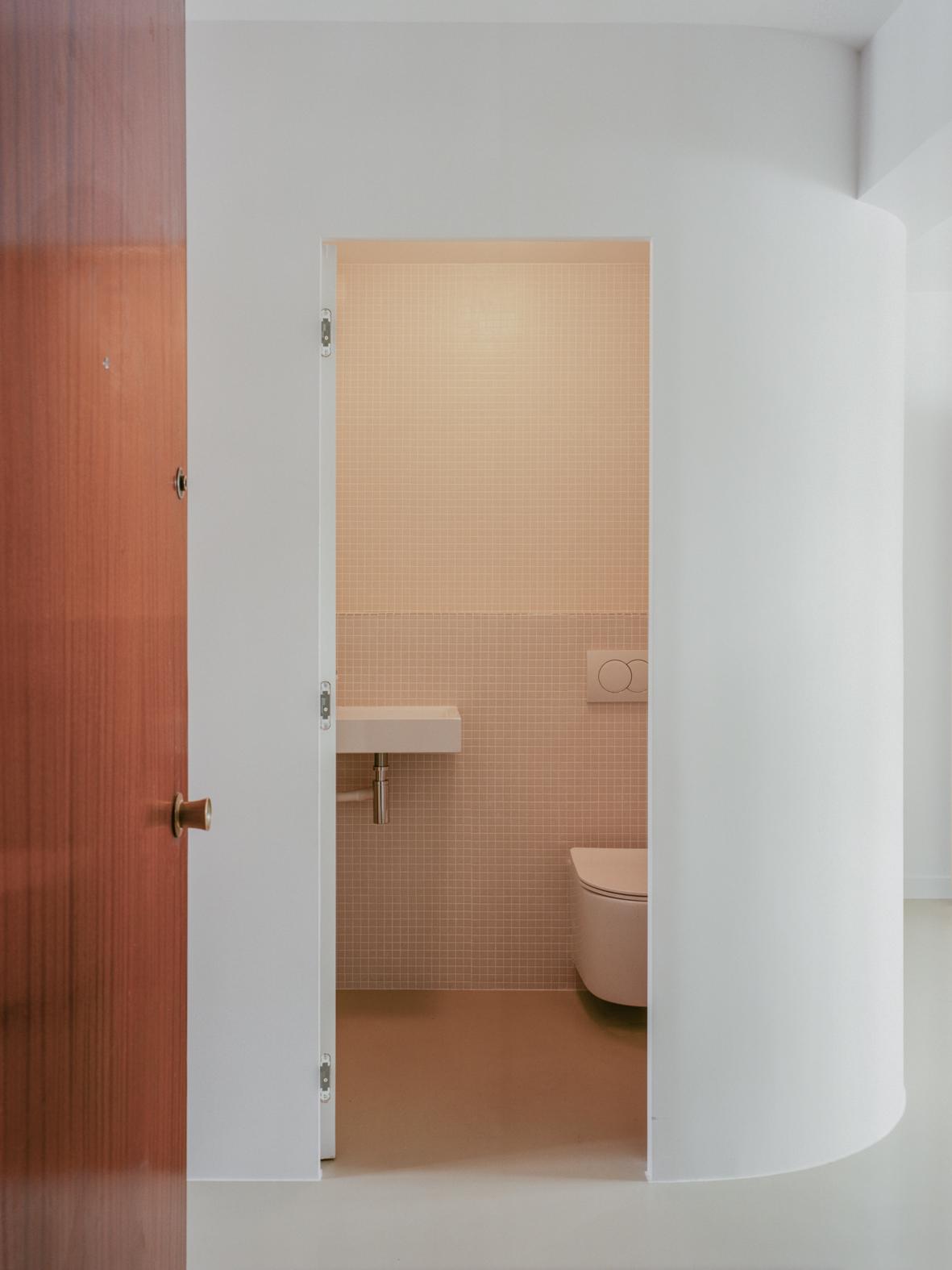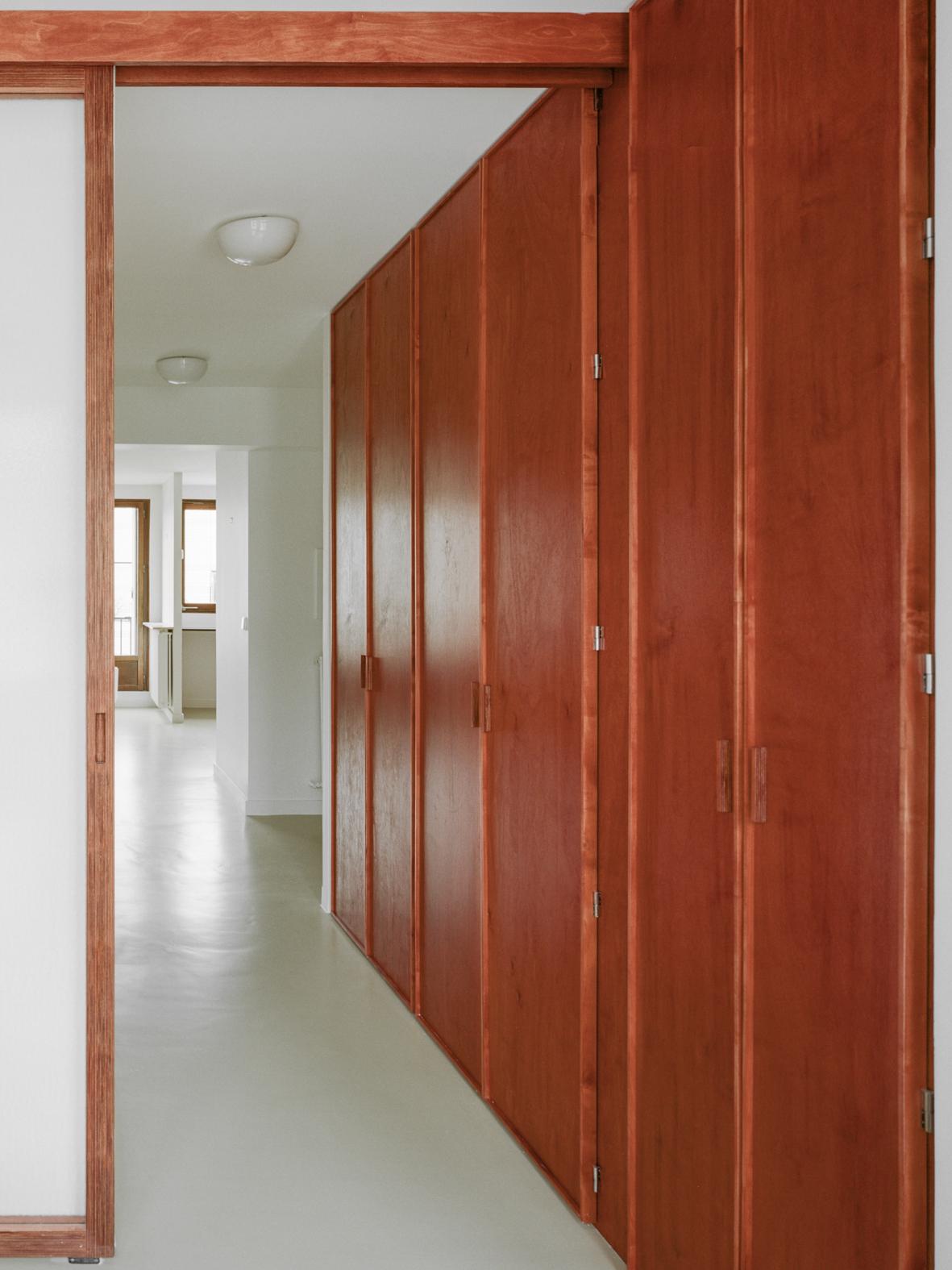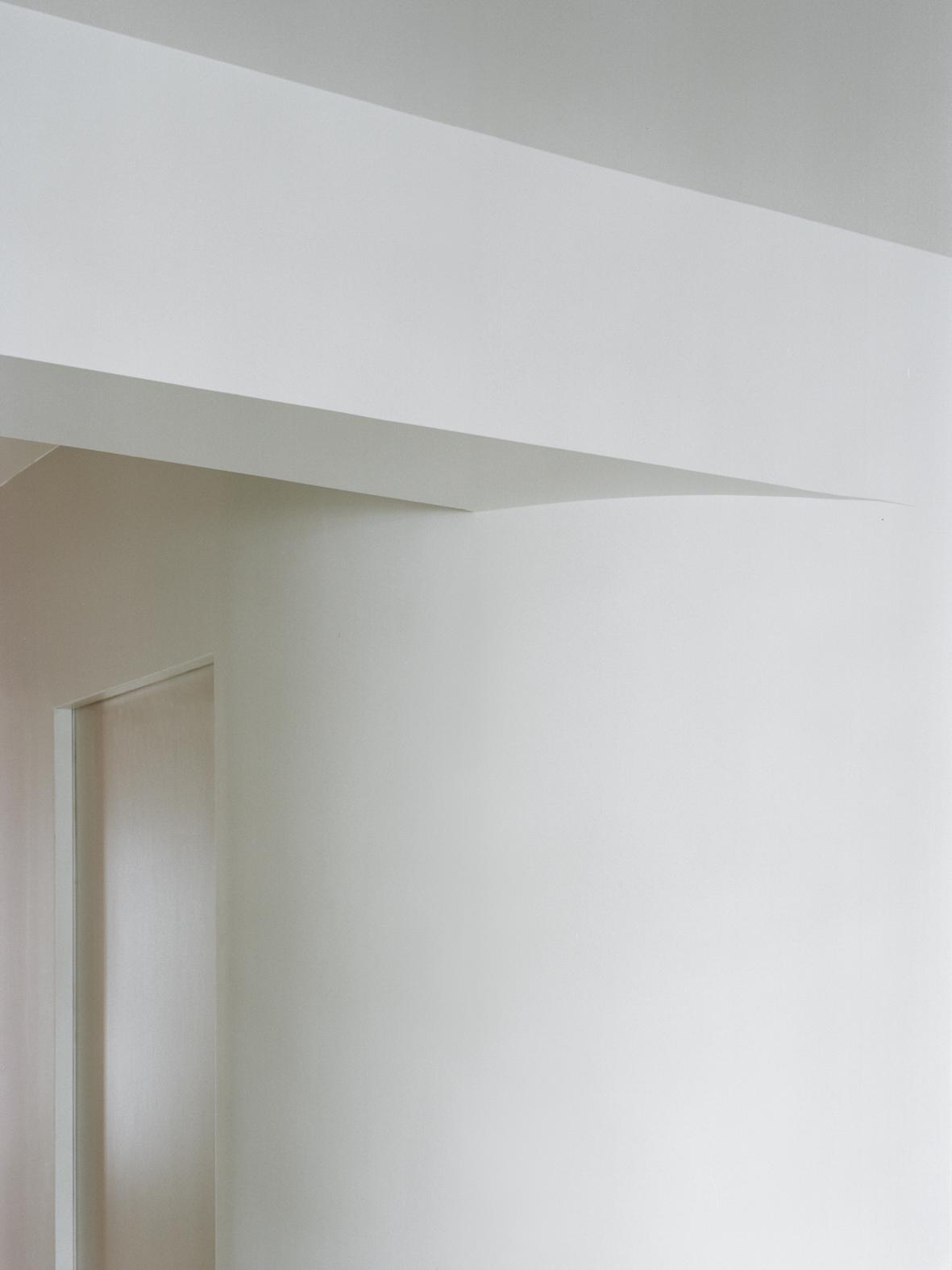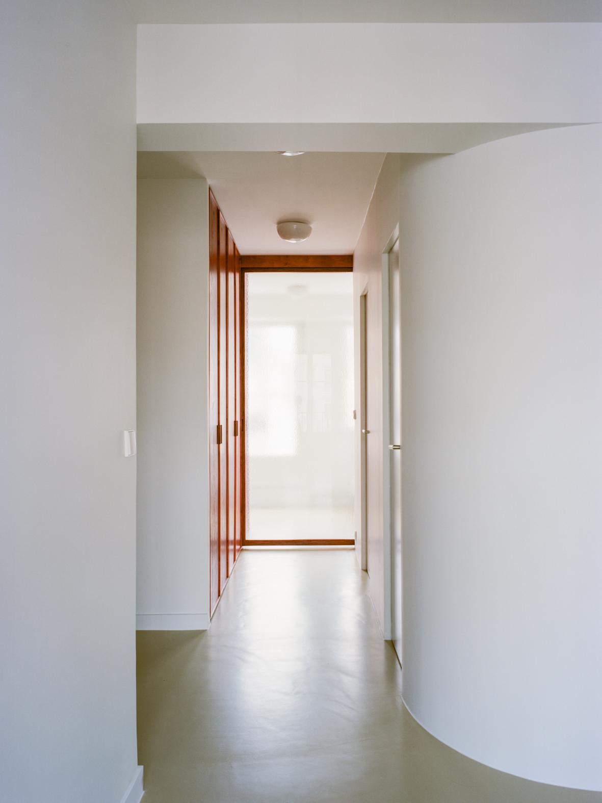 This design feature is amplified by a large mirror and concealed lighting, and the discreet configuration of drawers enhances the horizontal sweep of the furniture. Appliances and storage spaces are tucked away on the side, ensuring minimal visibility from the shared living space. The living area, in its new configuration, embraces the entrance. A subtly curved partition guides the observer’s gaze—and the room’s energy—towards the bedroom terrace. To accommodate this redesigned flow, the hallway has been broadened. A textured, hammered glass sliding door provides access to the bedroom. When left open, the hallway and its storage components seemingly flow into the bedroom, leading out onto the tranquil, shaded balcony. Once shut, the door effectively demarcates the boundary between the private and shared spaces, all the while allowing the passage of light.