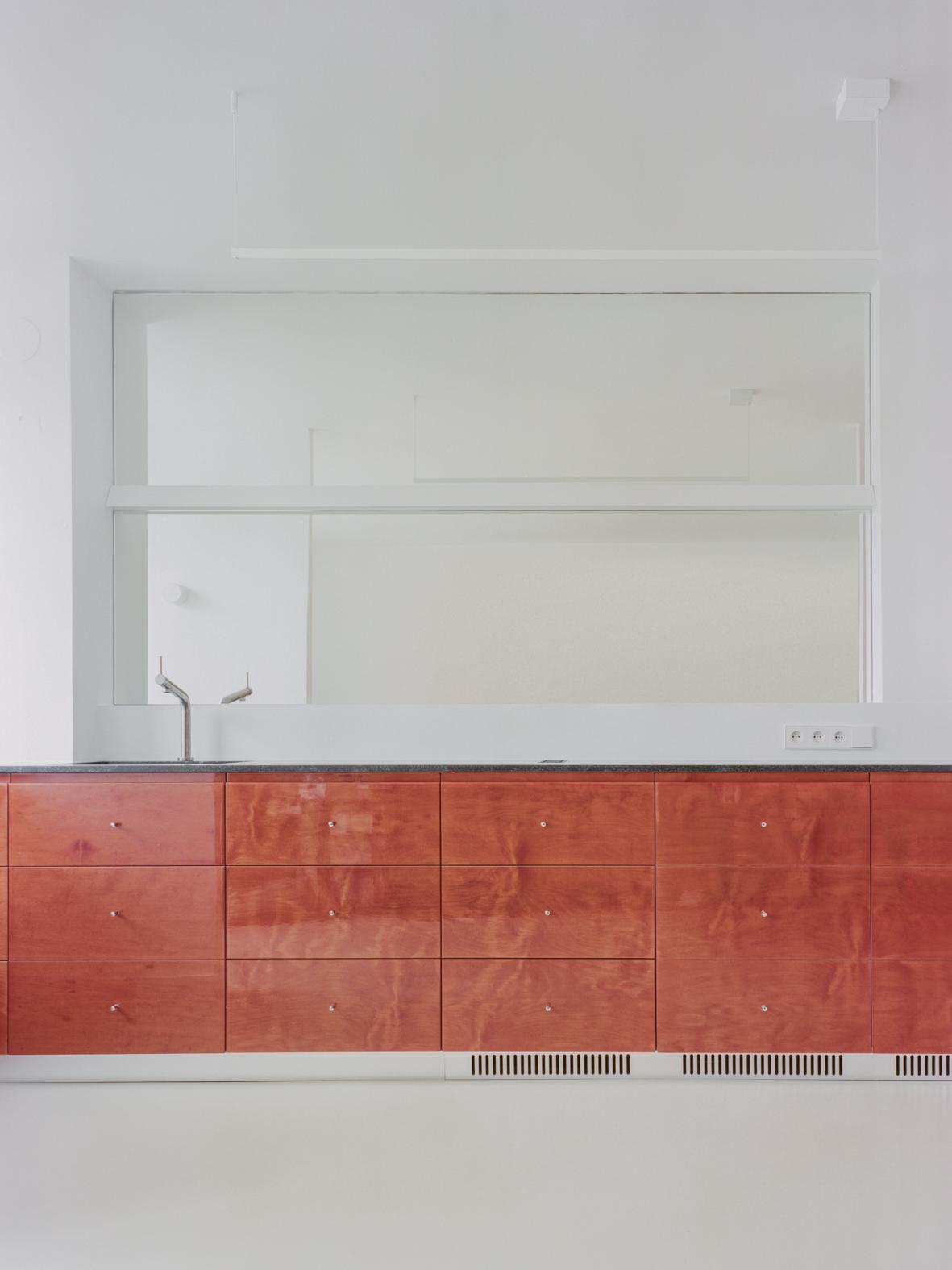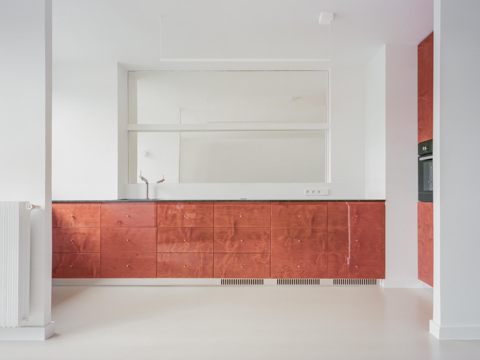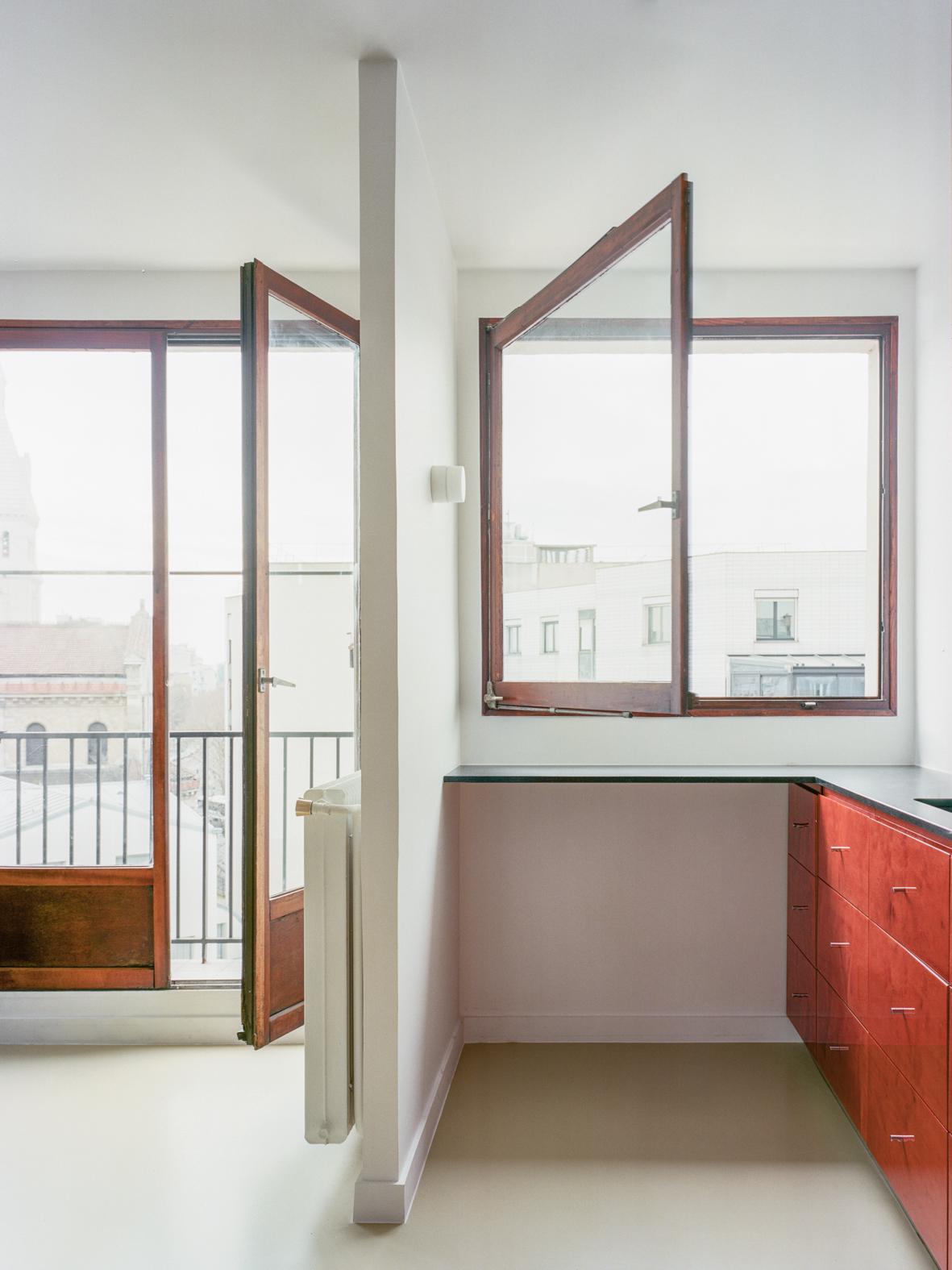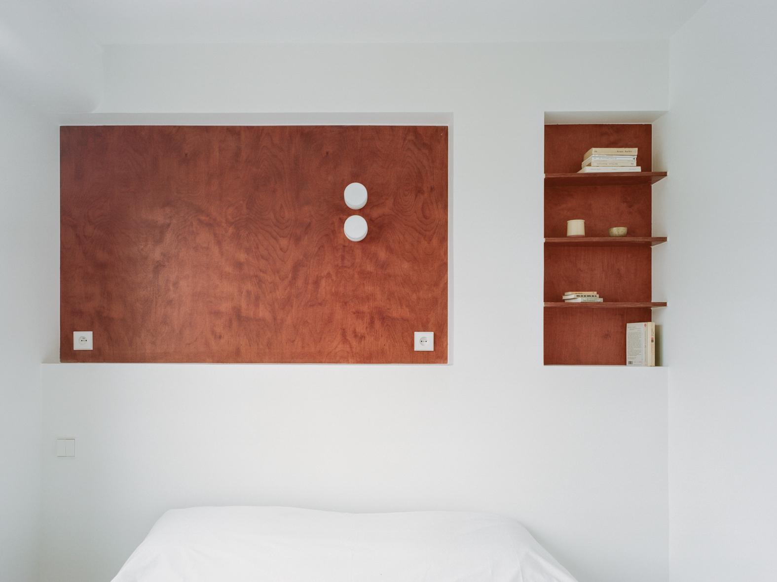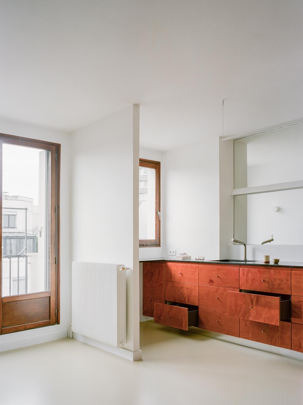 Thibaud is a minimal apartment located in Paris, France, designed by Gapante. The private quarters—comprising the bedroom and bathroom—are perched overlooking an expansive north-facing balcony, while the communal areas—a kitchen and living room—claim the southern side of the apartment. The inherent goal of the renovation project is to weave together these disparate spaces, fostering a sense of continuity and connection that extends to the bedroom’s generous terrace. To achieve this, barriers between the kitchen and living room are dismantled, facilitating a free-flowing exchange of natural light and functional areas. The kitchen takes the form of a linearly arranged, low-profile furniture piece, reminiscent of a living room sideboard.