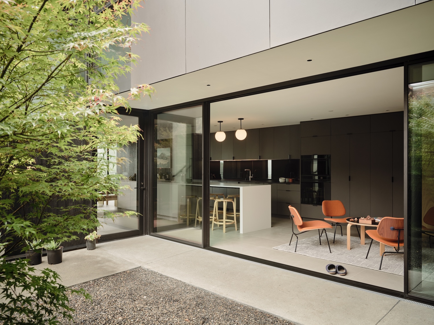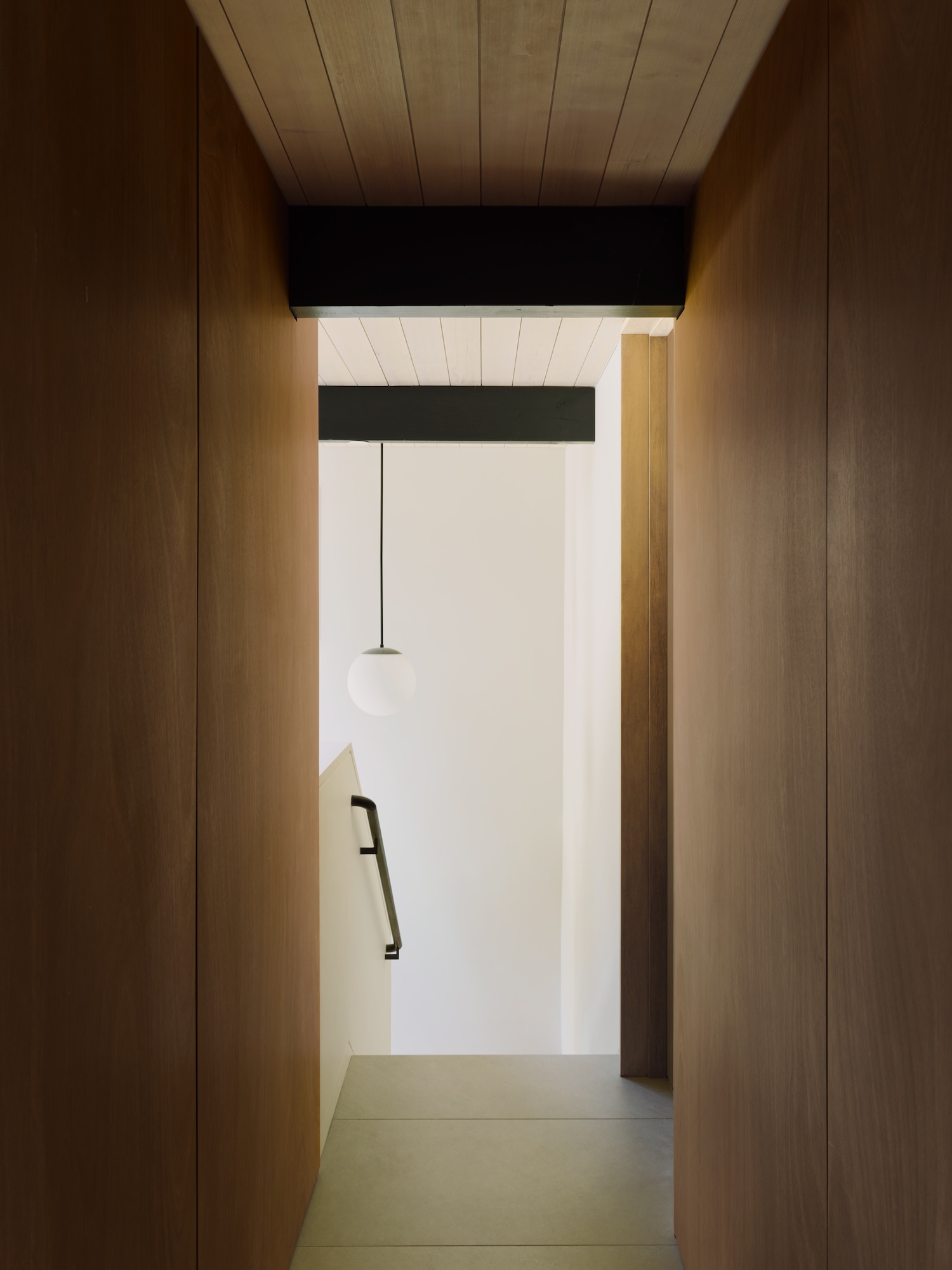 Given Eichler home location within historic district, care sets back fourth-level addition from front elevation respecting existing structure massing as viewed from street. However, upper level addition and existing building stitch together with cement board panel rainscreen when viewed from courtyard and rear yard, demonstrating how additions can maintain street character while achieving visual integration from private elevations where neighbors rather than general public constitute primary viewers.