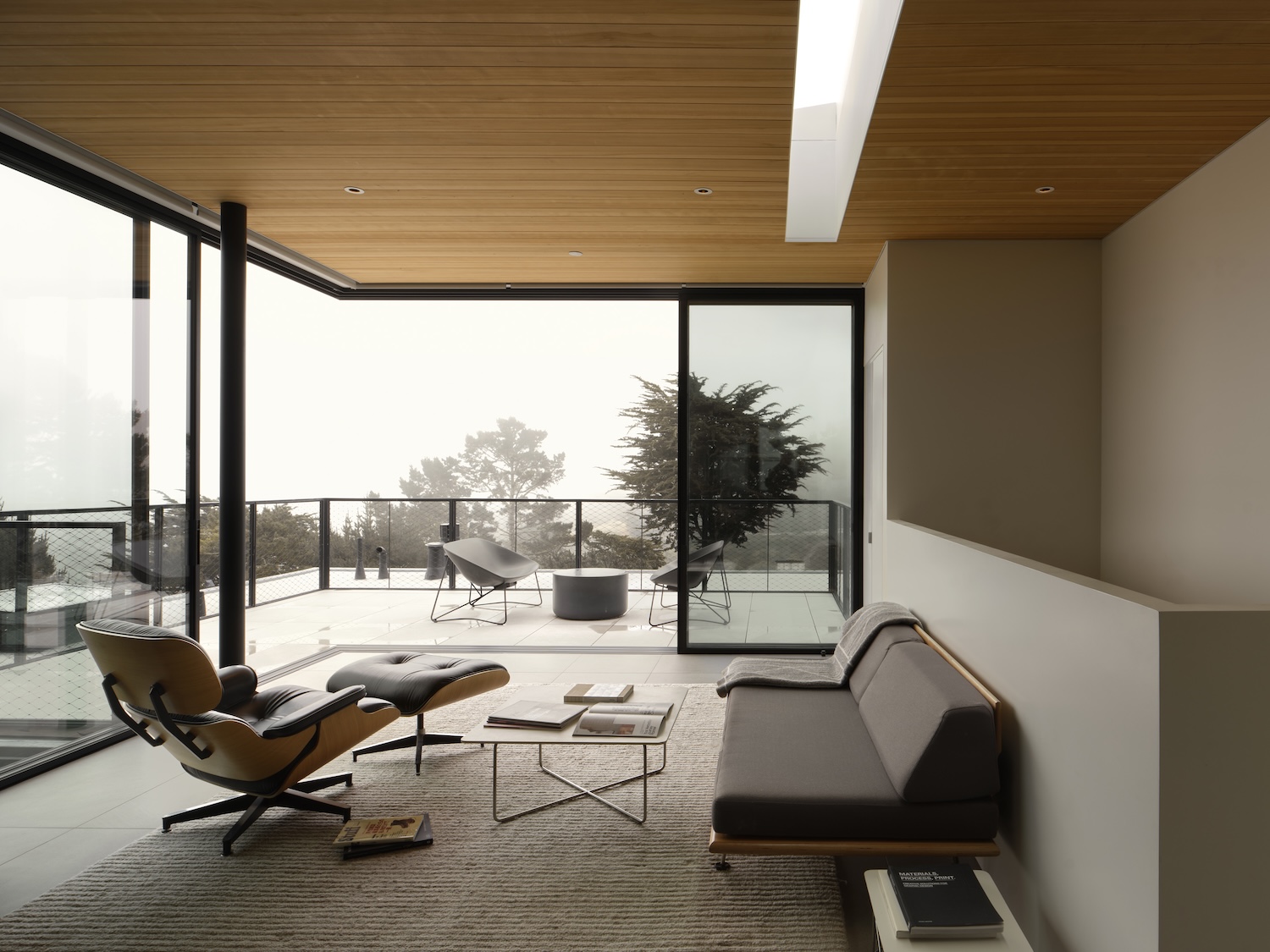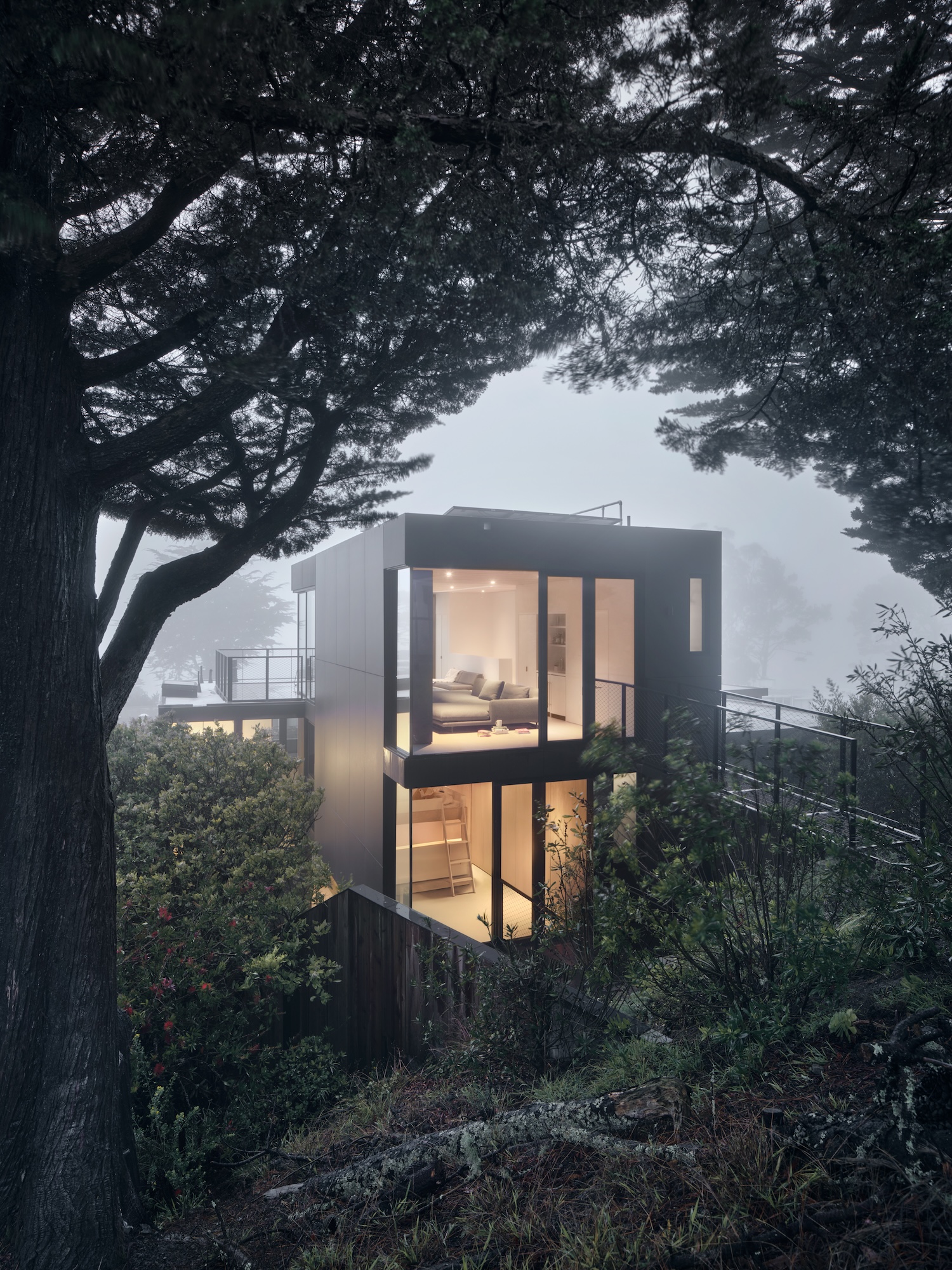 Up In The Clouds is a minimalist residence located in San Francisco, California, designed by Michael Hennessey Architecture. This fully renovated three-story 1962 Eichler residence in foggy windy Diamond Heights neighborhood includes fourth-level addition making home more functional for growing young family. Upper level contains family room, bathroom, and roof deck addressing fundamental issue where new family room location two levels above living-dining-kitchen level risked not being used daily through solution adding bridge at rear fourth level connecting directly to upslope rear yard.