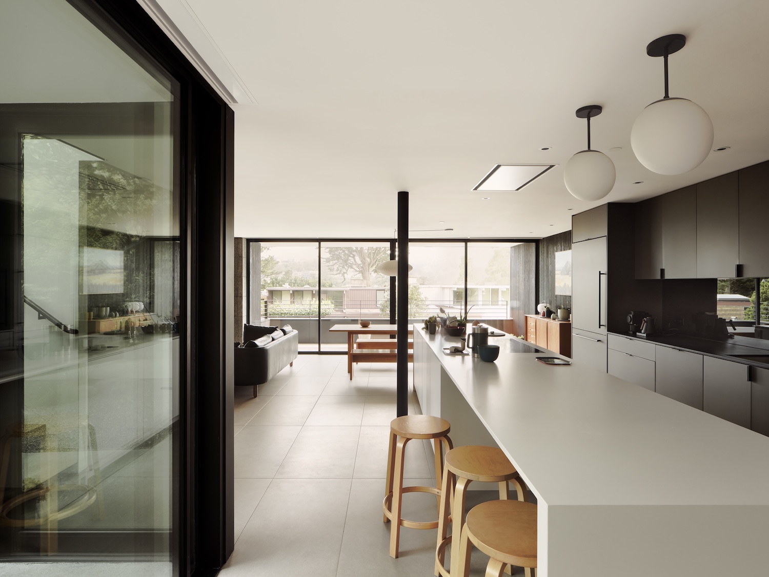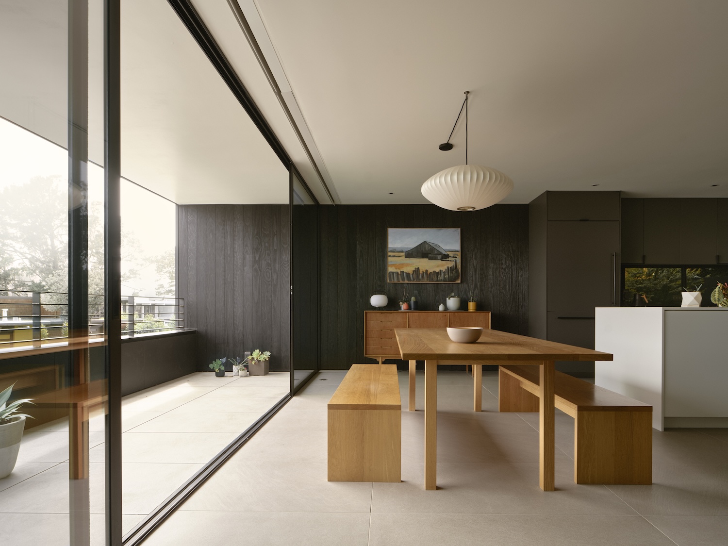 Interior kitchen opens to dining and living areas while Shou Sugi Ban exterior siding enters home making connection to custom kitchen cabinetry. Existing post-and-beam structure receives respect at bedroom level with new mahogany panels detailed minimally nodding to original wood panels within home. This material continuity demonstrates how exterior treatments can inform interior finishes creating spatial coherence where inside-outside boundaries blur through surface consistency.