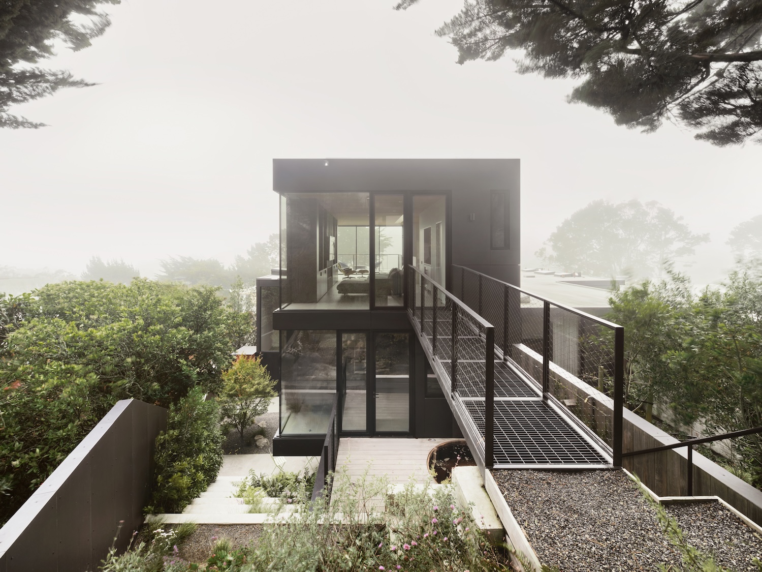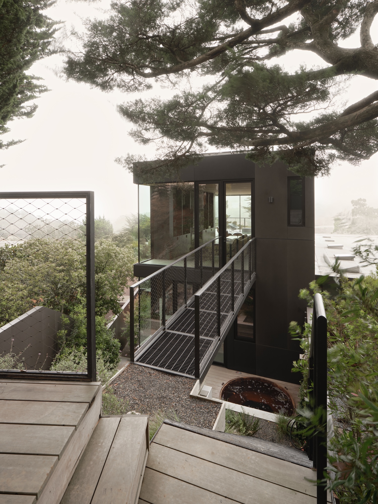 This bridge allows children running to backyard from family room down concrete terraced planters to courtyard level into kitchen activating steep hillside. The circulation strategy demonstrates how topographic challenges can become design opportunities where grade changes enable direct connections between non-adjacent building levels, transforming what might appear as problematic site condition into functional advantage supporting active family lifestyle requiring easy indoor-outdoor movement.