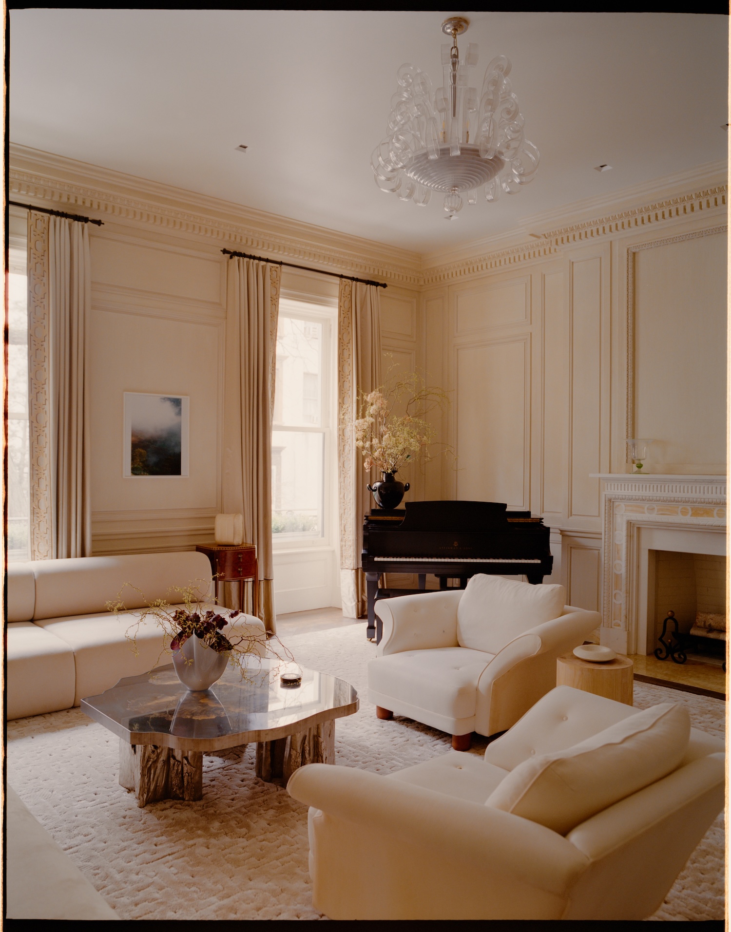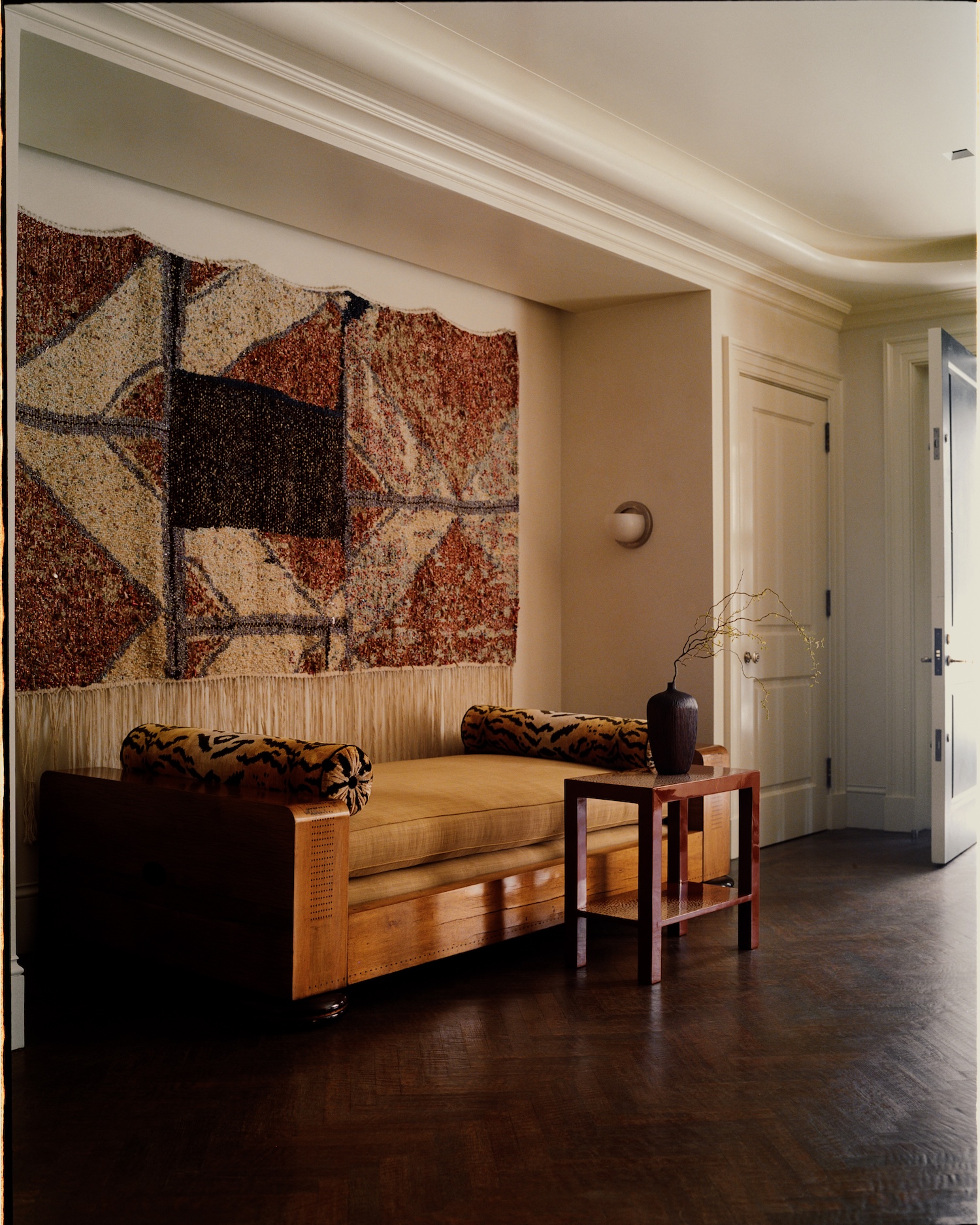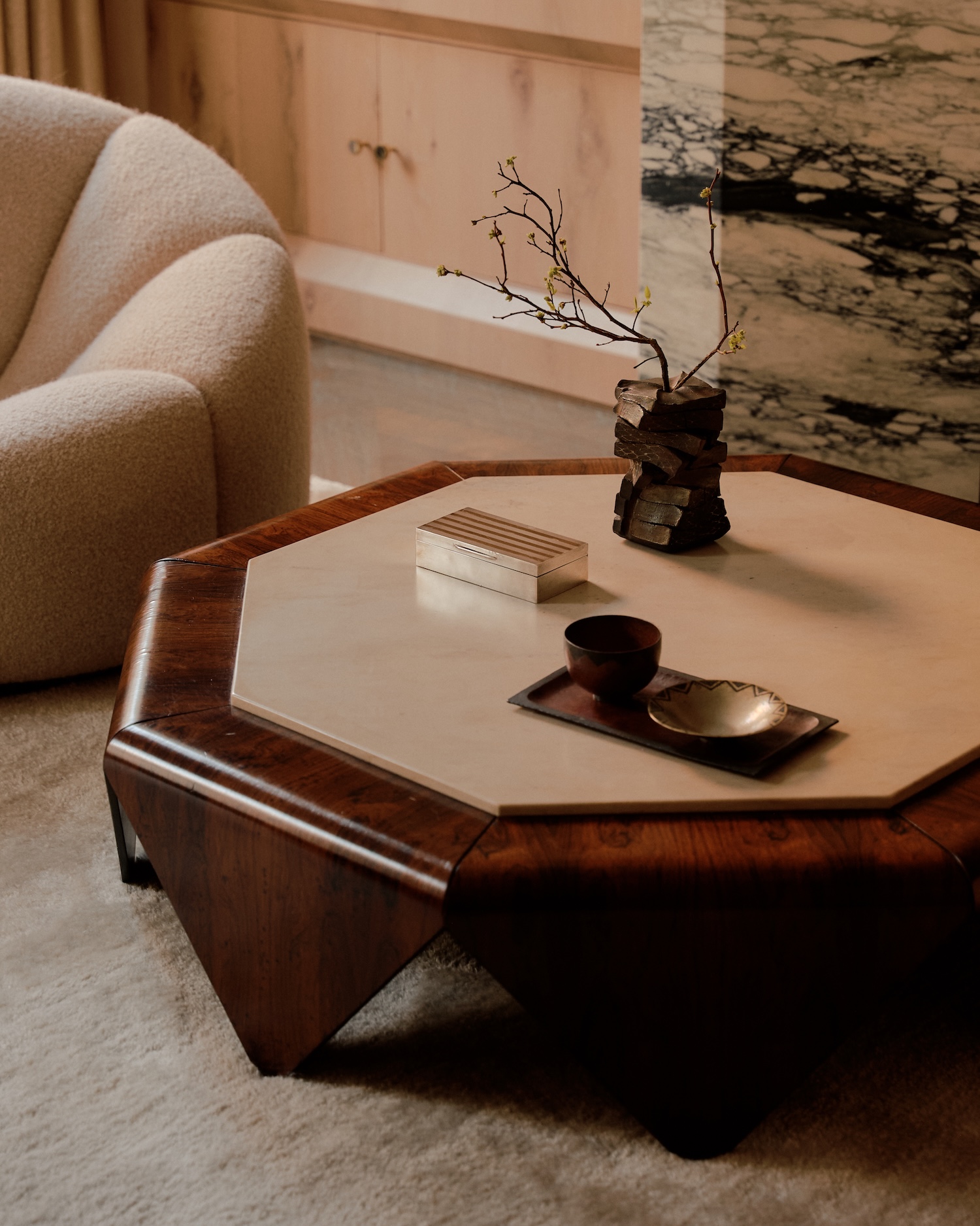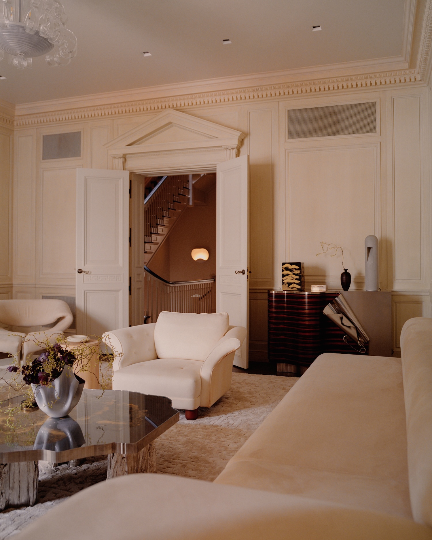 The clients’ collection reveals this same philosophical thread. Emile-Jacques Ruhlmann’s Art Deco precision sits alongside Maria Pergay’s sculptural metal work, while Rick Owens’ brutalist furniture finds kinship with Jorge Zalszupin’s Brazilian modernism. Pierre Paulin’s organic forms flow into Ayala Serfaty’s ethereal lighting, creating what Johansen calls “a cabinet of curiosities for the material age.”