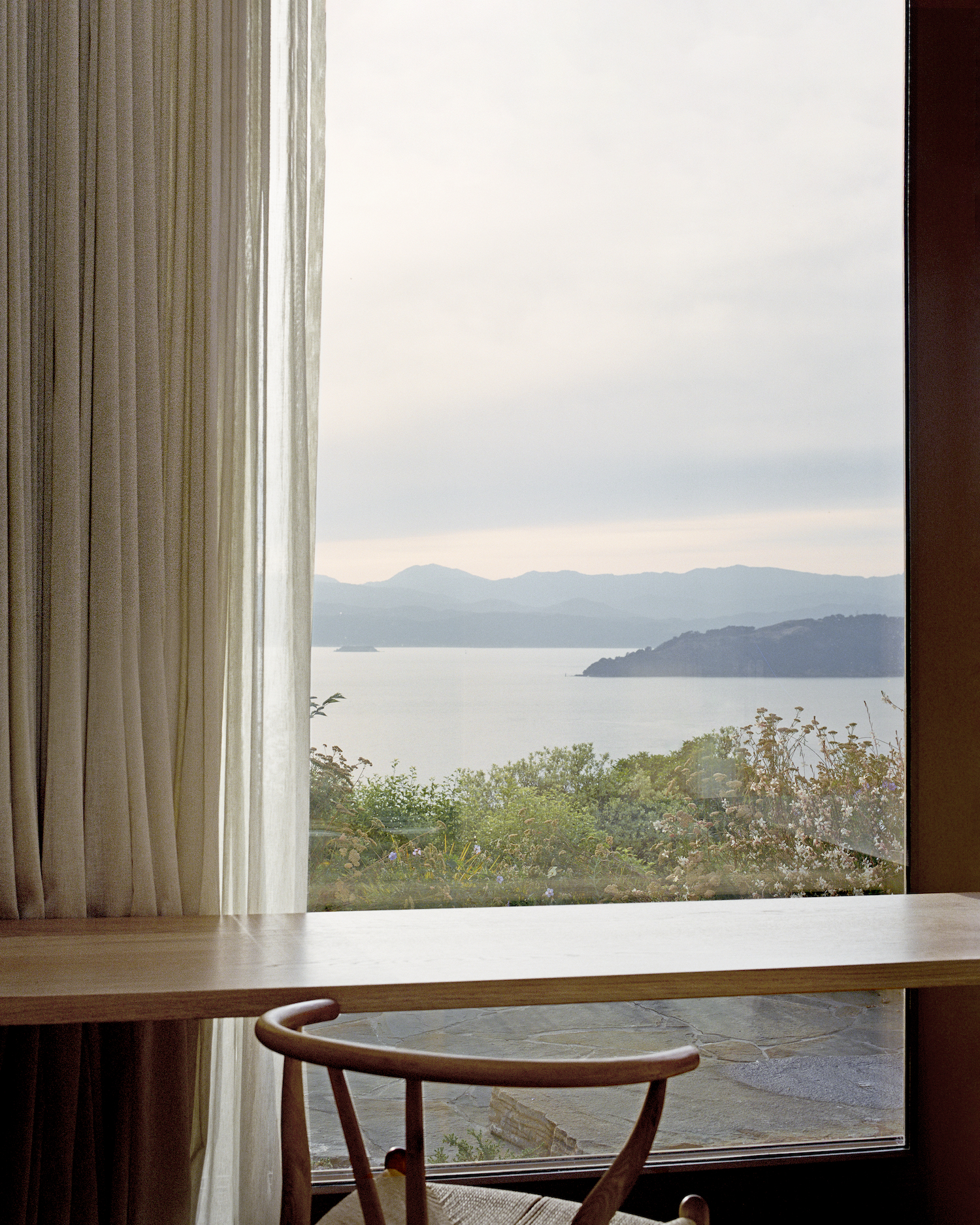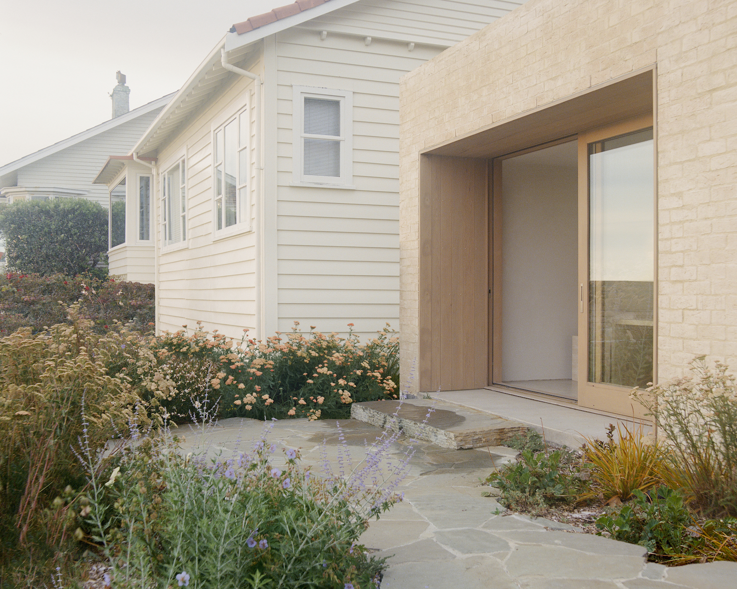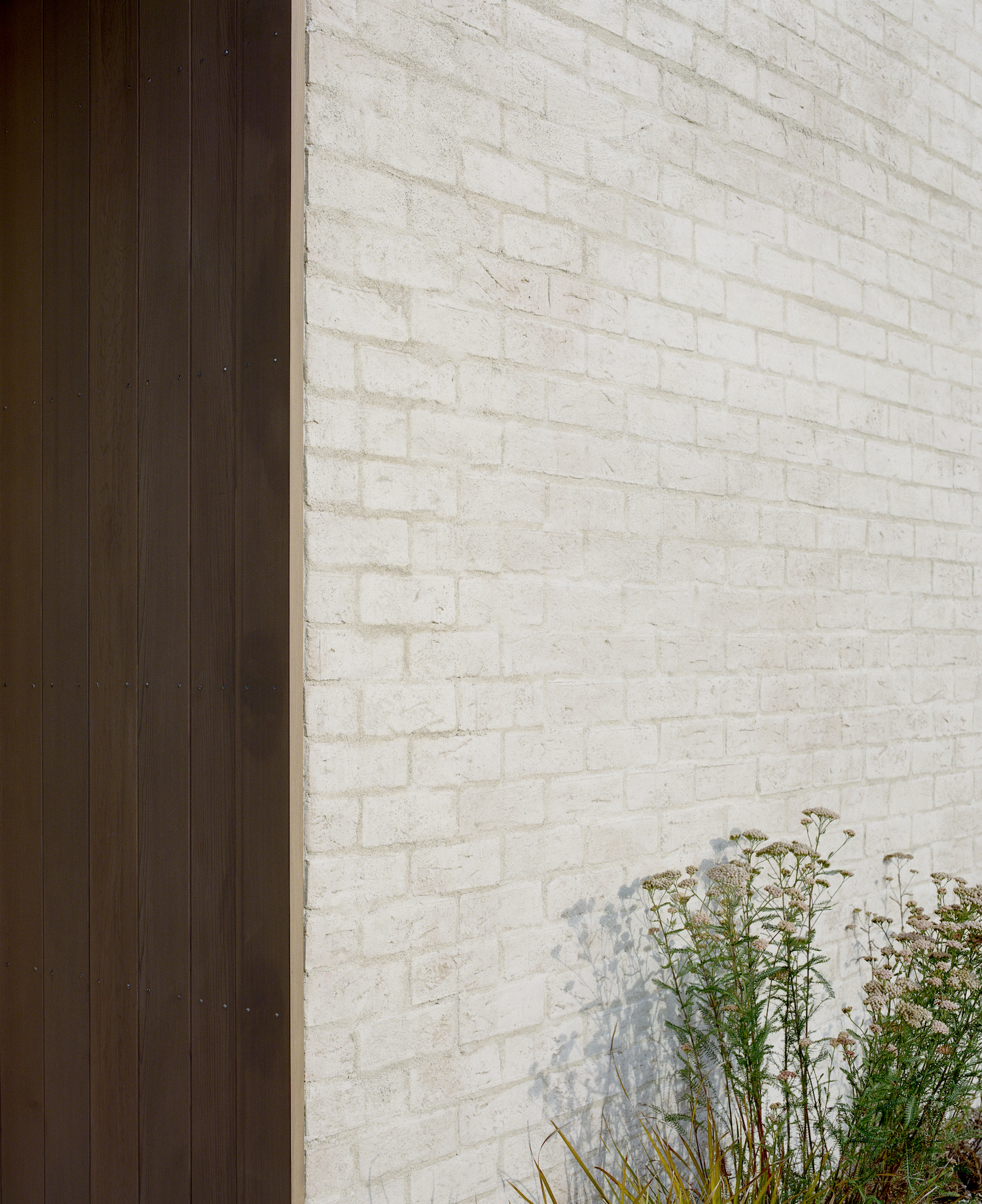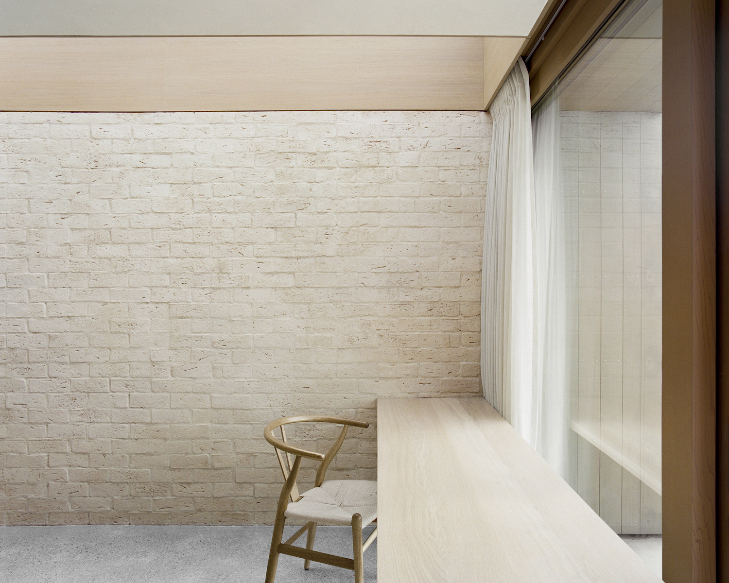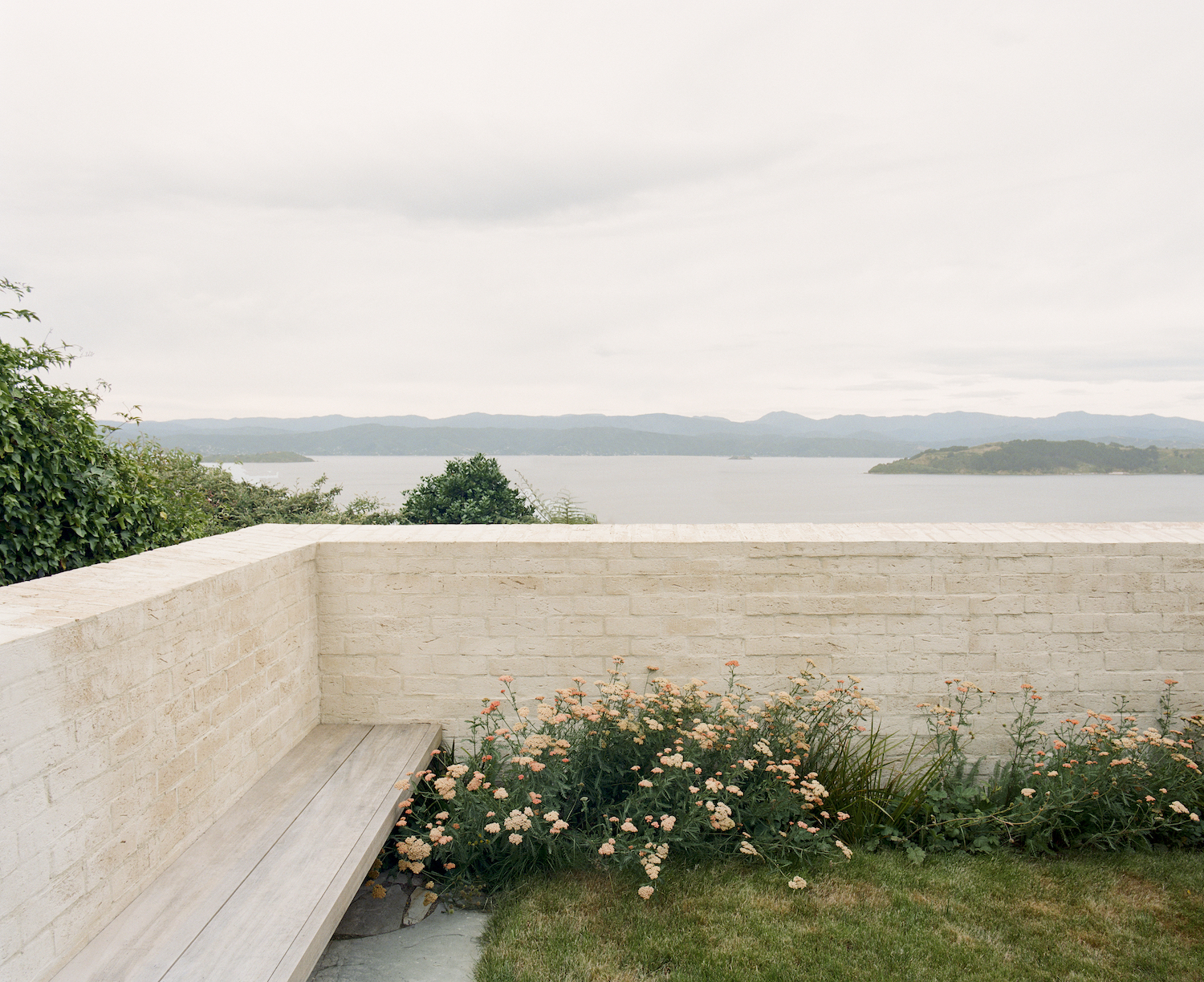 The east-facing façade maximizes the harbor views with extensive glazing. A strategically placed skylight on the northern wall introduces soft, natural light. The design thoughtfully responds to Wellington’s varying weather: offering a cozy shelter during windy days and an open, airy space connecting to the garden on sunny days. The exterior of the extension mirrors the original home’s double-brick construction, using lime-covered bricks for a low-maintenance yet aesthetically pleasing appearance. Custom mortar work, developed in collaboration with bricklayers, and a streamlined brick parapet enhance the building’s unified look. The roof, covered with a membrane and planted vegetation, and the engineered masonry walls, provide necessary support and retain the structure.