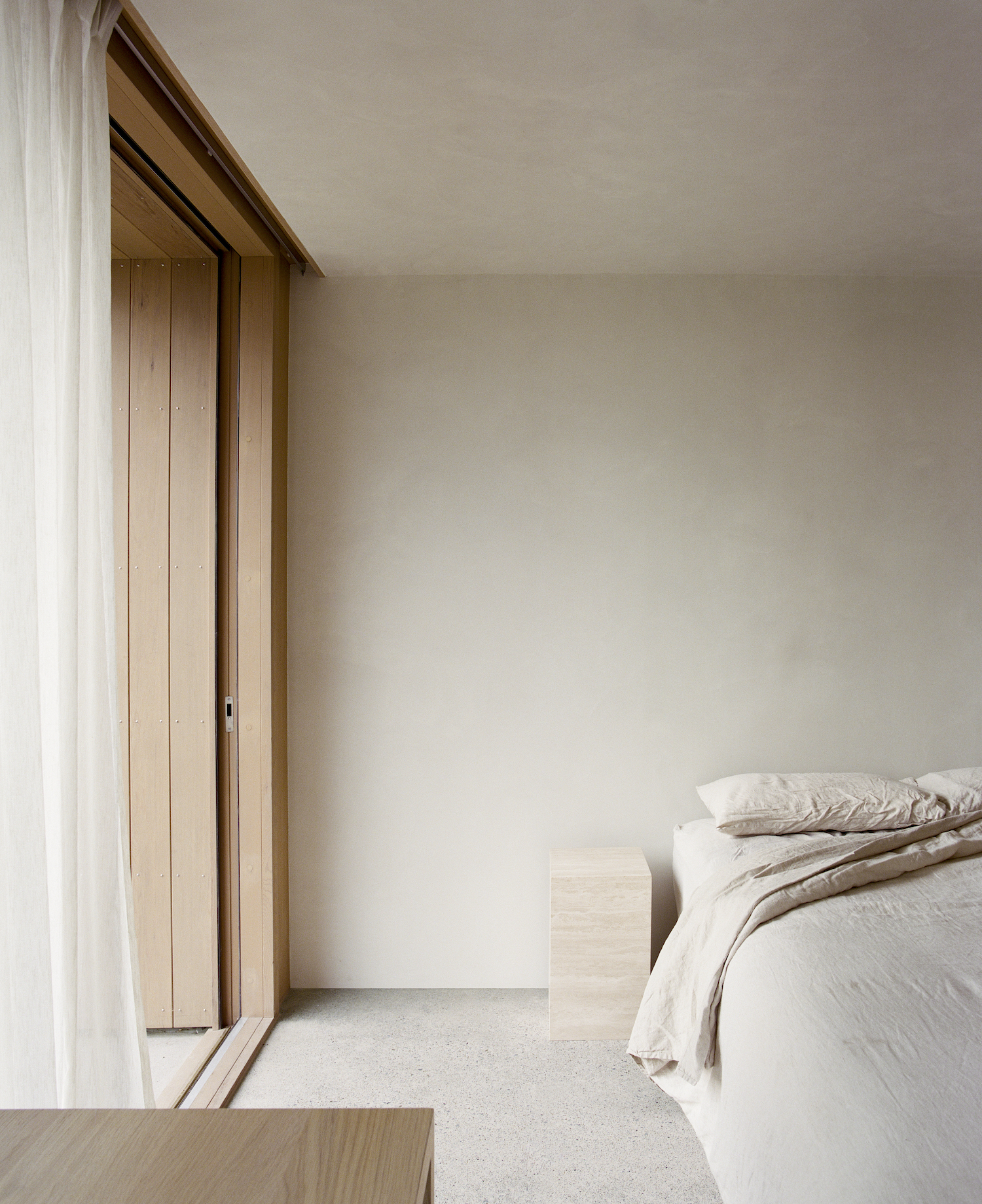 The interior features honed limestone tiles in the ensuite, harmonizing with the studio’s polished plaster. Light oak finishes and soft curtains complement the overall material palette. Emphasizing durability and quality, the chosen materials are designed to age gracefully, aligning with the client’s preferences. In terms of sustainability, the project predominantly utilizes natural materials like brick, timber, plaster, and stone. Enhanced insulation beneath the slab, in the walls, and the roof, along with strategic window placement, improve the home’s thermal efficiency. The green roof not only adds aesthetic value but also contributes to the site’s ecological footprint.