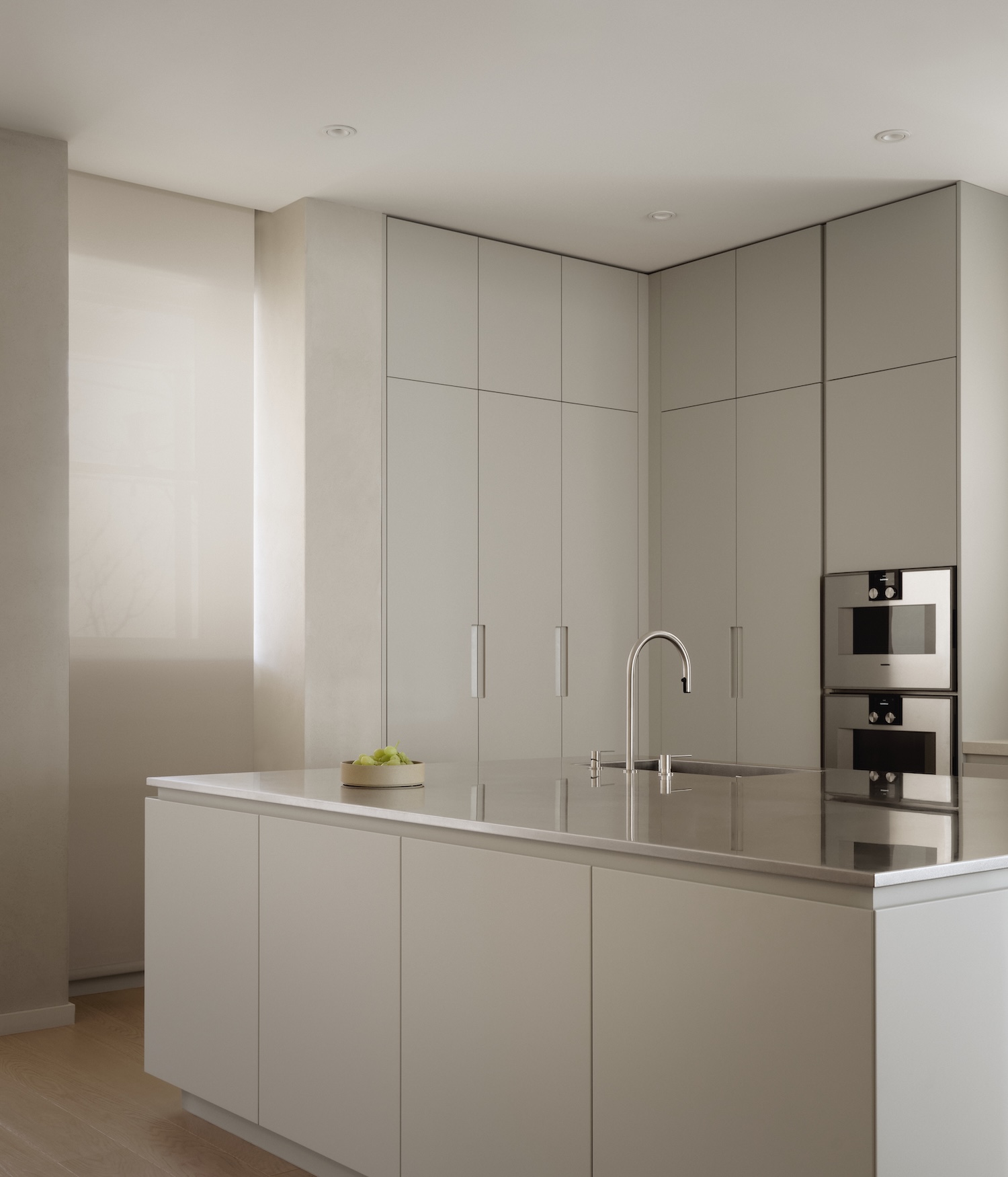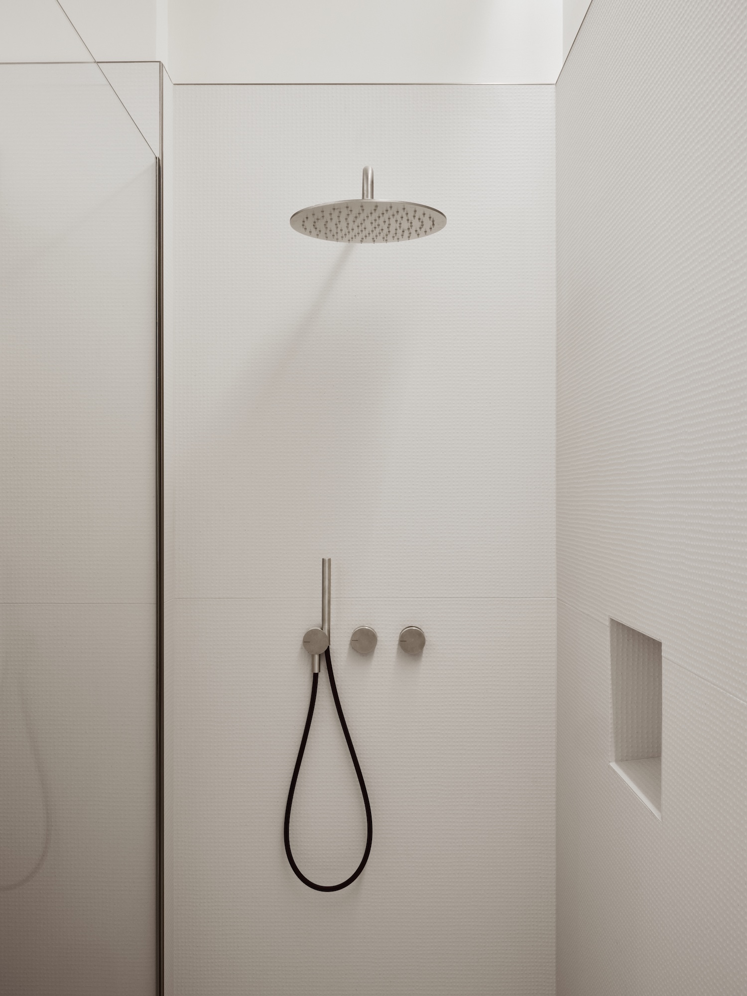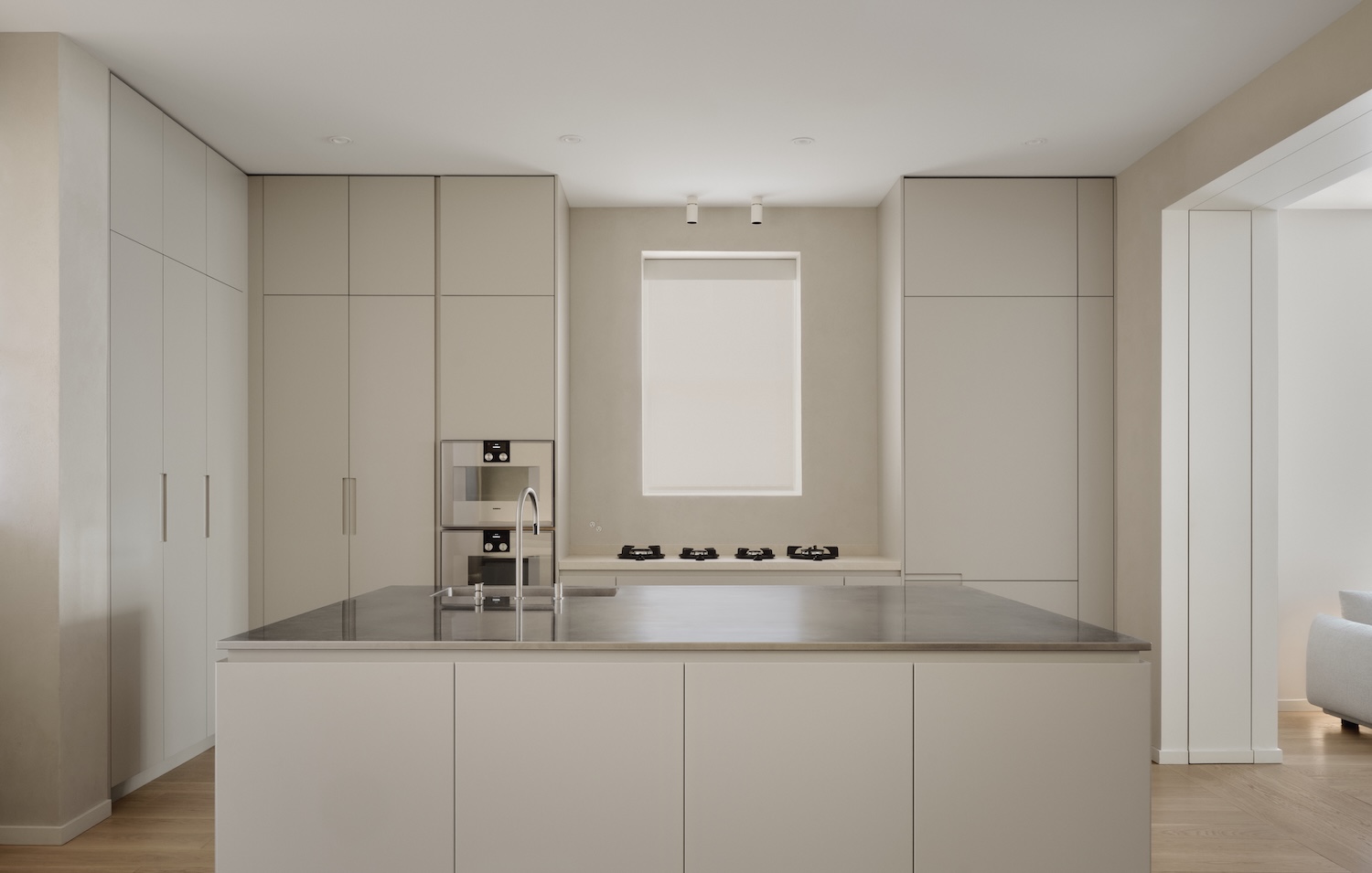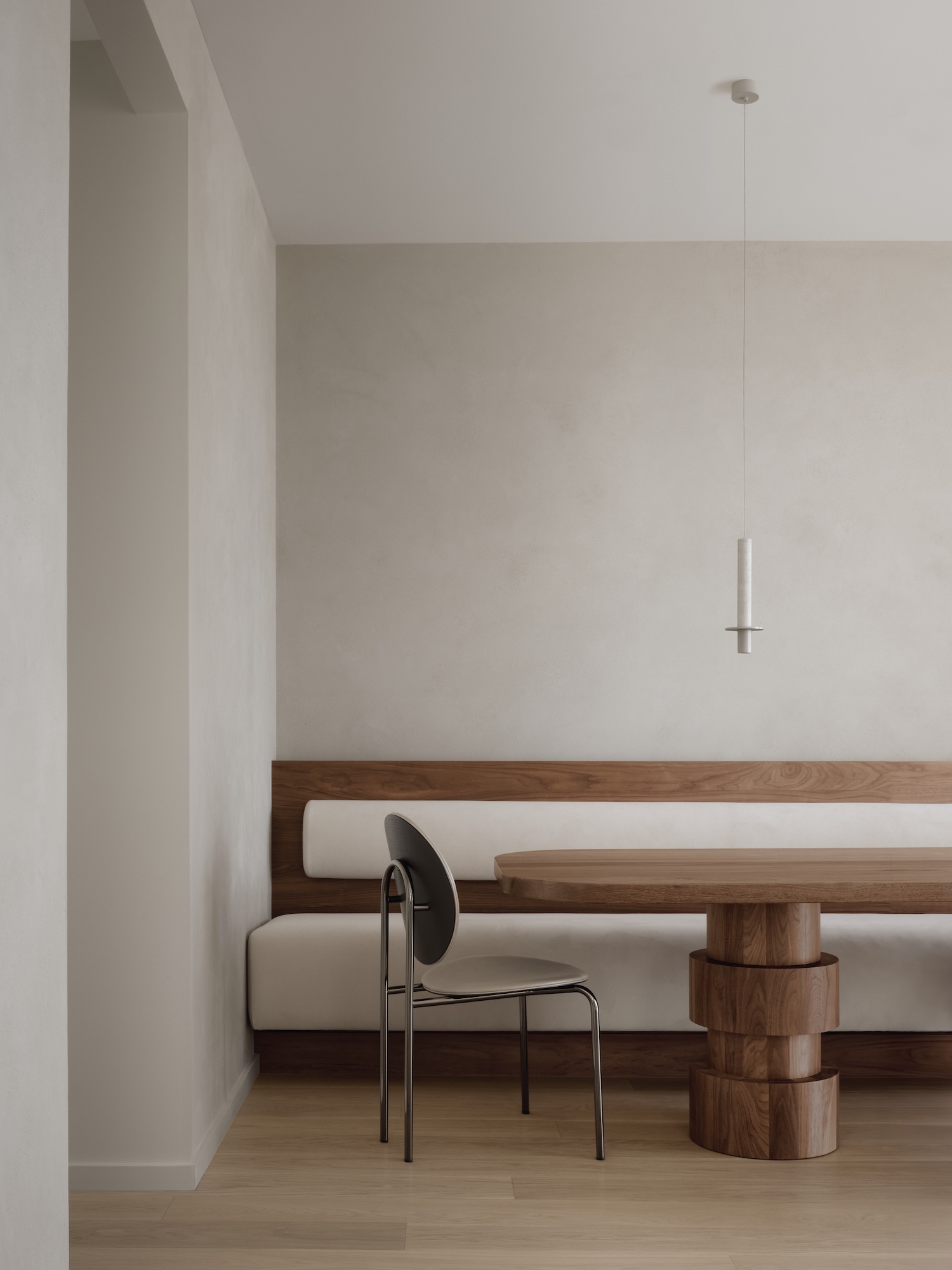The second-floor office entrance, carved through existing walls, creates what architectural theorist Juhani Pallasmaa might call a “horizon of anticipation” – a moment of architectural poetry that transforms a simple opening into an invitation for discovery. Similarly, the master bedroom’s floor-to-ceiling entrance establishes a clear spatial hierarchy while maintaining privacy through careful choreography of sight lines. The material palette speaks to both durability and sensory richness. Plaster walls and walnut furniture in the kitchen create a warm, tactile environment that feels both contemporary and timeless. The use of micro cement and low-relief tile in the bathrooms demonstrates an understanding of how material scale can create visual interest while maintaining cohesion. These choices reflect what one terms “material intelligence” – the thoughtful application of materials that considers both their practical and experiential qualities.