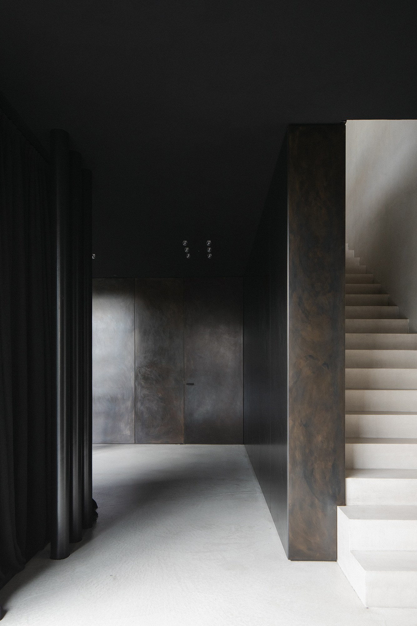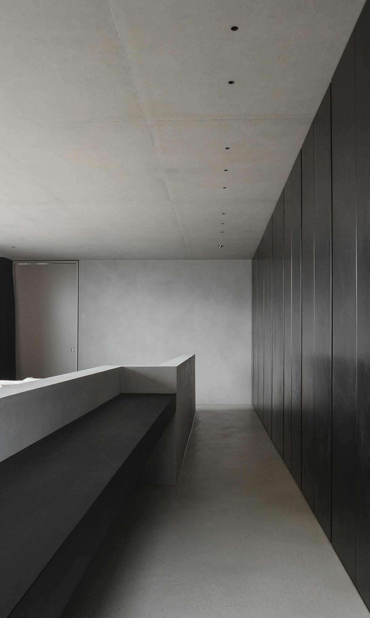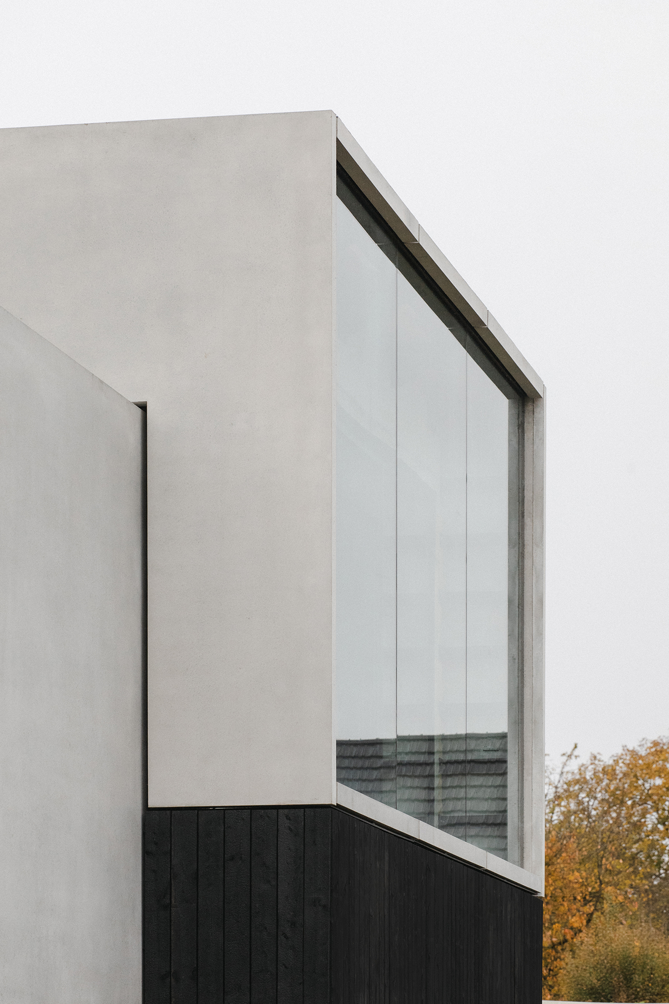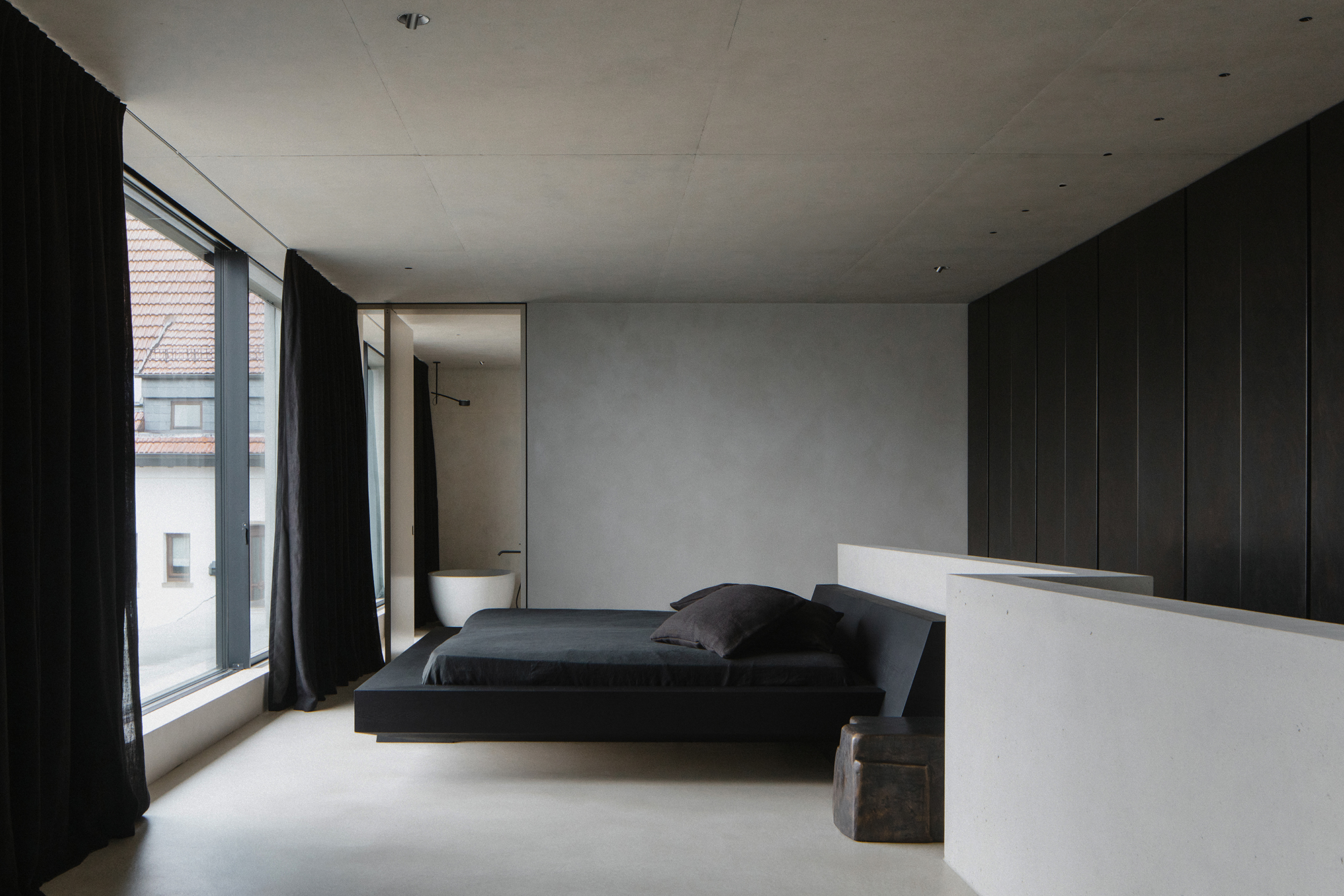 Villa Mahler is a minimal home located in Stuttgart, Germany, designed by Philipp Architekten. The L-shaped structure merges architecture and interior design into a cohesive and harmonious whole, offering a space that is both expressive and restrained. At its core is a five-meter-high living wing, where the kitchen, dining, and living areas come together in a single open space. Natural light streams through floor-to-ceiling sliding windows and a fully glazed façade, casting dynamic patterns of light and shadow that change with the time of day and season. The raw material palette of concrete, steel, and timber gives the space a powerful yet understated character.