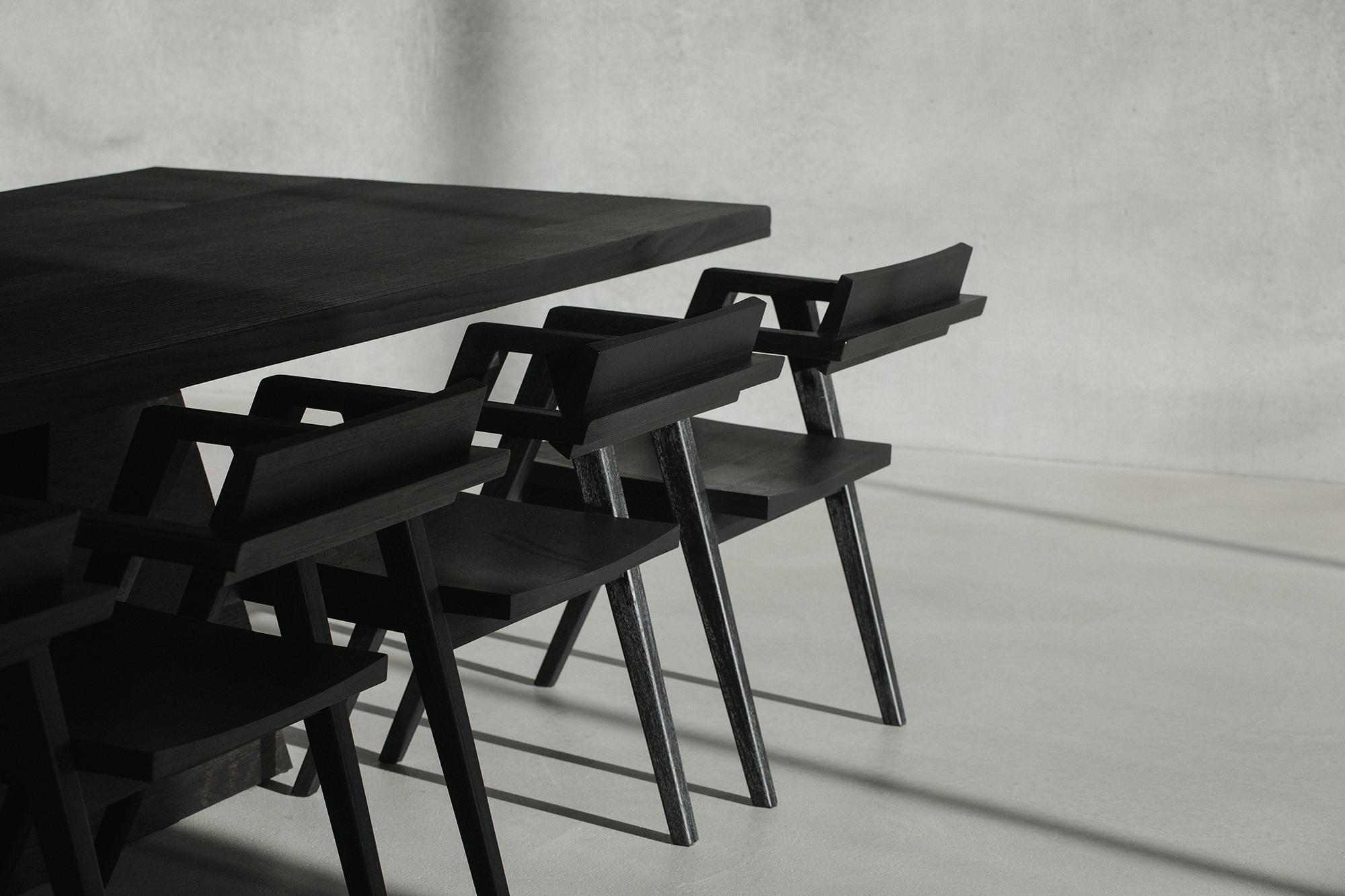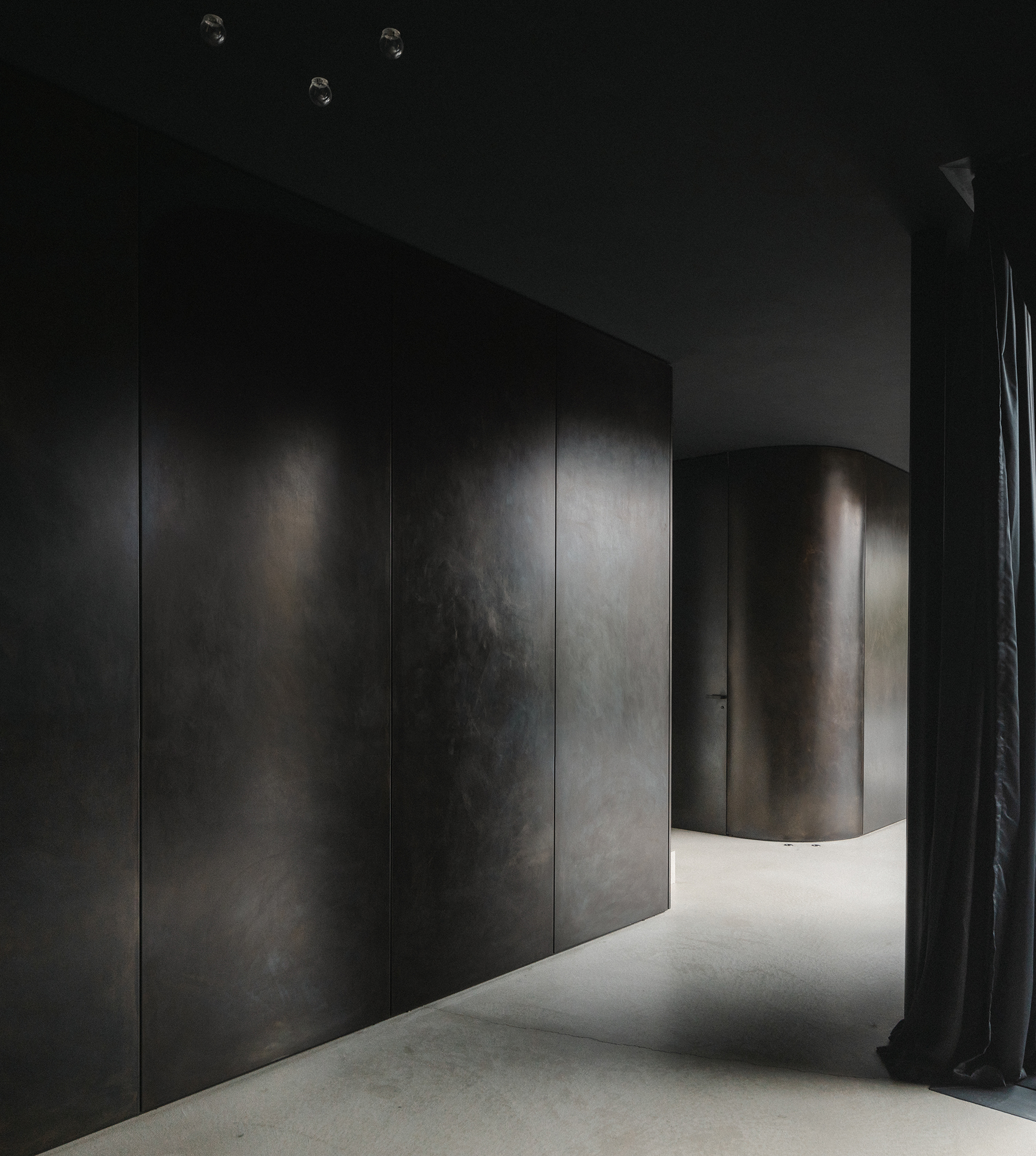 Bedrooms feature custom-designed scorched oak bedframes and solid bronze bedside tables, paired with floor-to-ceiling windows that open onto the garden. The exterior façade is defined by its interplay of materials. Facing the street, the villa presents an opaque surface of charred wood slats and exposed concrete, offering privacy while subtly integrating into its surroundings. Toward the garden, the design opens with panoramic windows and sliding doors, creating a fluid transition between inside and outside.