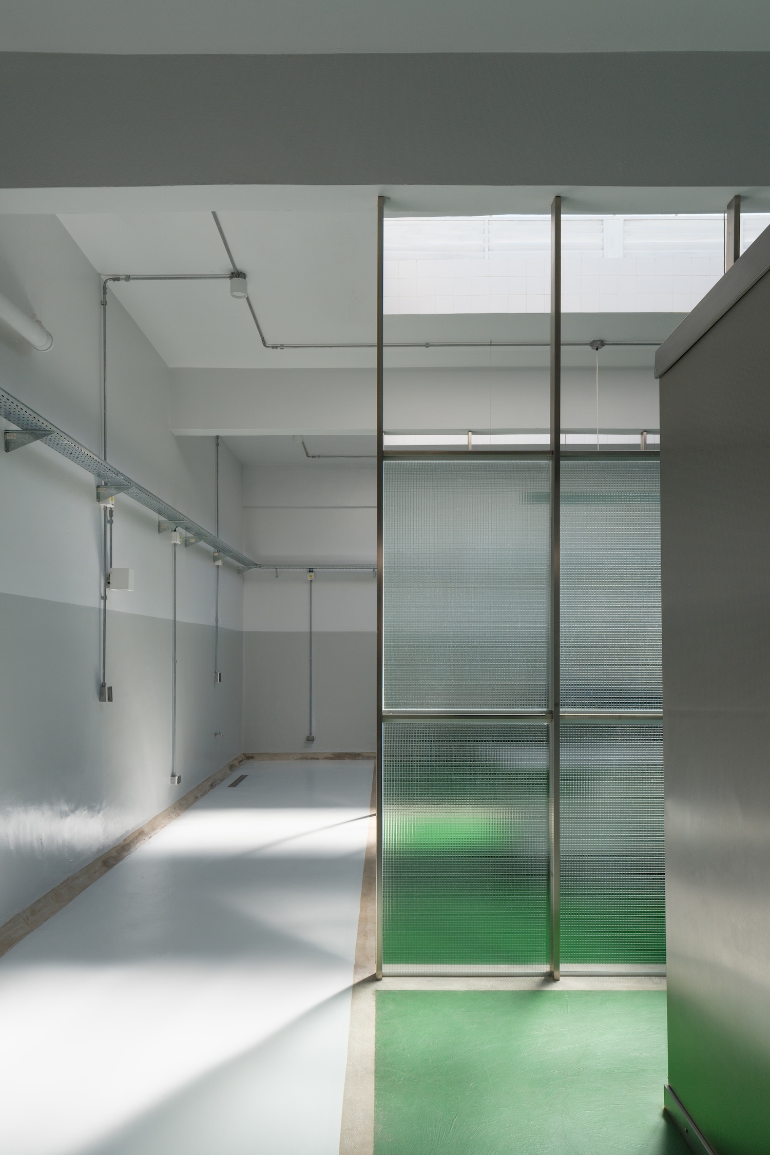 The spatial organization reveals a sophisticated understanding of workflow dynamics. The rigorous zoning system, complete with clear signposting, transforms the mundane logistics of fish retail into something approaching industrial choreography. The overhead skylights filter natural light softly, creating an atmosphere that balances the clinical requirements of food safety with the human need for connection to natural cycles – a consideration that recalls the great market halls of the 19th century, where iron and glass created soaring spaces that celebrated both commerce and craftsmanship.