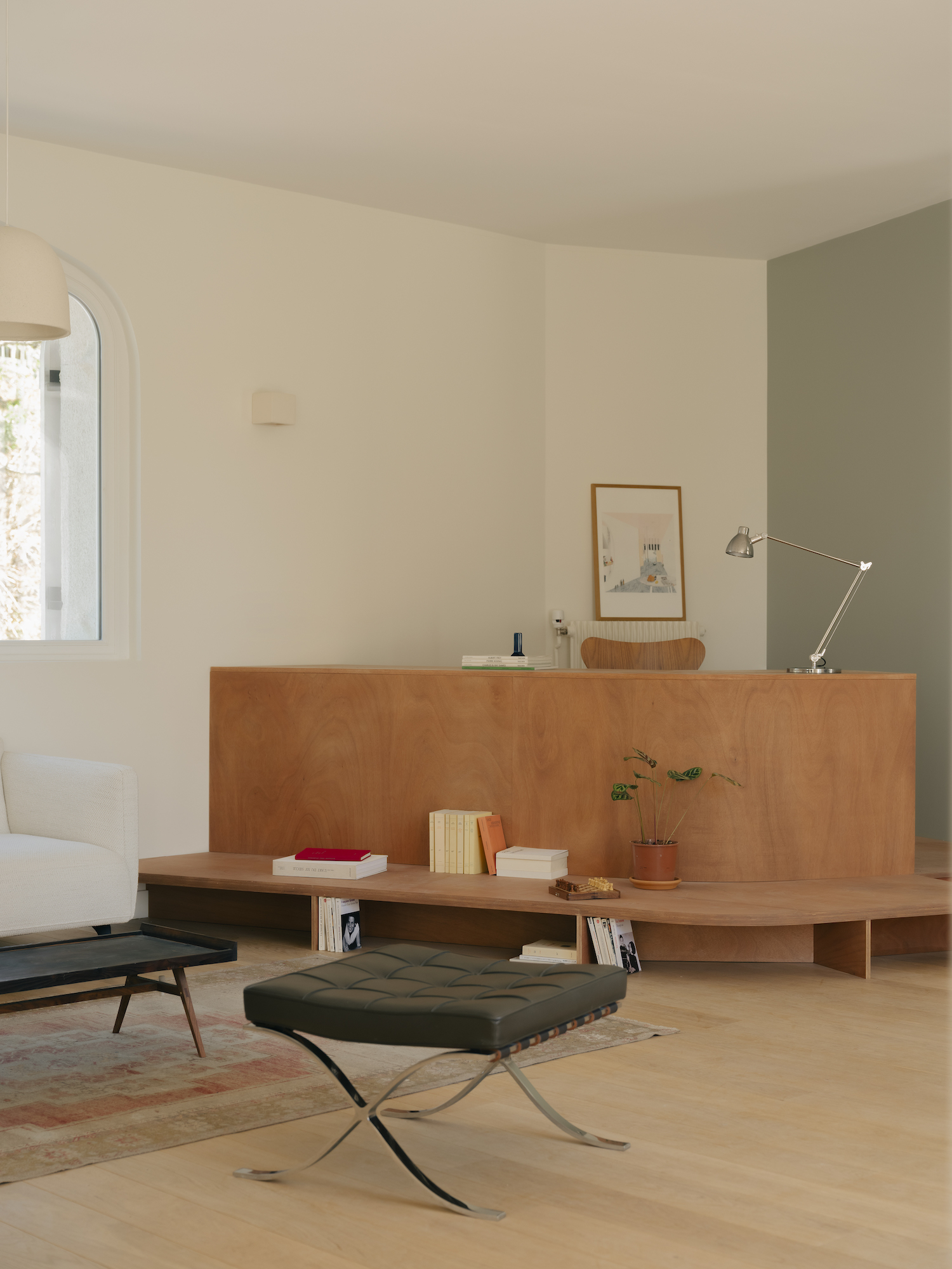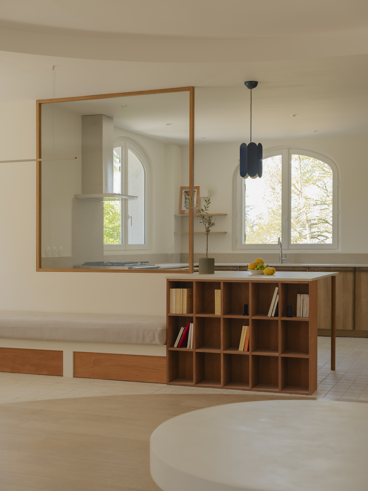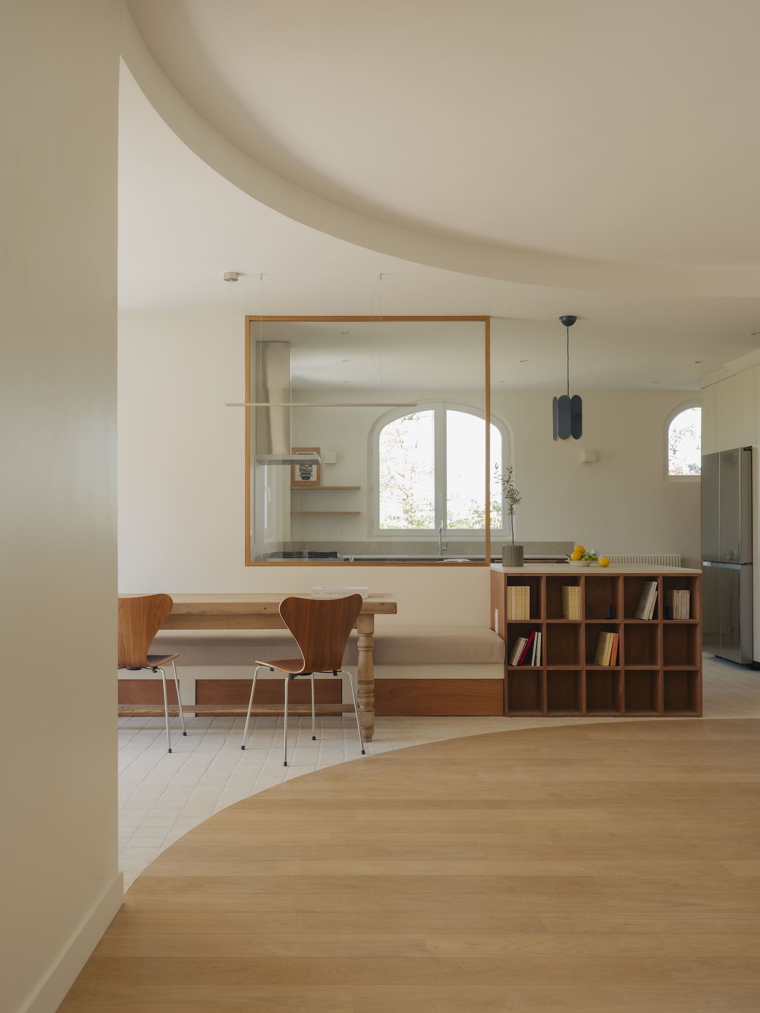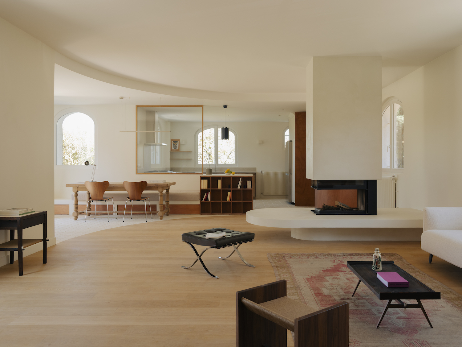 Central to the intervention is a reworking of the layout to open the main living spaces to natural light on three sides. The plan is subtly restructured to avoid enclosure, allowing different functions to emerge without the need for rigid partitions. Inspired by the curved geometry of the original bay windows, this language is carried throughout the house, introducing soft, continuous transitions between spaces and reinforcing a sense of visual cohesion.